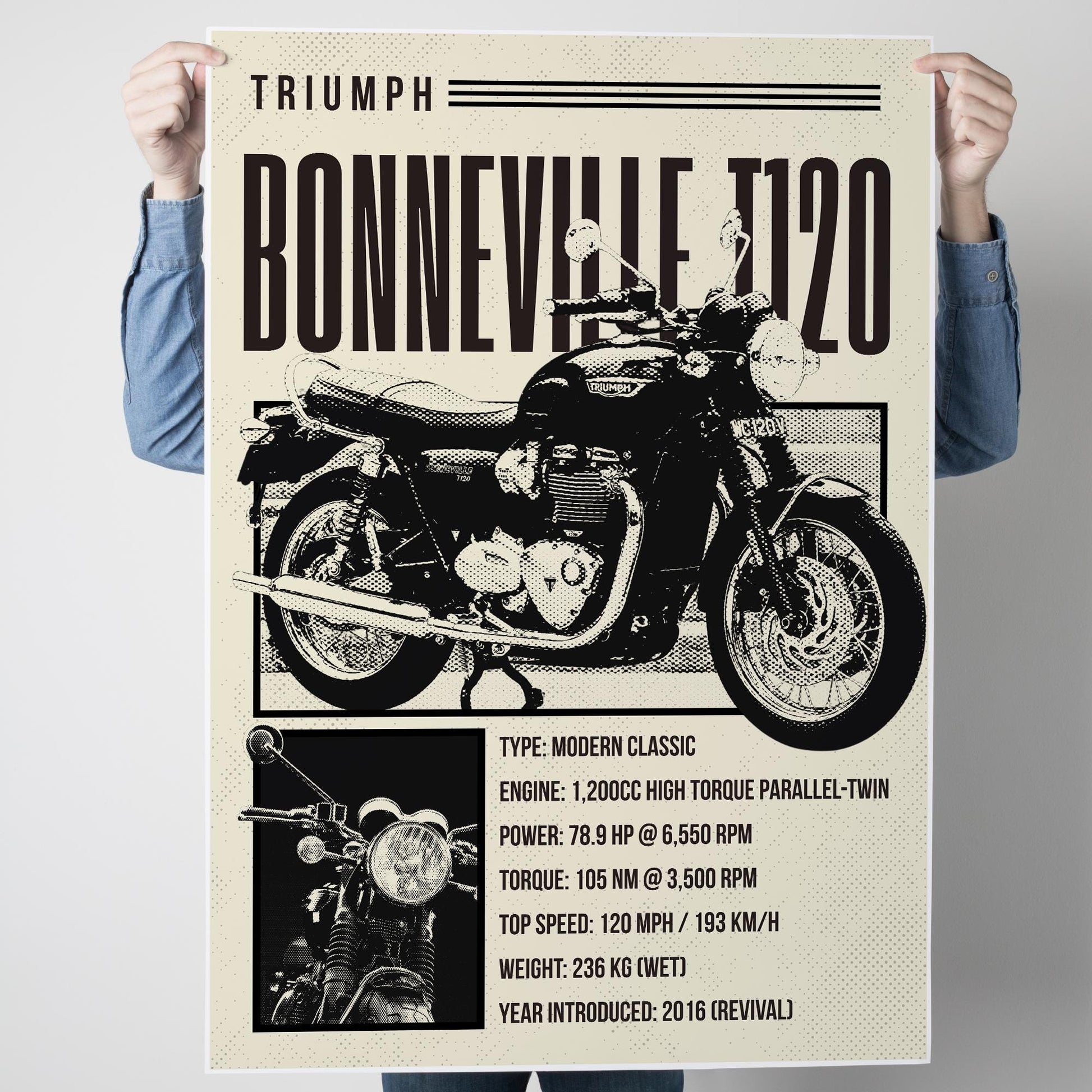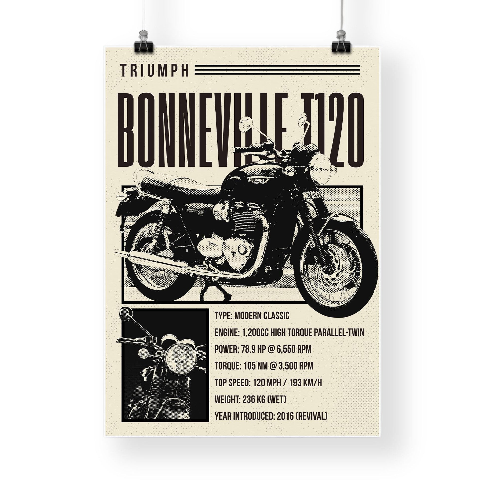 Bring timeless style to your walls with this Bonneville T120 motorcycle poster. Featuring a classic silhouette and performance breakdown, its a perfect mix of heritage and bold design. A great addition to any vintage-inspired space.