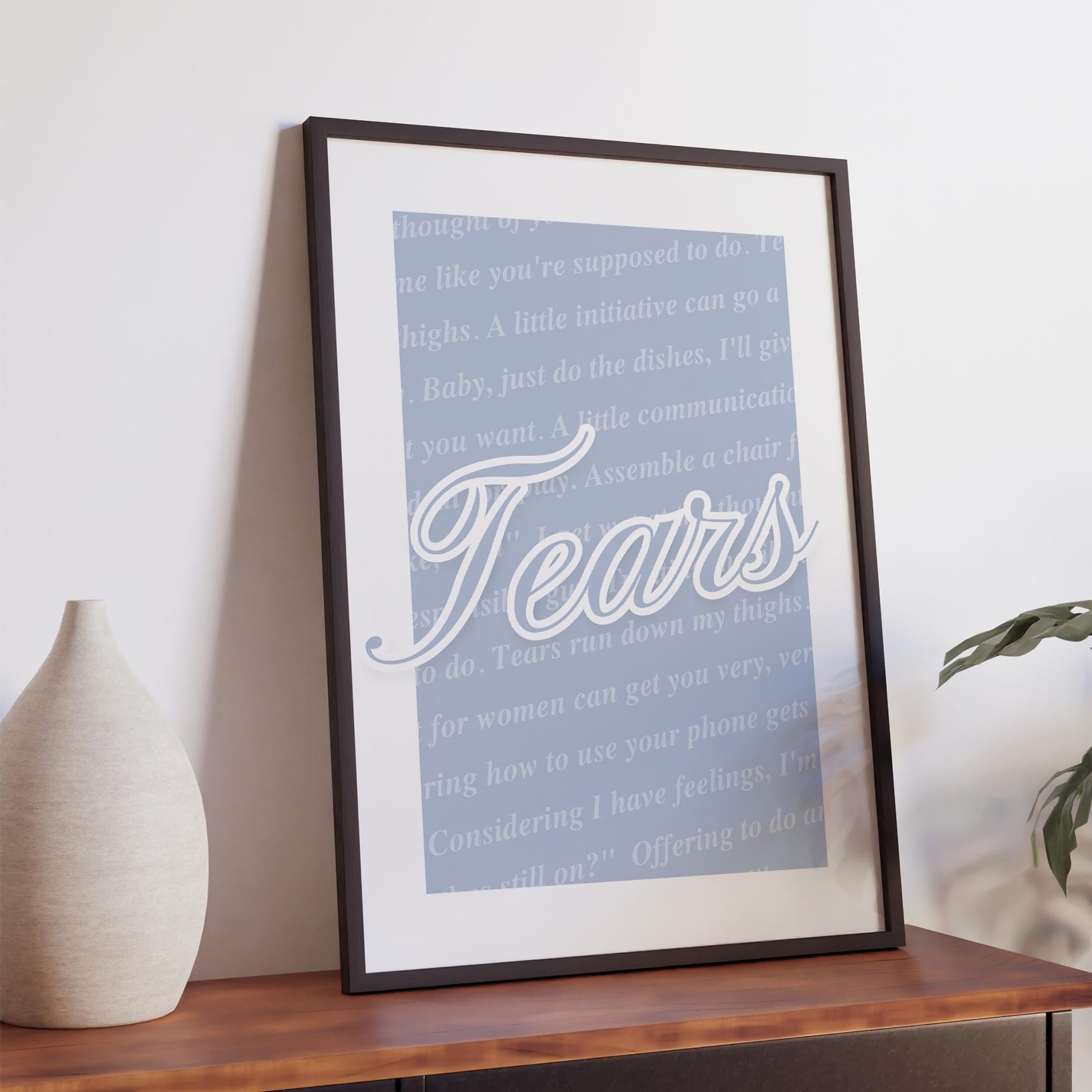 This elegant script-style poster overlays text with subtle background details for a chic, soft aesthetic. A refined way to display the Tears Run Down My Thighs lyric, it blends effortlessly into modern interiors while still making a statement.