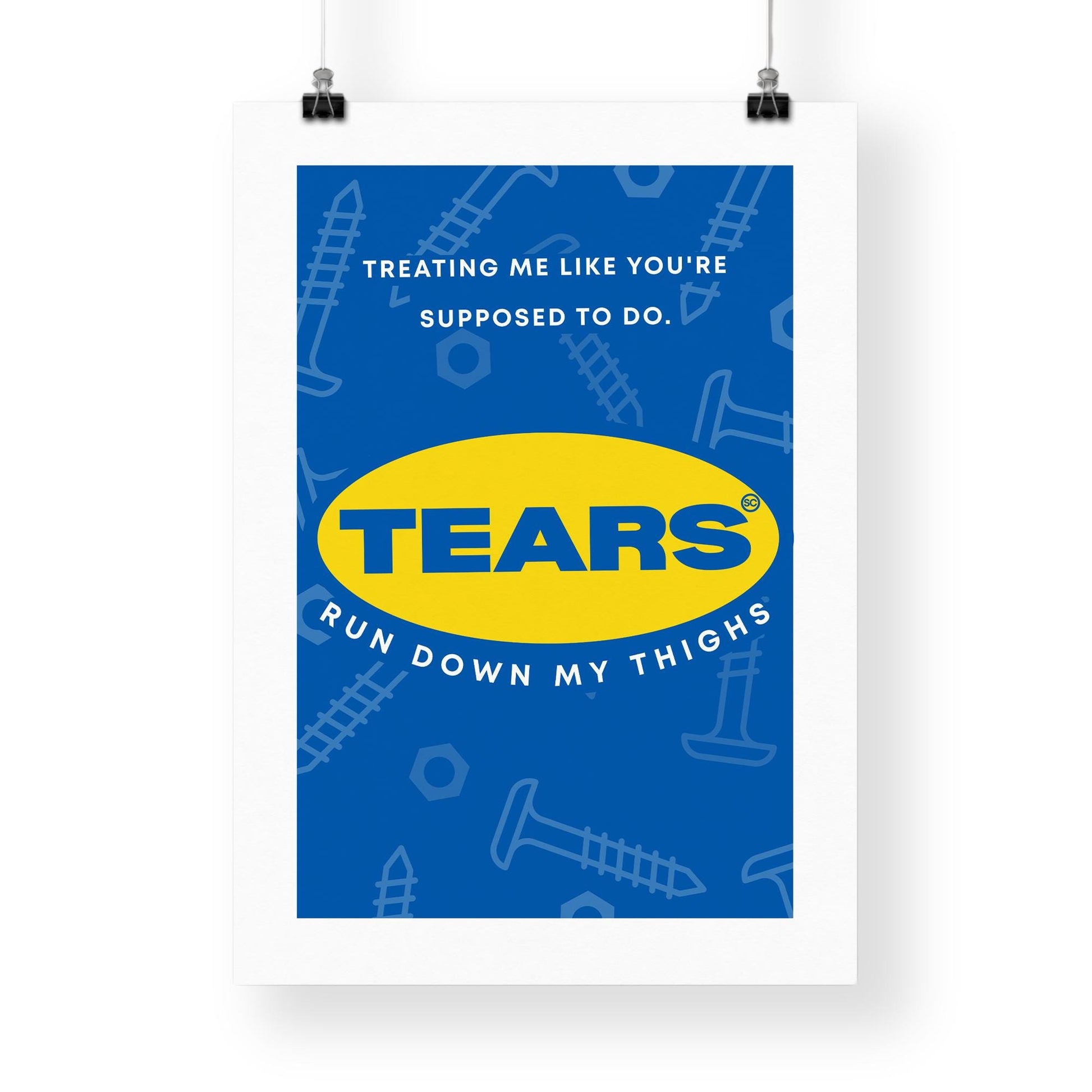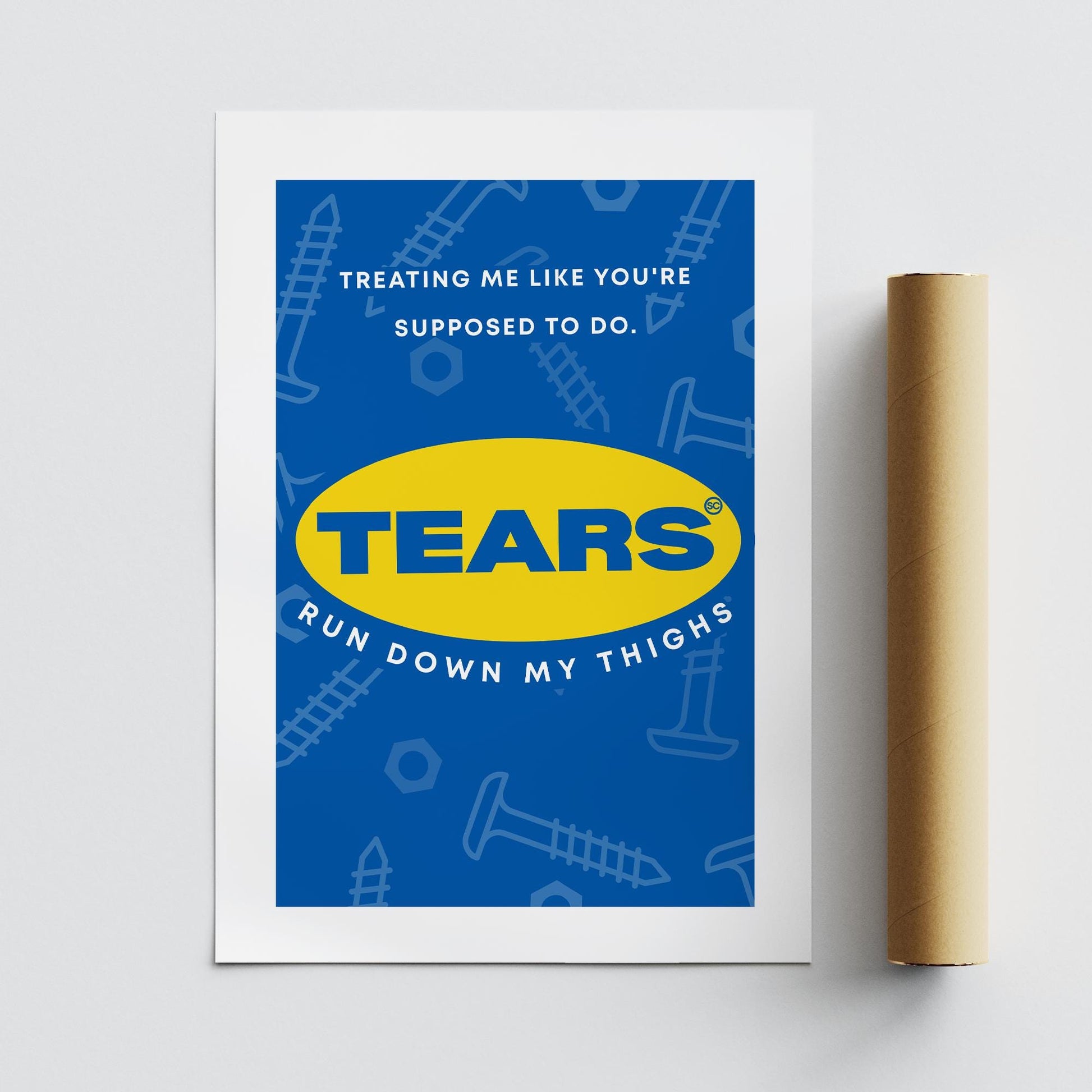 Bring a playful twist to your wall décor with this bold blue and yellow Tears Run Down My Thighs poster. Designed in a vibrant graphic style with a nod to pop culture branding, it’s a standout piece for fans who love quirky, lyric-inspired artwork. Perfect for bedrooms, dorms, or creative spaces.
