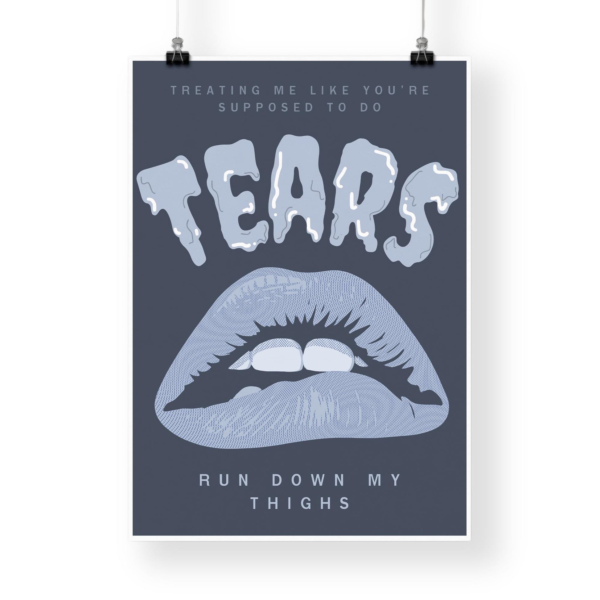 This bold illustrated design features melting text and striking lip art, bringing edgy attitude to your wall. The Tears Run Down My Thighs lyric-inspired print is perfect for fans who love statement artwork with a graphic punch.
