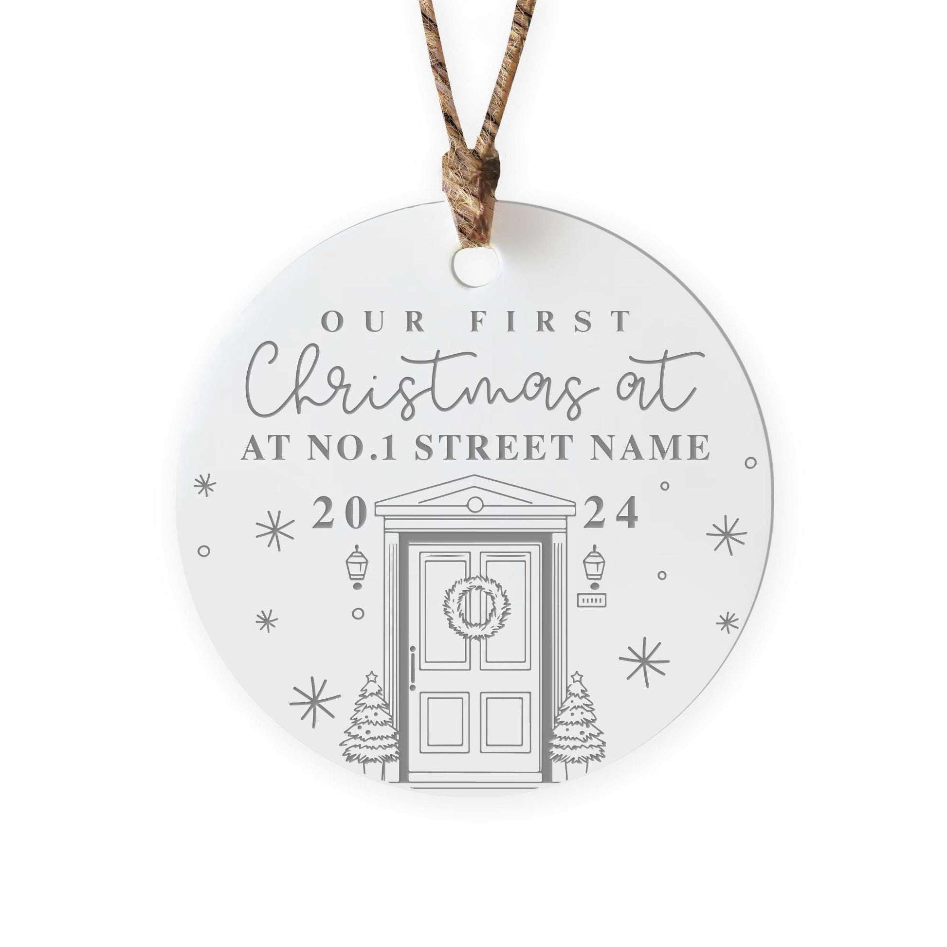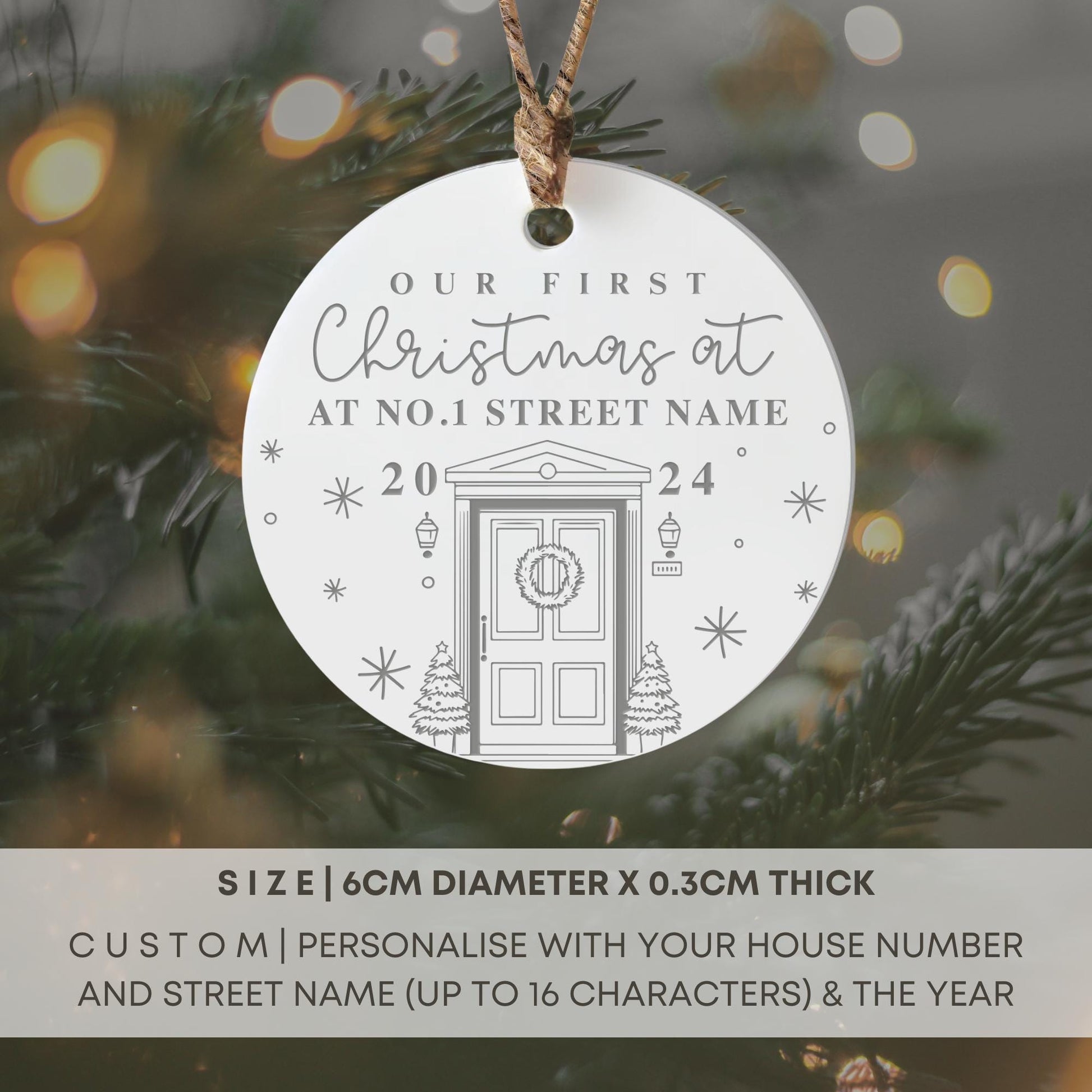 Celebrate your first Christmas in your new home with this beautifully crafted ornament! Made from 3mm thick white acrylic, 6cm diameter ornament features an elegant design that captures the joy of your milestone moment. With charming illustrations and typography, this ornament comes with a rustic hemp string, perfect for hanging on your Christmas tree or displaying as a keepsake.