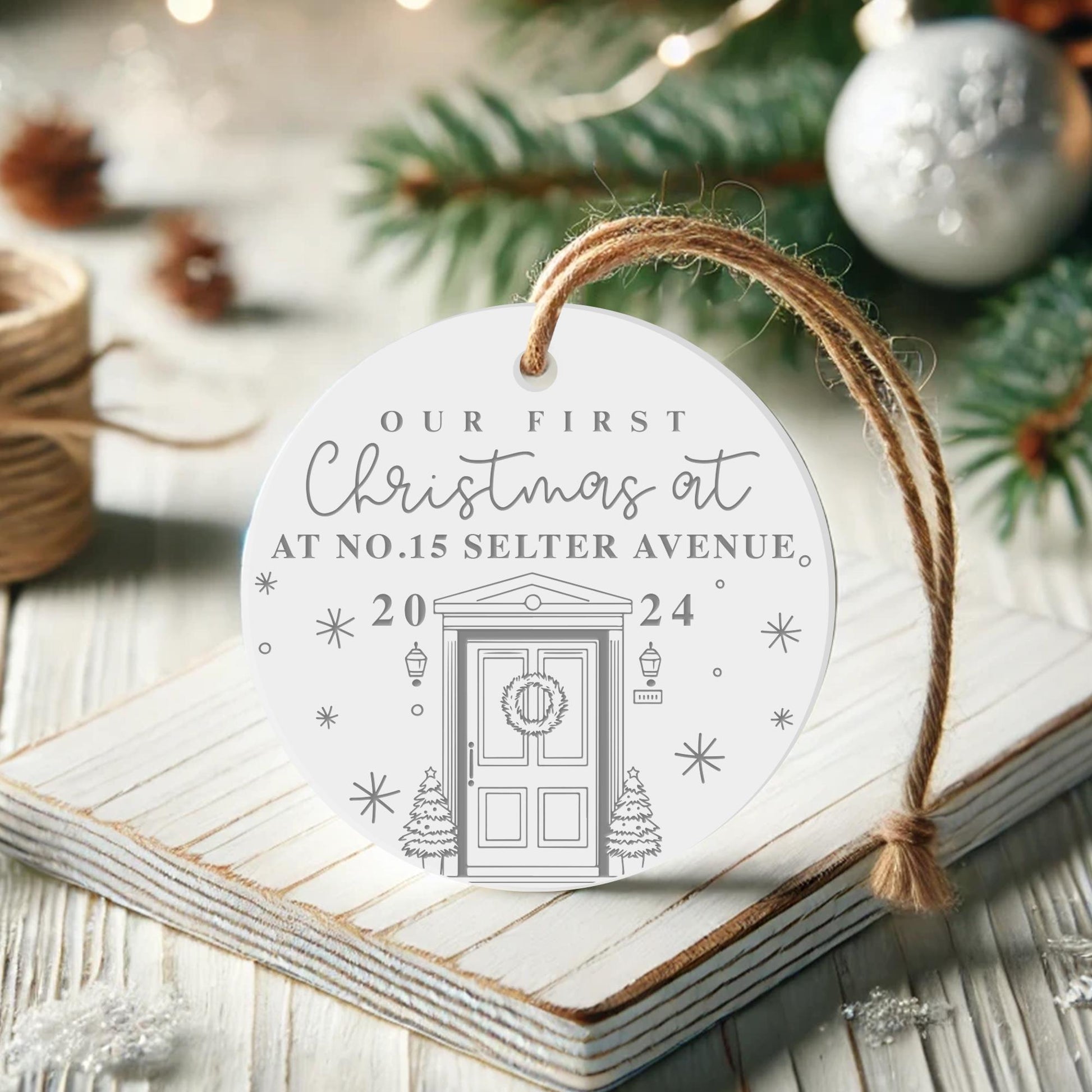New Home - Christmas Door Ornament: Personalised First Christmas Keepsake - White Christmas Decoration, Xmas Bauble, House Warming Gift