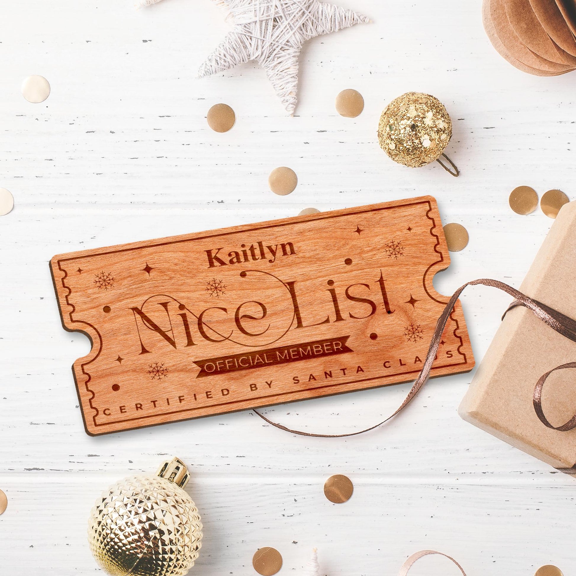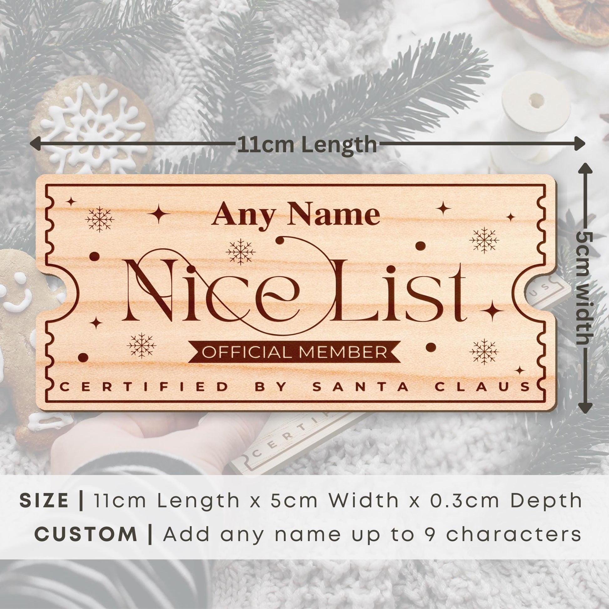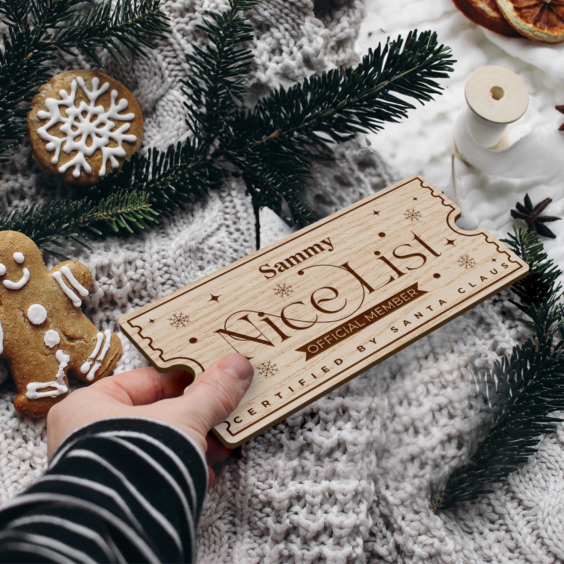 Celebrate the magic of Christmas with this beautifully crafted personalised wooden "Nice List" ticket!