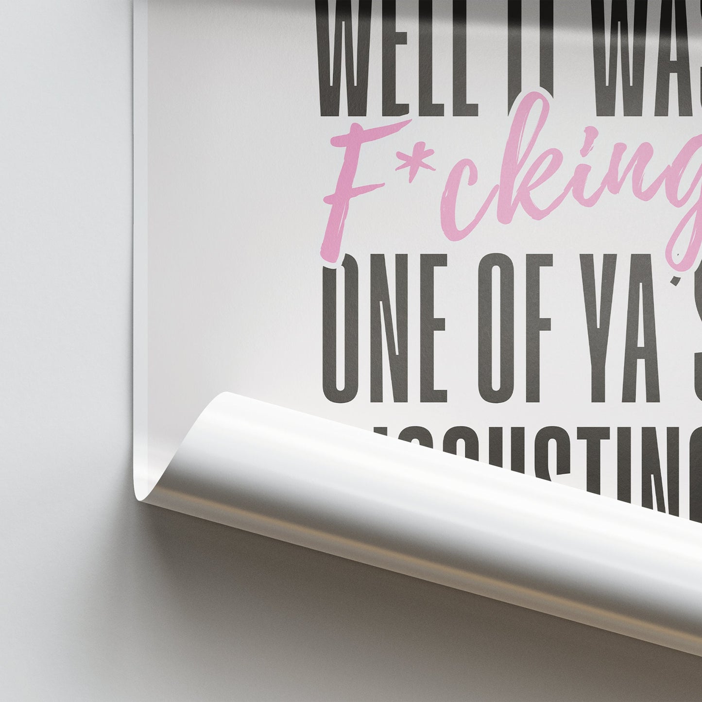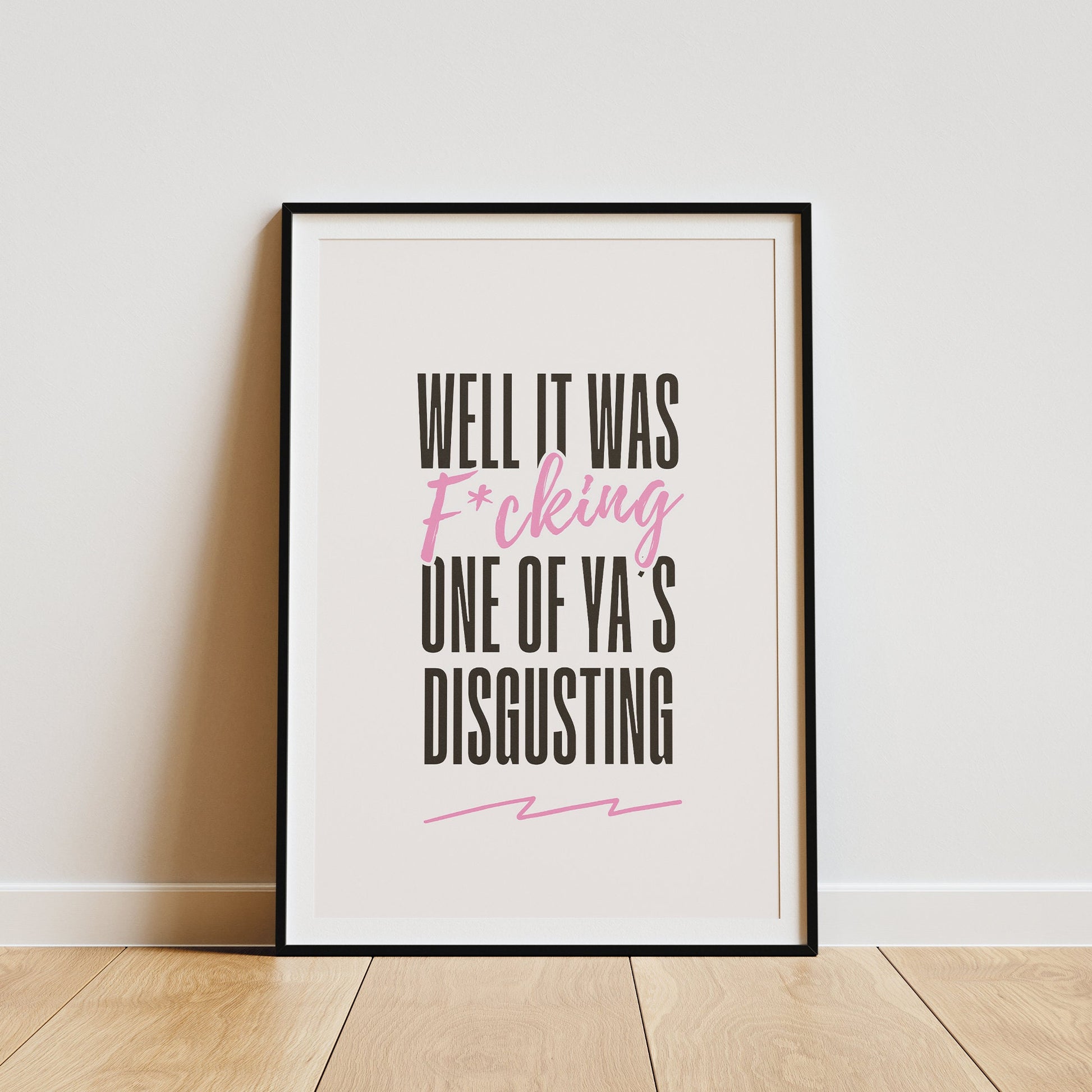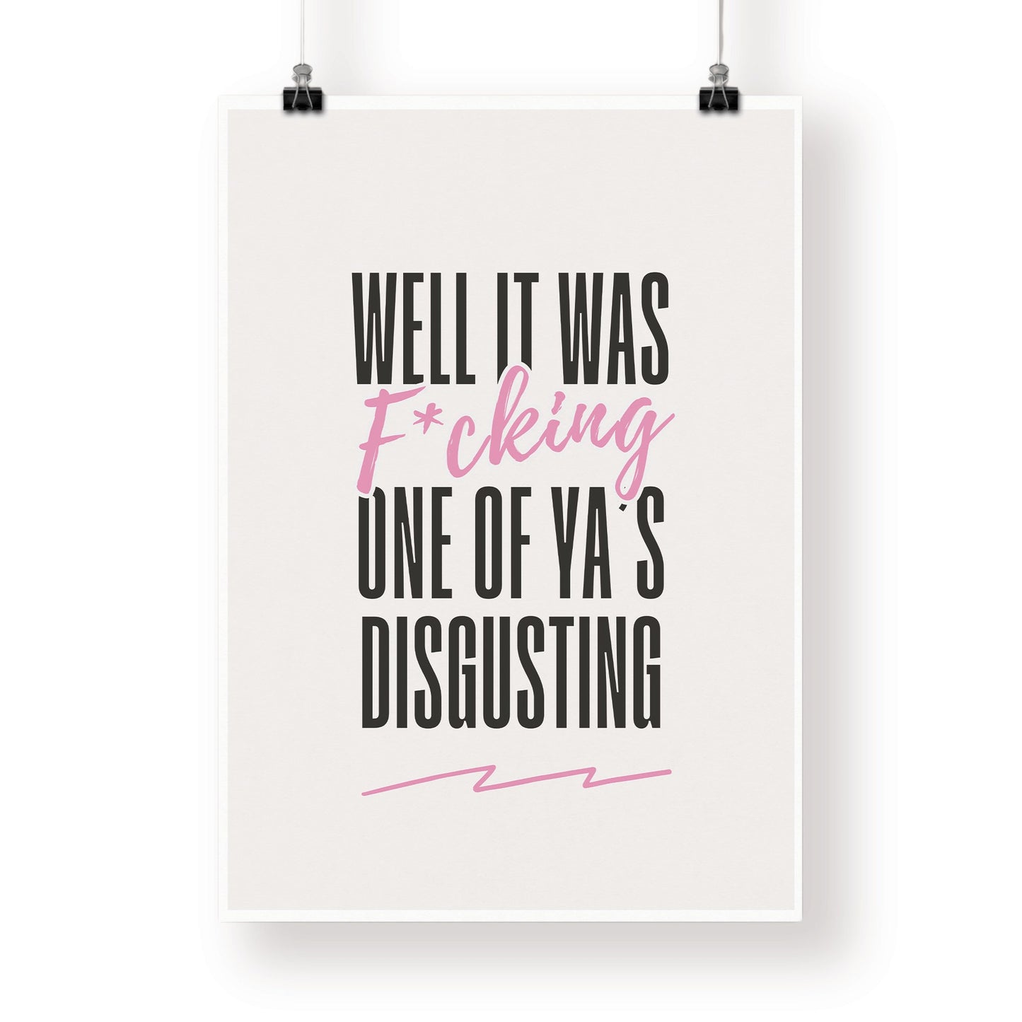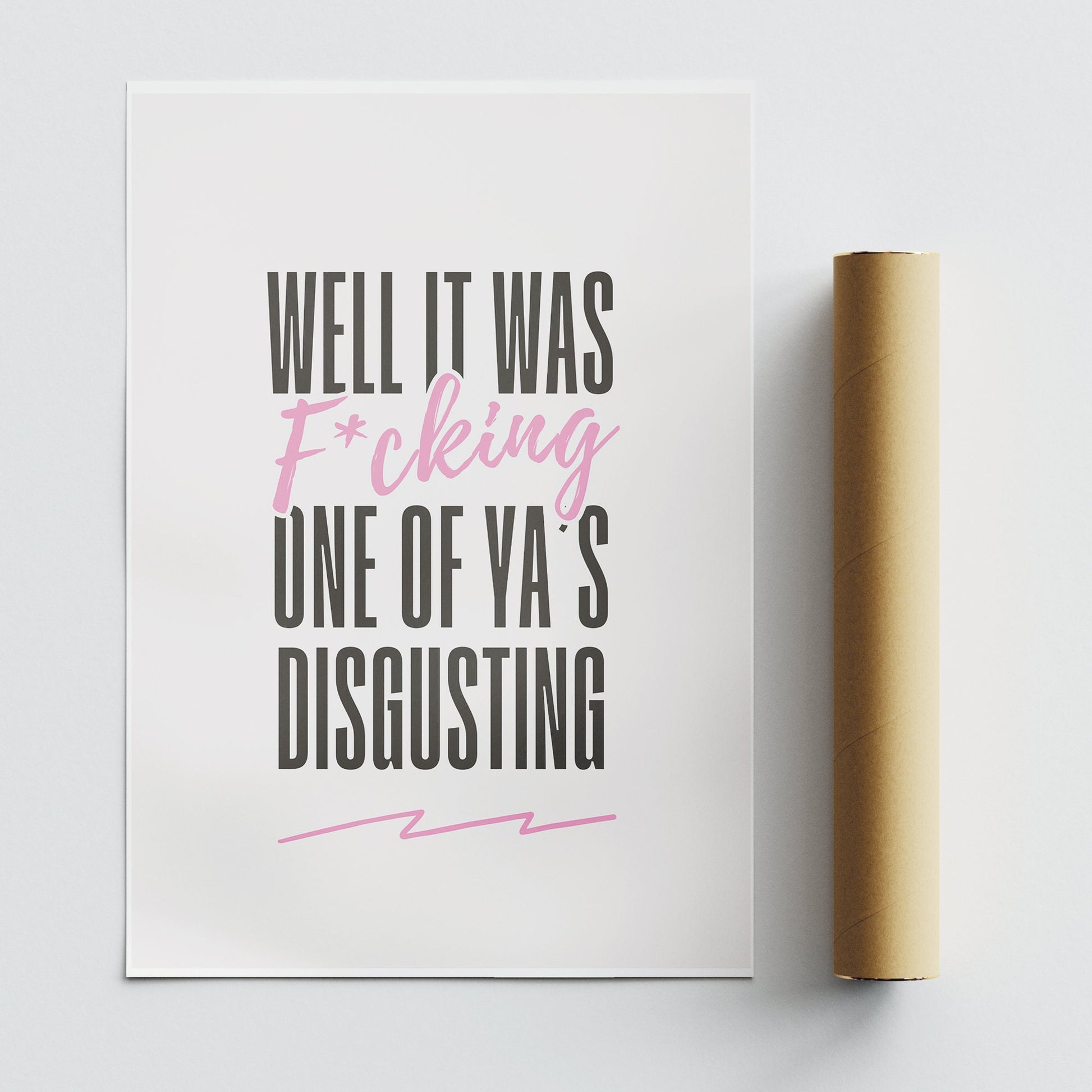 Add a touch of British humour to your home decor with this high-quality gloss poster. Inspired by an iconic British meme, this poster features the hilarious phrase, "Well, it was f*cking one of ya‘s. Disgusting." It‘s the perfect choice for adding a bit of levity to your bathroom wall. Let this funny and quirky artwork bring a smile to your face every time you see it.Upgrade your bathroom with this unique and amusing wall art piece that is sure to spark conversations and laughter among your guests.