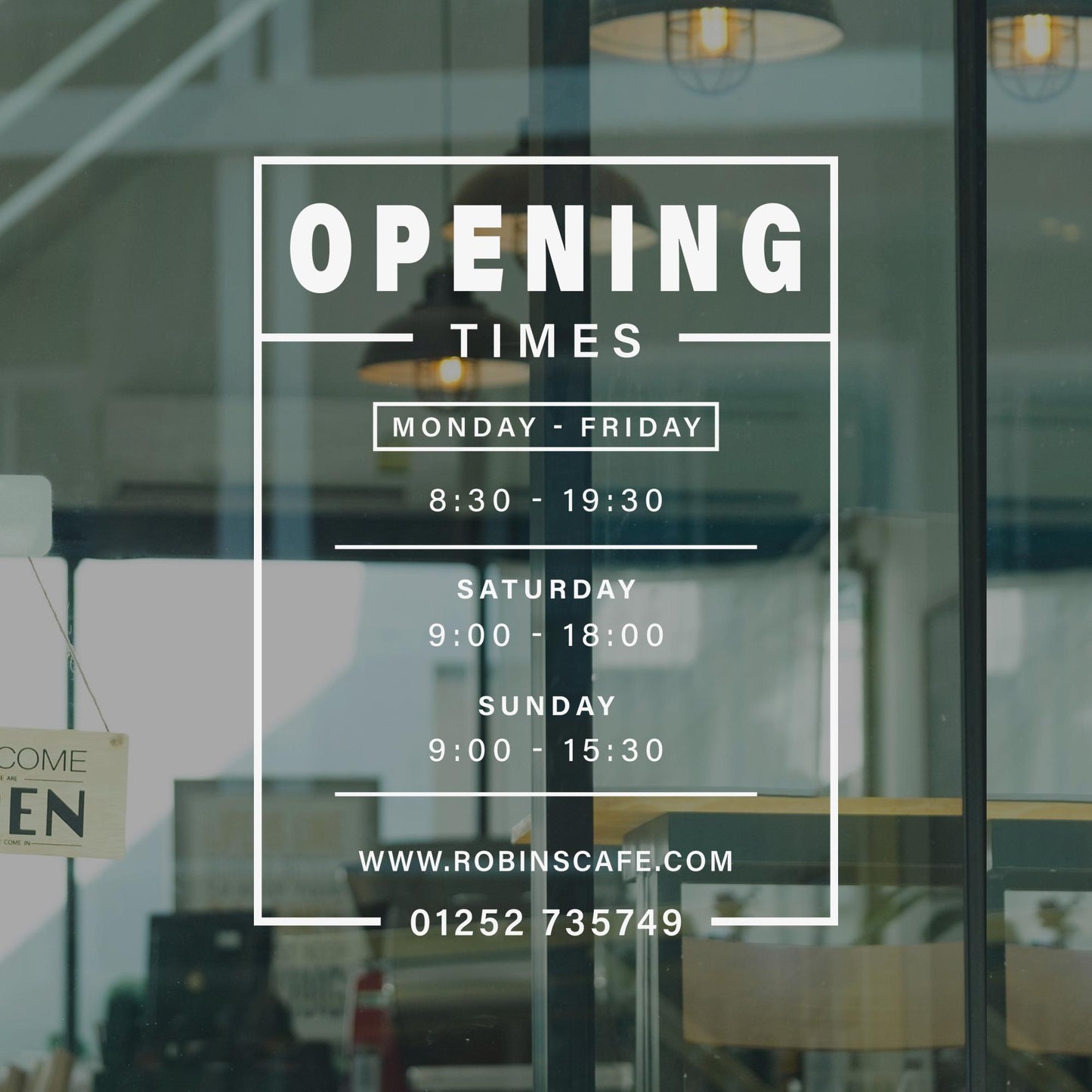 Enhance the professional look of your business with our custom opening hours window sticker. Perfect for shops, cafes, restaurants, and offices, this personalised opening times decal clearly displays your hours of operation, ensuring your customers are always informed.