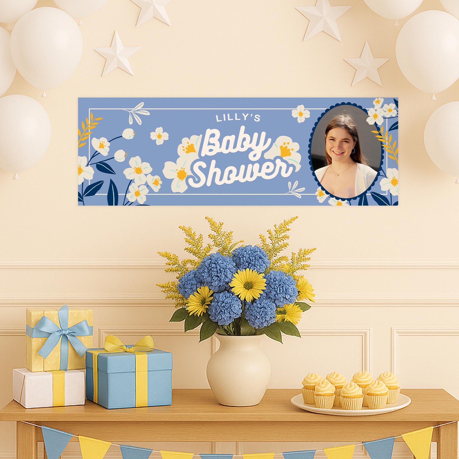 Personalised Baby Shower Banner | Bold Floral Baby Shower Banner | Custom with Name and Photo | Blue & Yellow | Summer Party Decorations