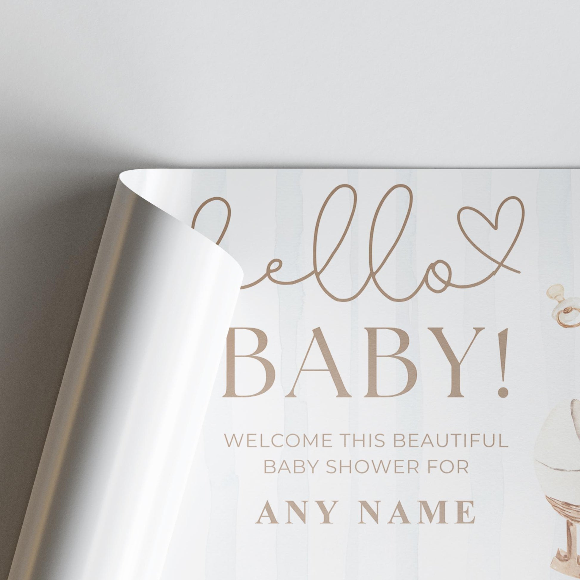 Welcome the mum-to-be with this adorable “Hello Baby banner a sweet and soft-toned watercolour design that makes a gorgeous centrepiece at any baby shower. Personalise it with her name (up to 8 characters) and even upload a photo to make it extra special!