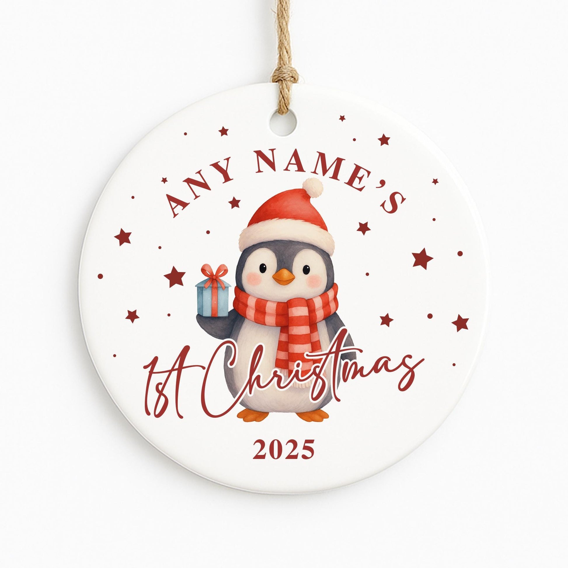 Celebrate your little one’s very first Christmas with this adorable personalised Penguin 1st Christmas Bauble. Featuring a cute festive penguin holding a present and surrounded by stars, this keepsake decoration makes a heartwarming addition to your Christmas tree.