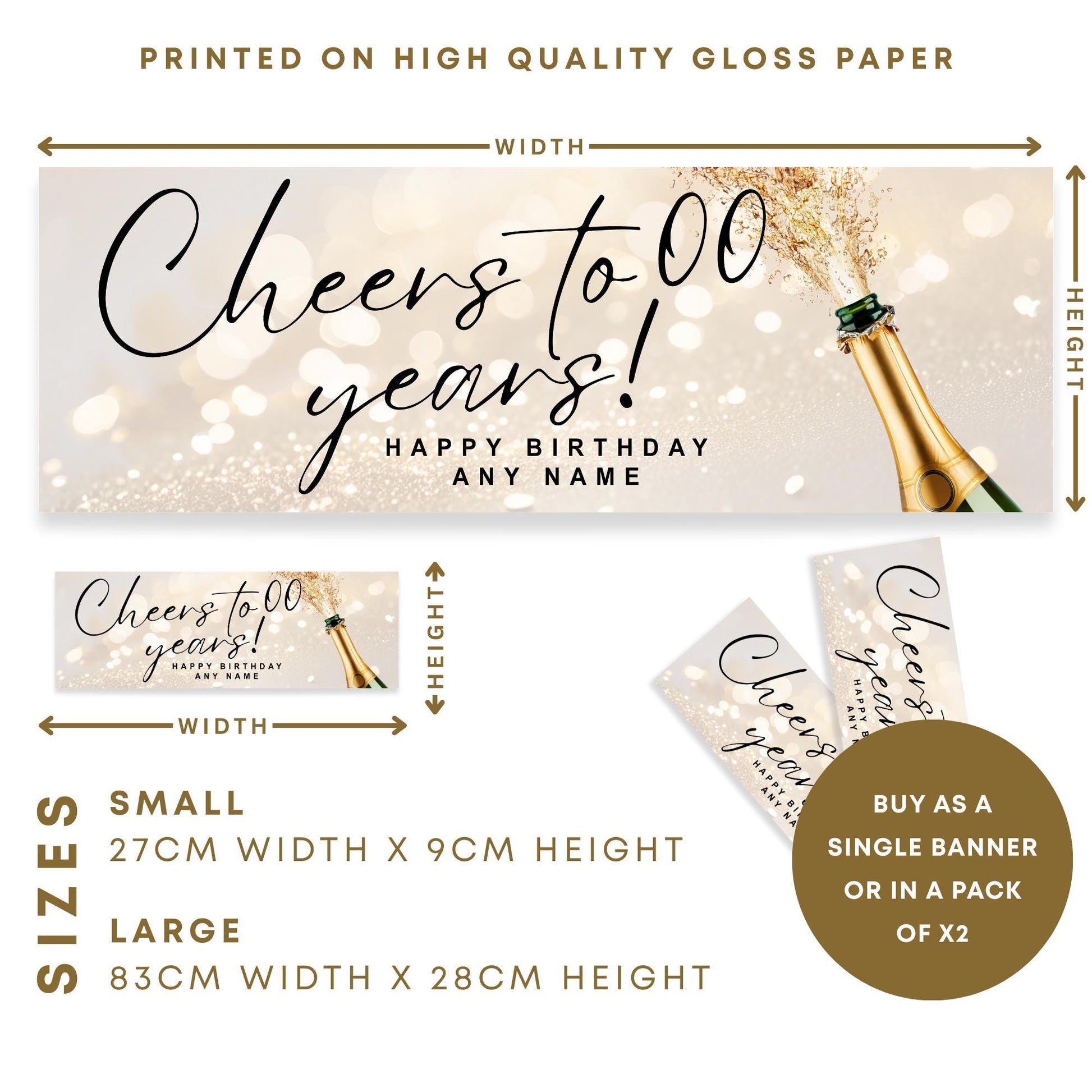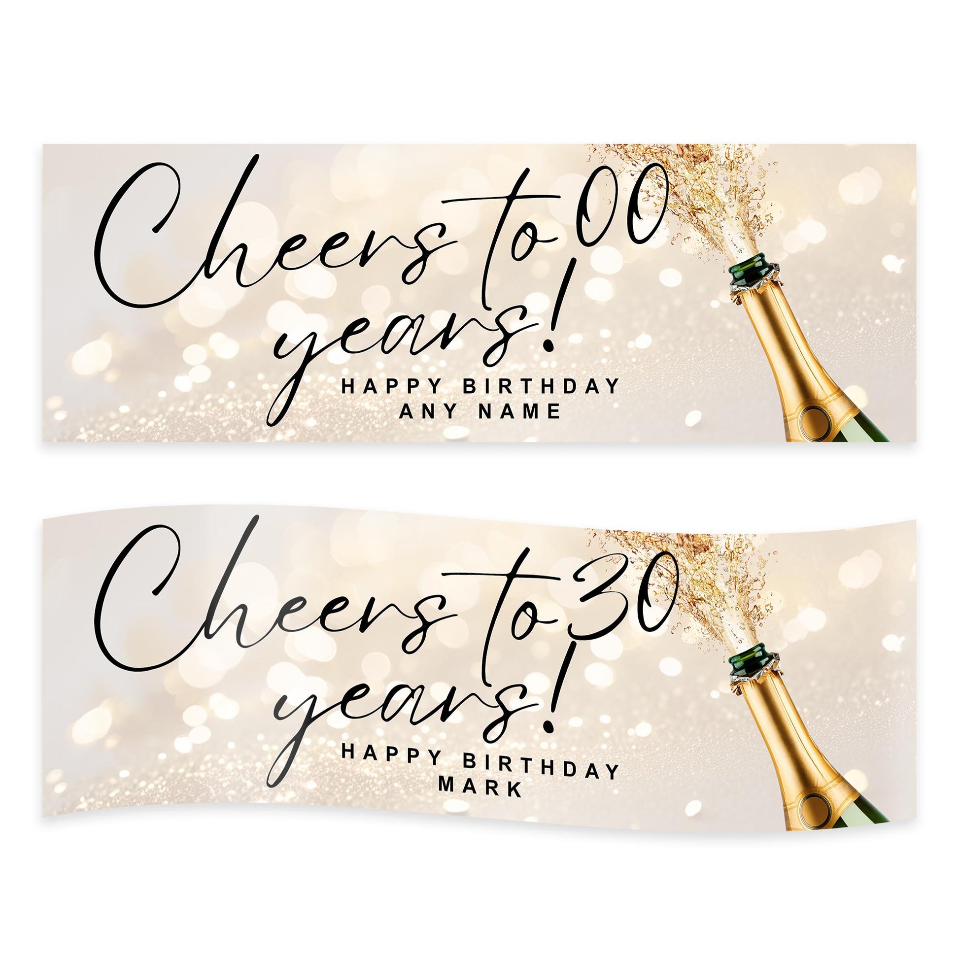 Celebrate in style with this Cheers to Years champagne banner featuring a popping bottle design and elegant script text. Ideal for milestone birthdays and classy parties. Personalise with any name and age to make it extra special.