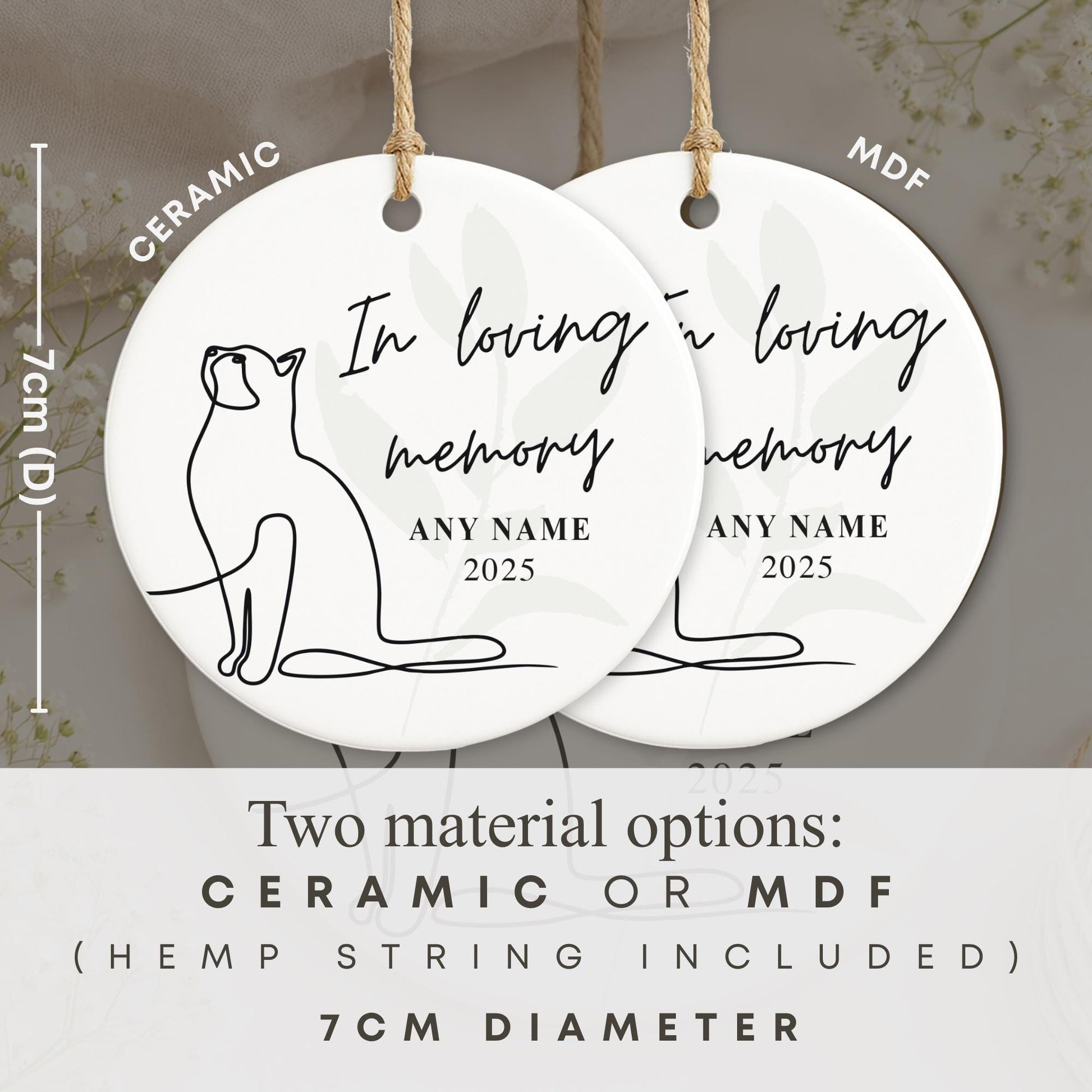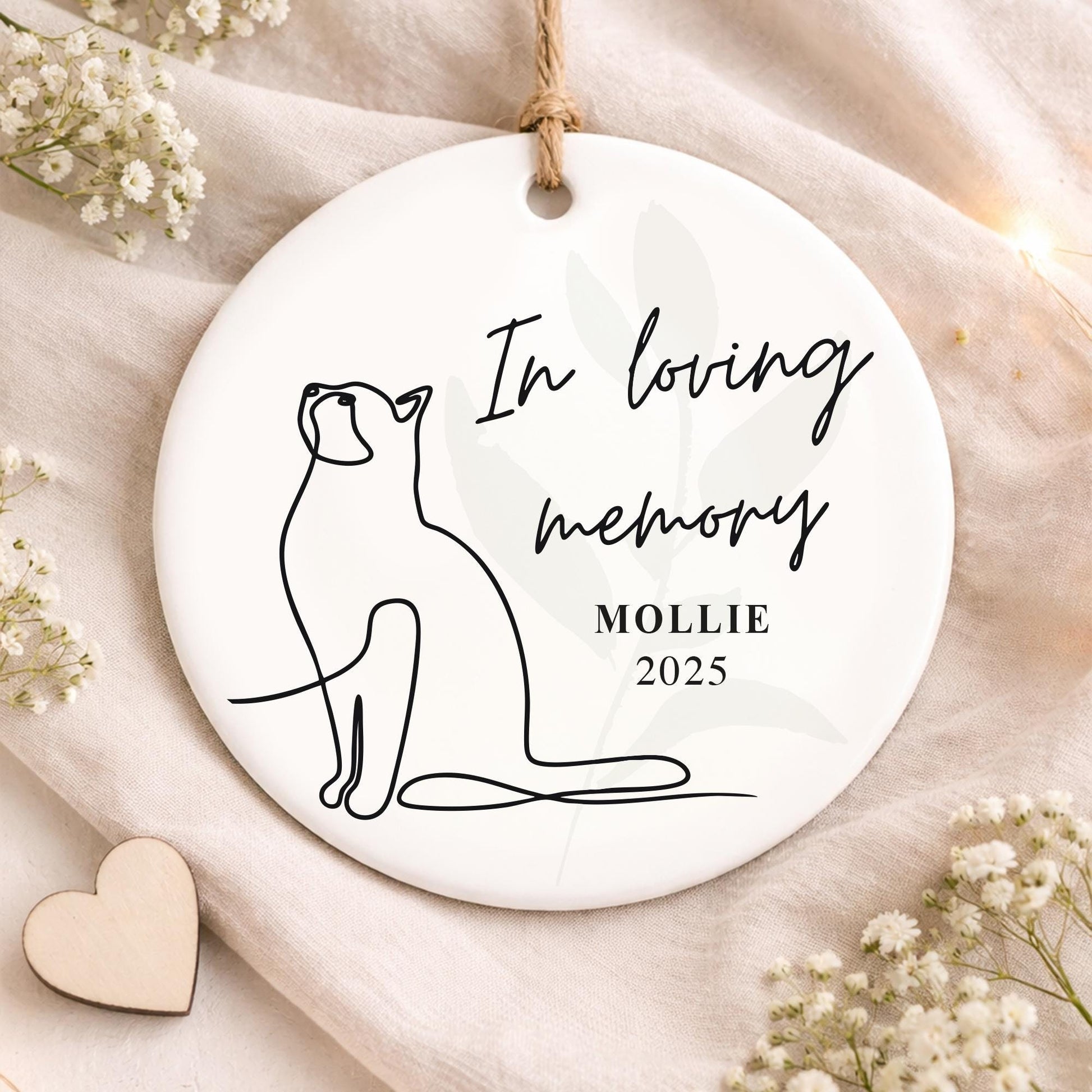 This elegant In Loving Memory cat ornament features minimalist line art and a soft botanical background, creating a timeless tribute to a cherished feline companion. Personalised with a name and year, it offers a gentle and meaningful way to keep their memory close.