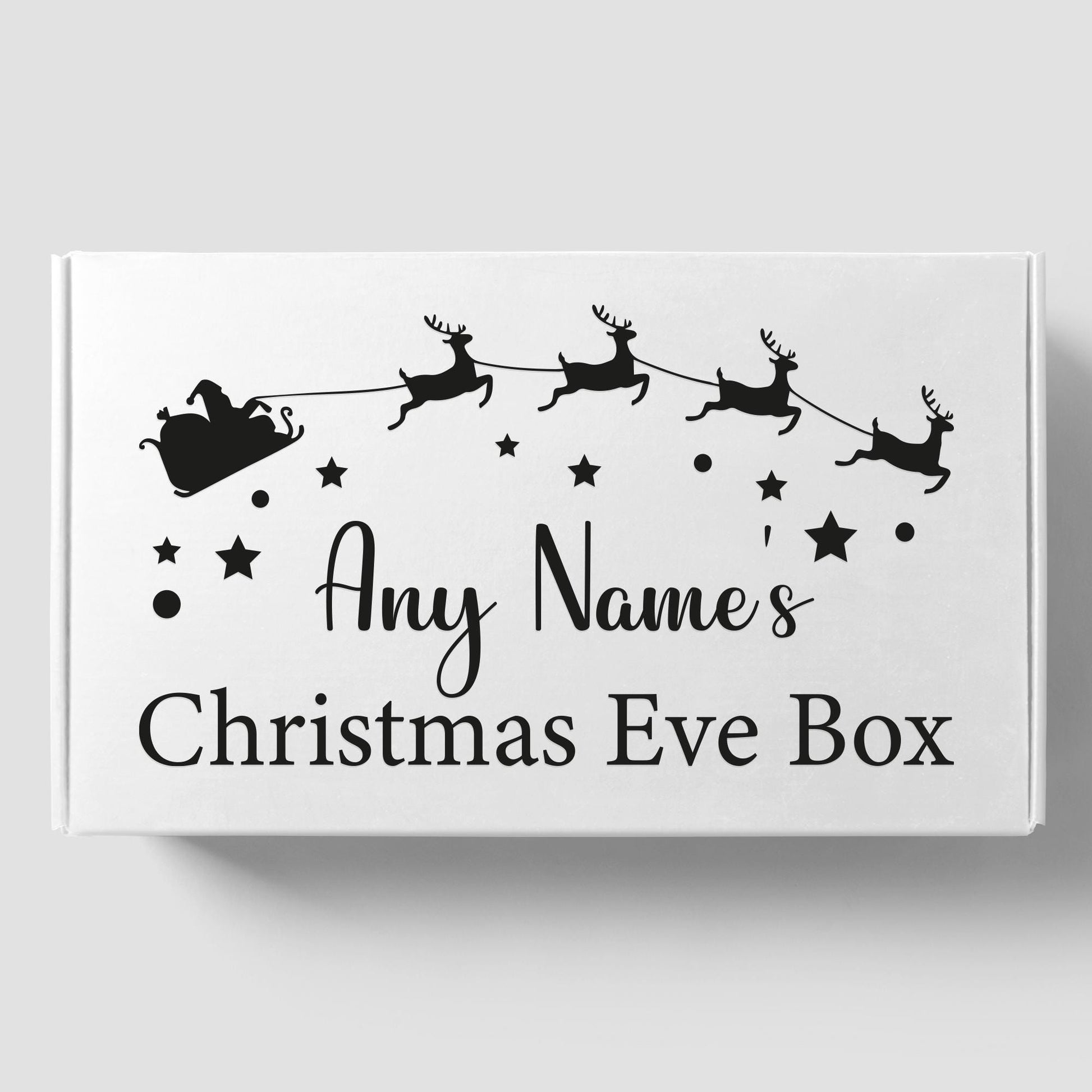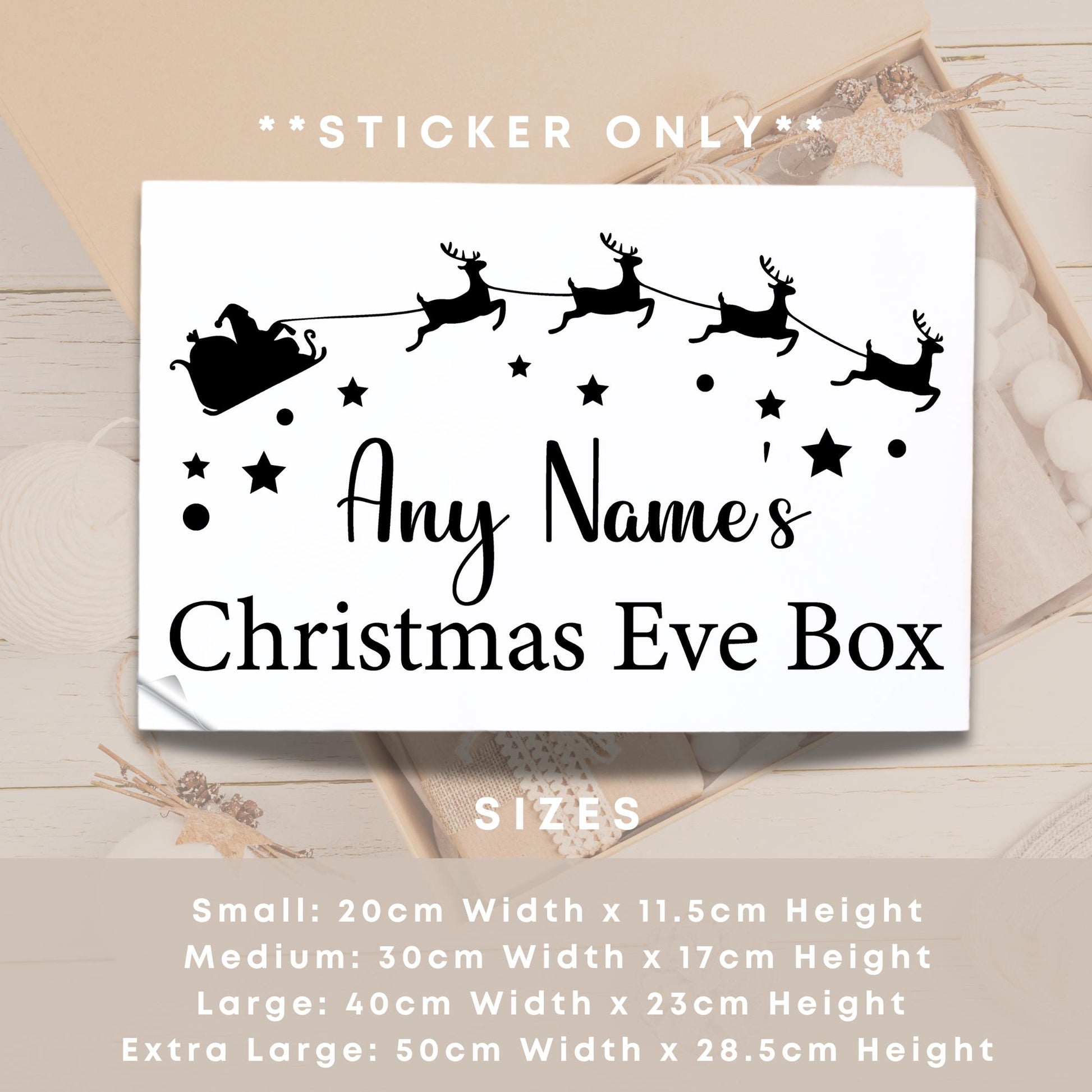 Personalised Christmas Eve Box Sticker: Custom Name Gift Box Decal, Christmas Eve Gift Idea, Xmas Gift Box Label Sleigh & Reindeer Design