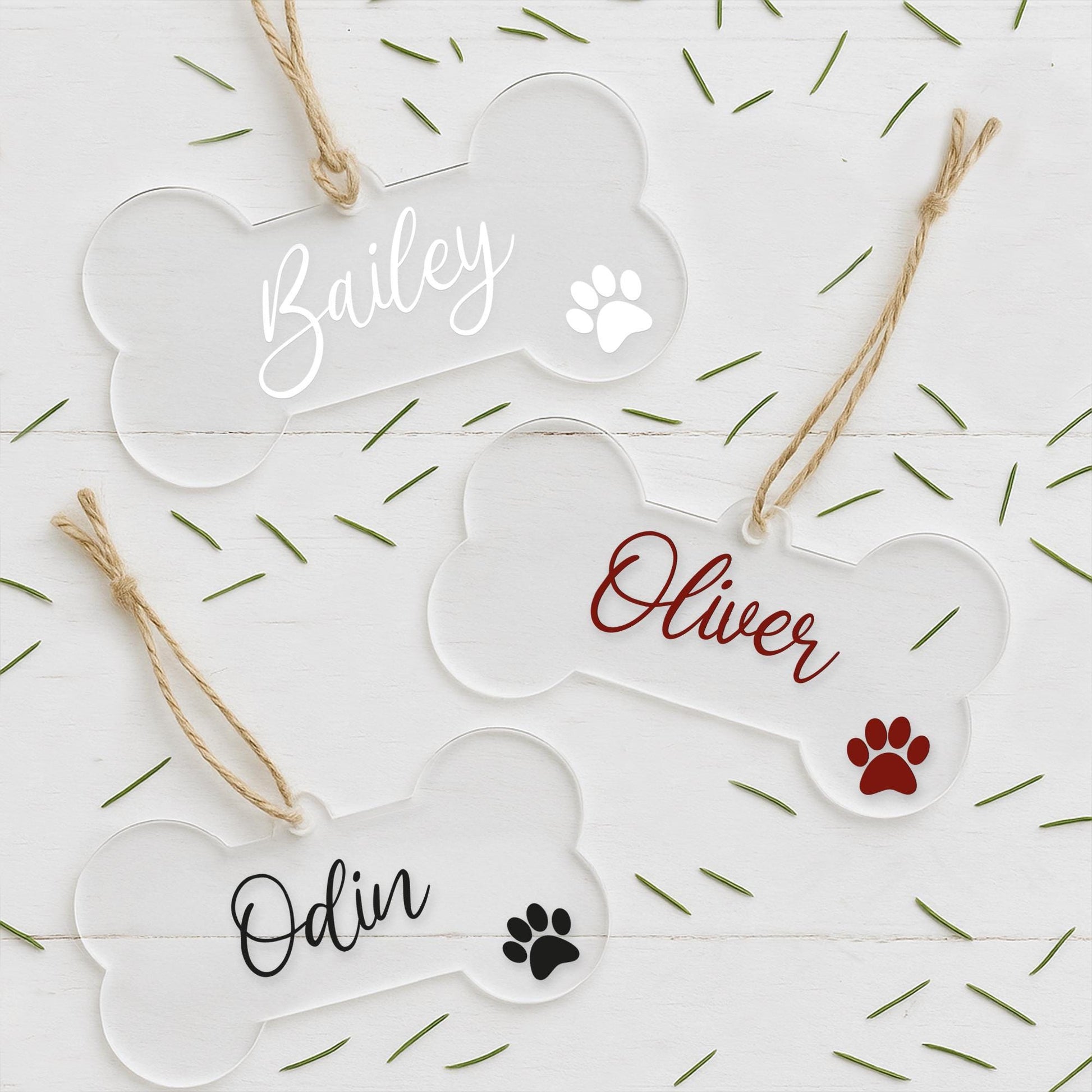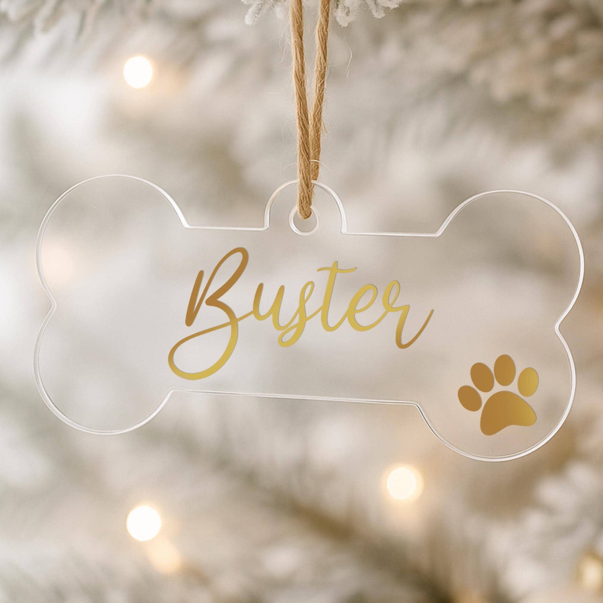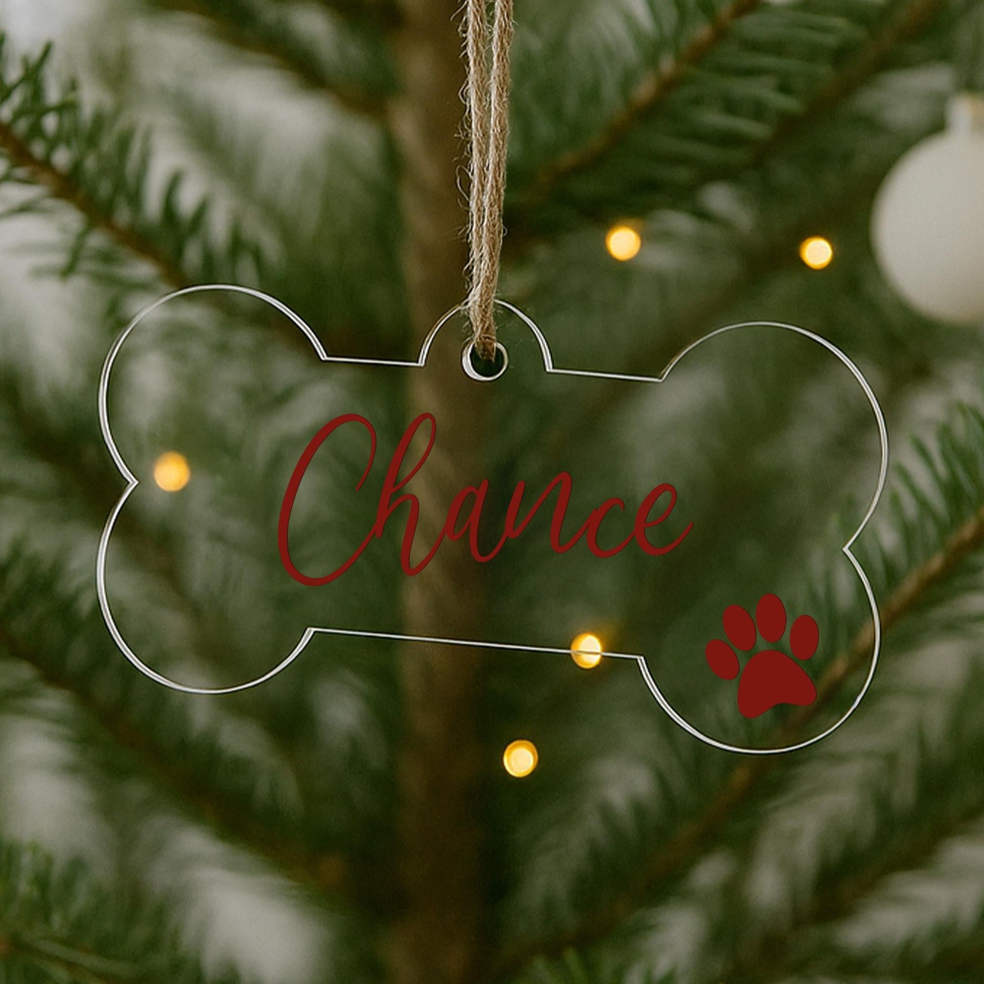 Personalised Clear Dog Bone Christmas Bauble Custom Pet Ornament with Name & Paw print | Puppys First Christmas Gift | Dog Keepsake