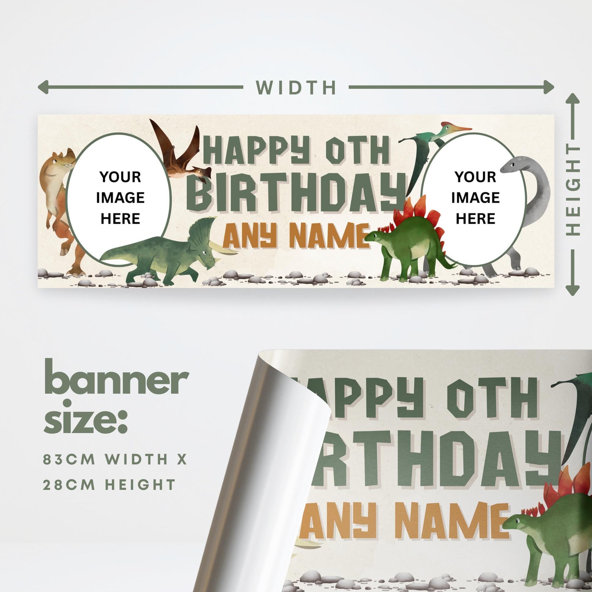 Add your childs name, age, and photo(s) to create a banner thats as special as they are. Printed on premium gloss paper, the earthy tones and natural background give it a beautifully finished look. Perfect for little ones who love all things dinosaur, this banner makes an eye-catching backdrop for cake tables, photo walls, or party entrances.
