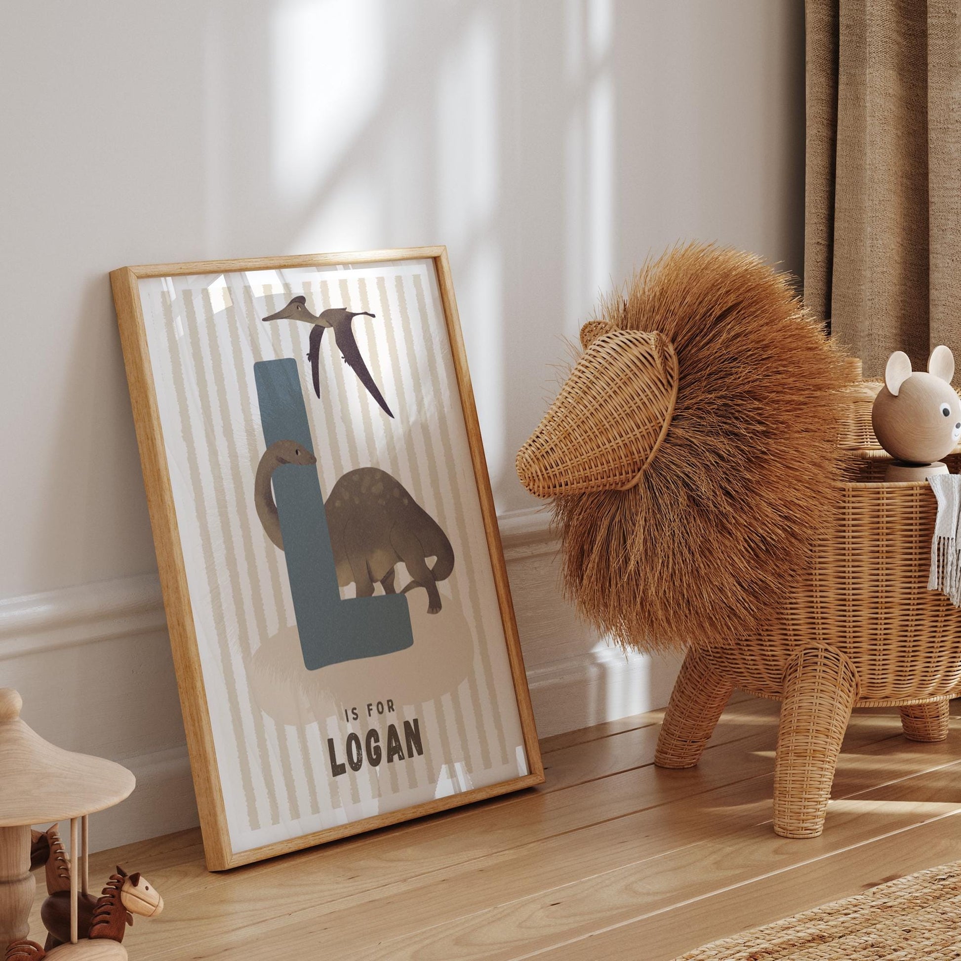 Unleash your childs love for dinosaurs with this personalised dinosaur alphabet poster! Featuring their name and initial surrounded by beautifully illustrated dinosaurs like the Stegosaurus, Pterodactyl, and more, this wall art brings prehistoric adventures to life. Perfect for kids bedrooms, nurseries, or playrooms!