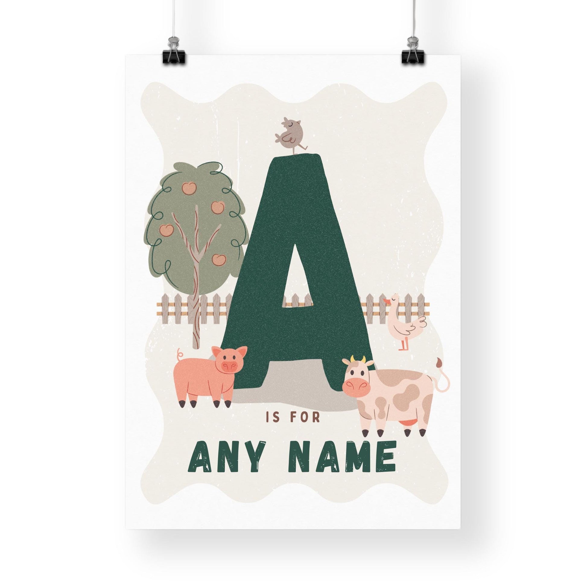 Personalised Farm Animal Initial Poster: Custom Alphabet Wall Art for Kids Bedroom, Nursery & Playroom, Rustic Print, Gender Neutral Decor