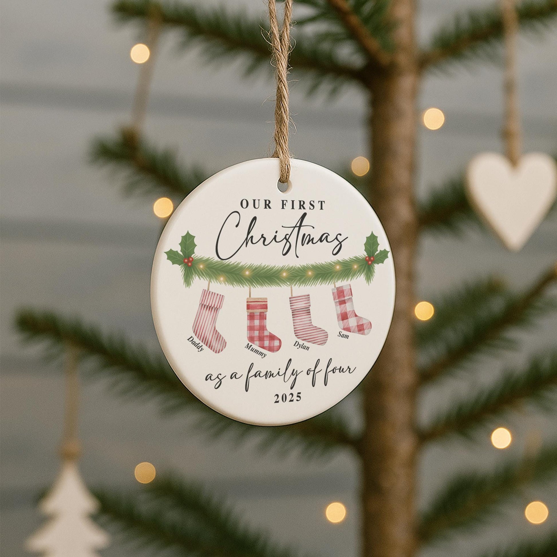 • Personalised Family Ornament: Customise with 2–6 stockings, each featuring a name of your choice, plus your selected year (e.g. 2025).