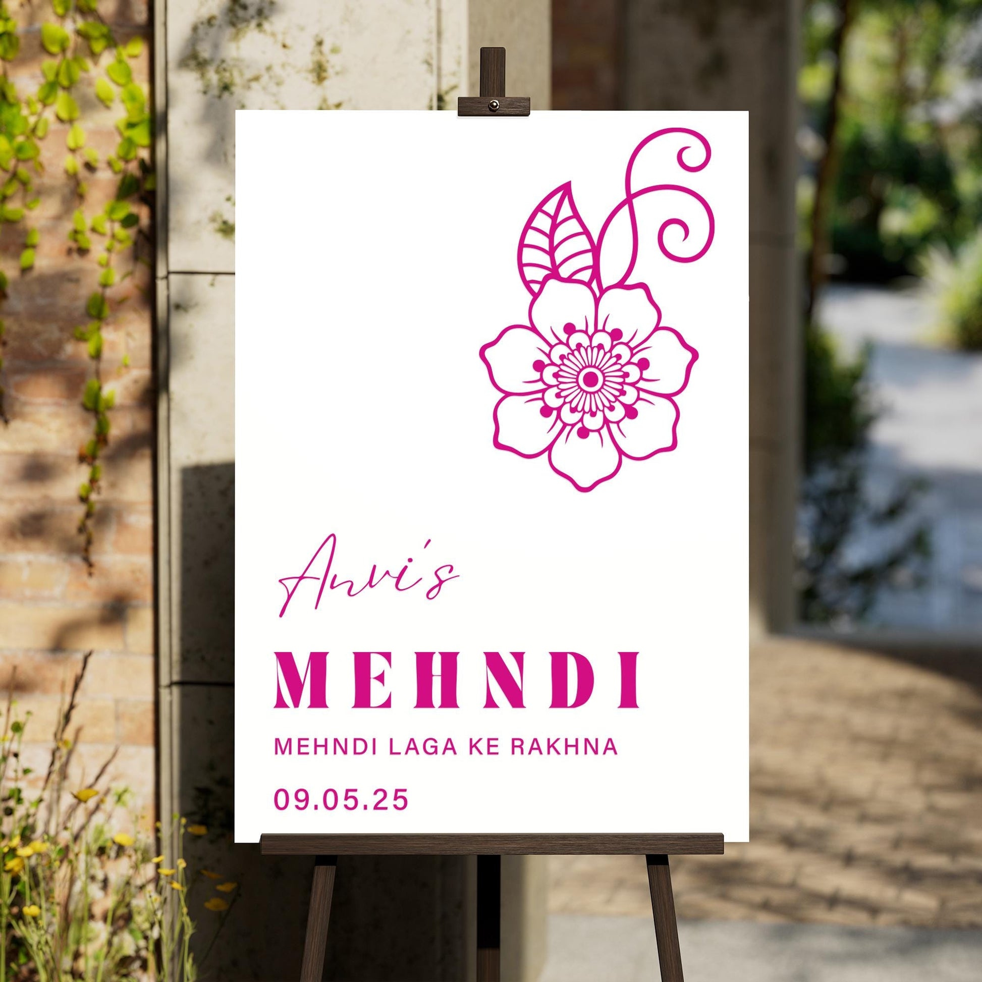 Turn heads at your Mehndi celebration with this beautifully elegant floral vinyl sticker, customised with your name and date. Featuring delicate henna-inspired flower art and the iconic phrase "Mehndi Laga Ke Rakhna", this sticker is a perfect blend of tradition and modern minimalism.