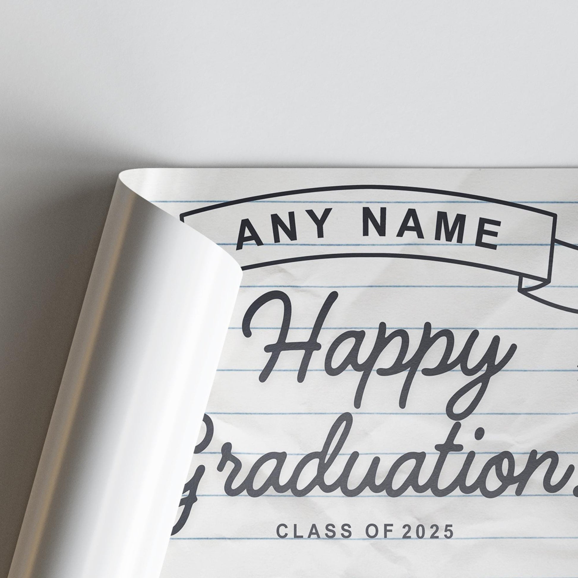 Celebrate your graduate with this charming notebook-inspired banner, perfect for school leavers and academic milestones. Featuring a hand-drawn style banner on lined paper, this design includes the graduate‘s name, the year, and space for one or two photos. A fun and sentimental addition to any graduation party.