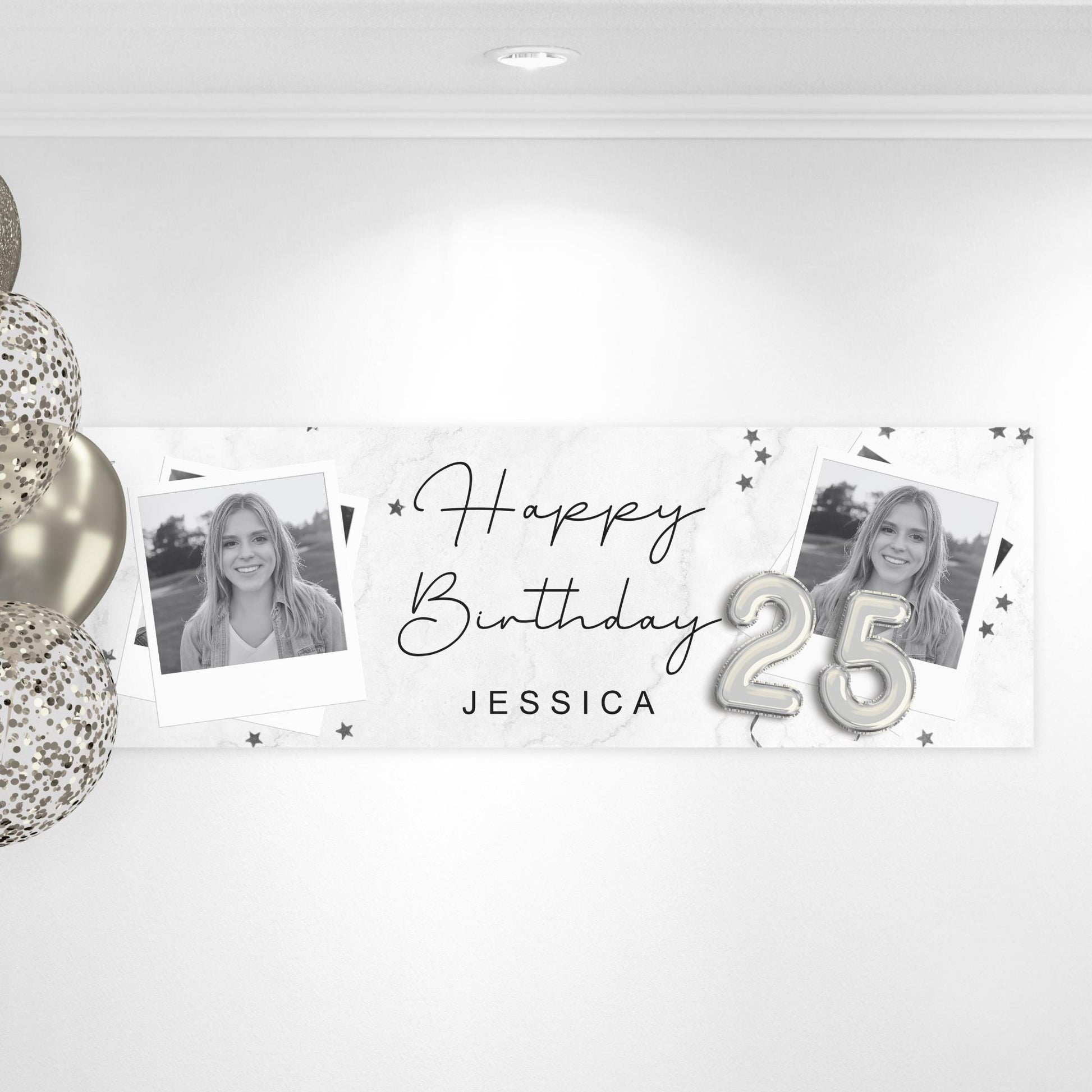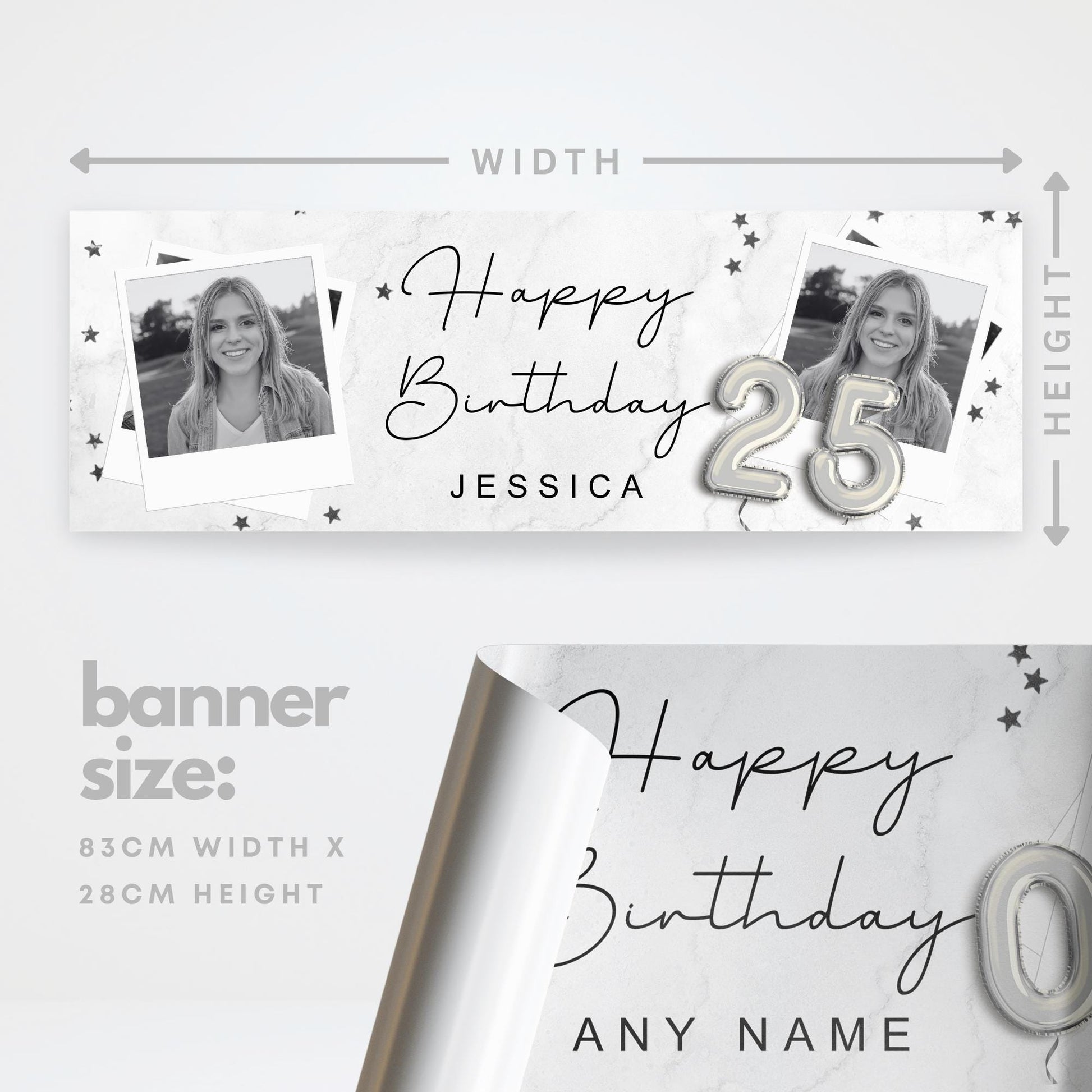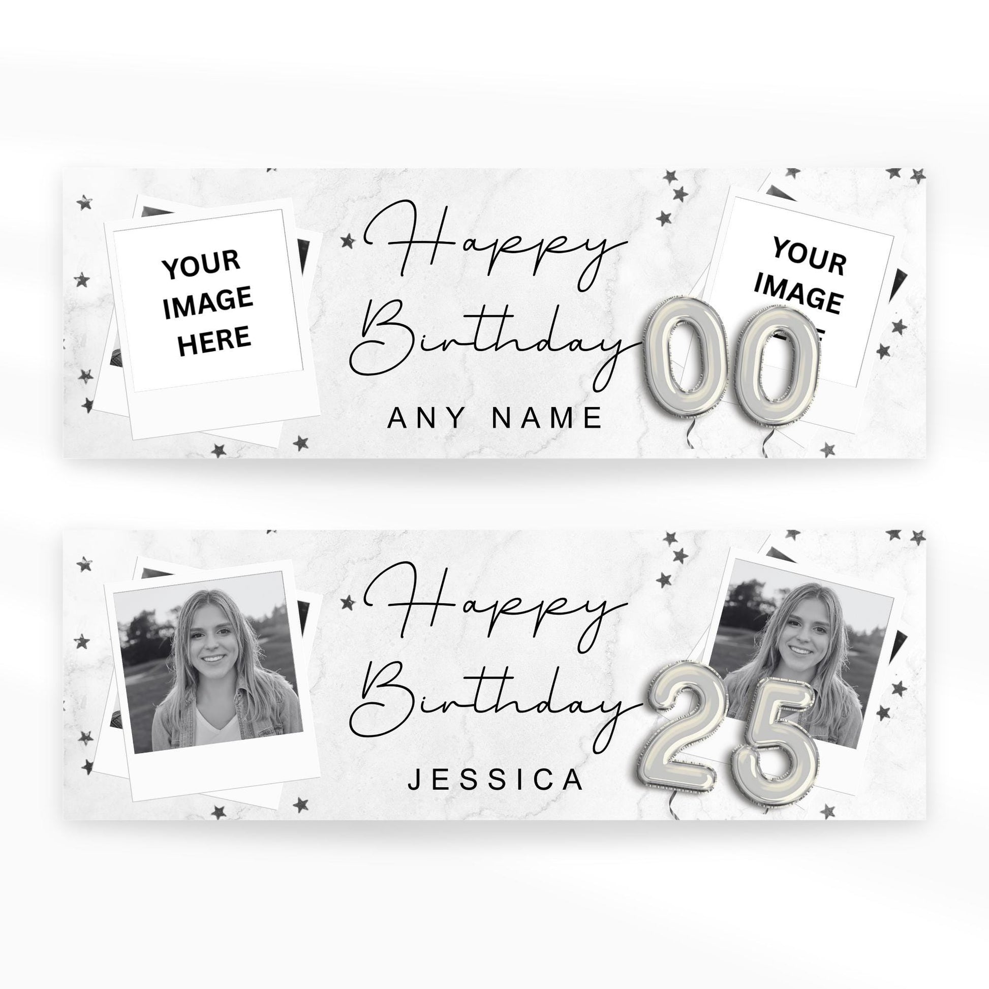 Celebrate in timeless style with this customisable birthday banner, perfect for milestone birthdays! With bold grey numbers, twinkling stars, and space for two personalised photos, this banner adds a modern yet elegant touch to any birthday setup.