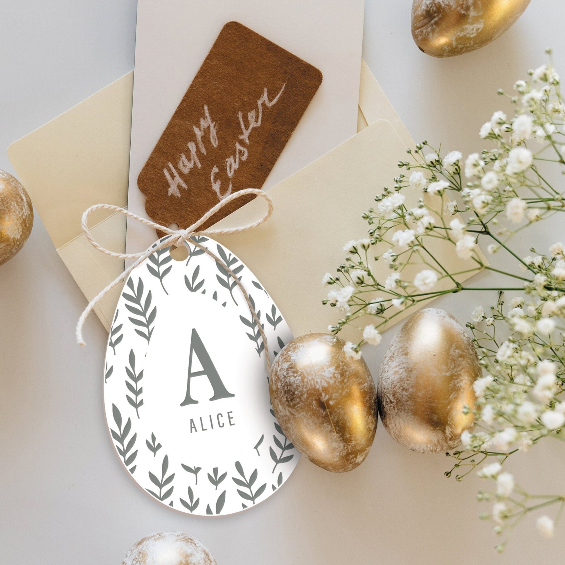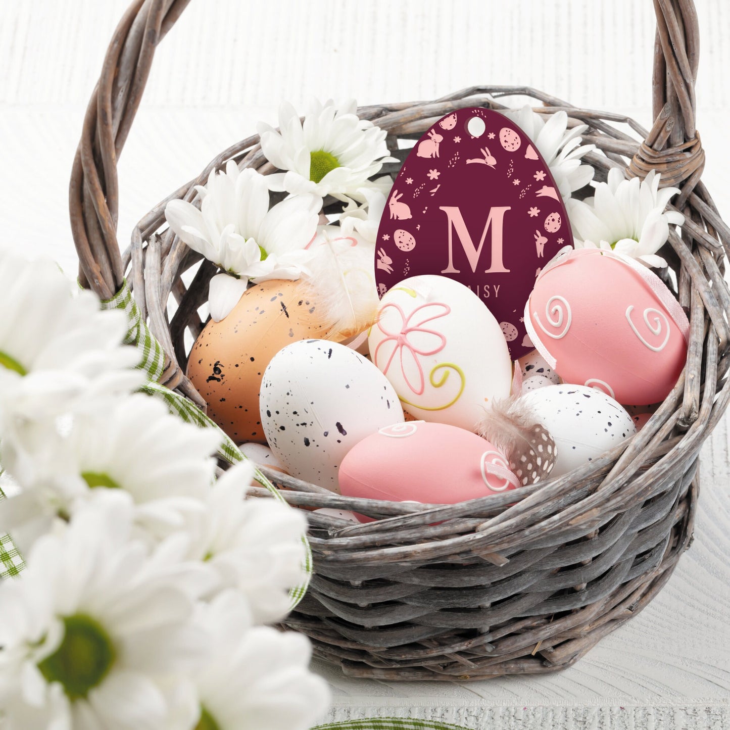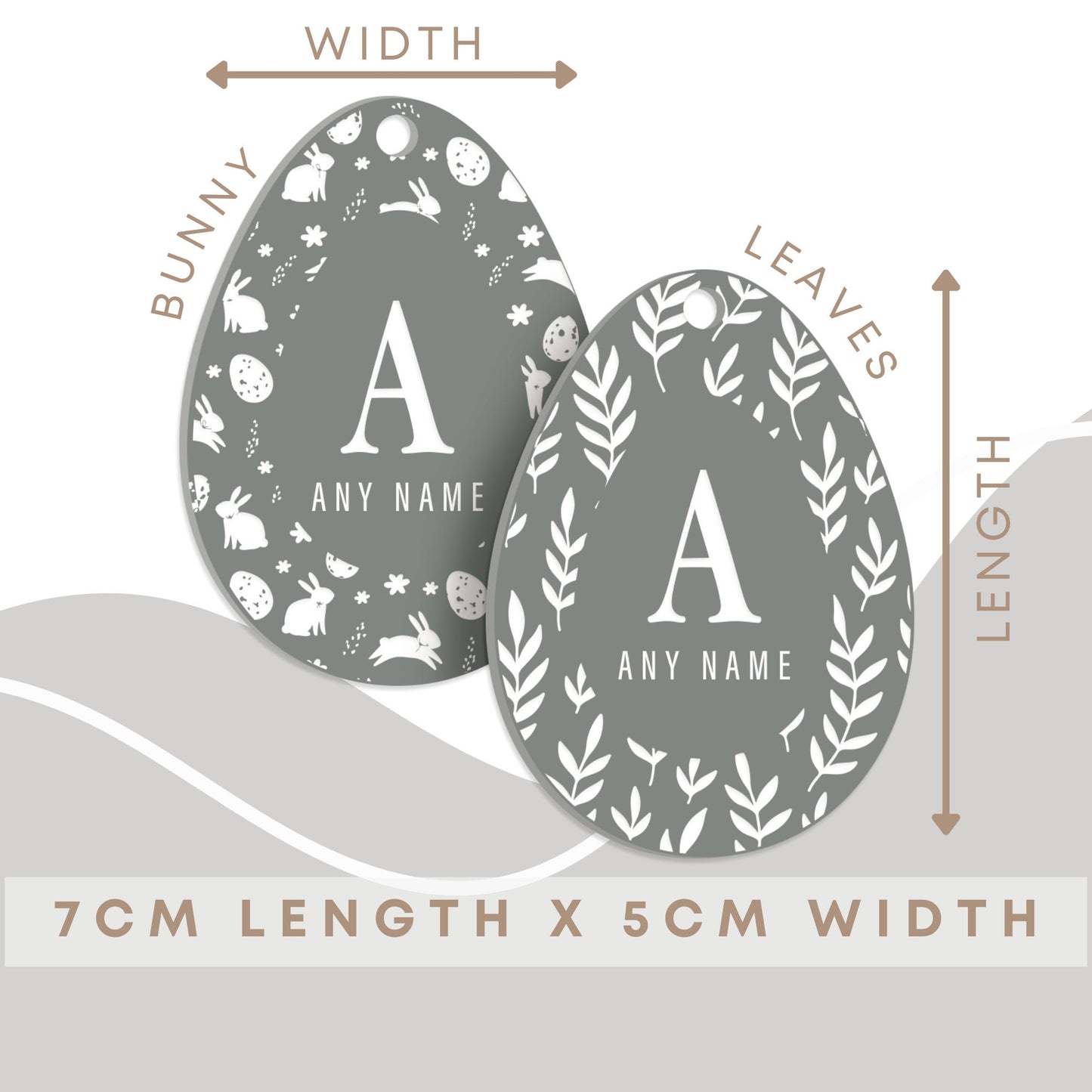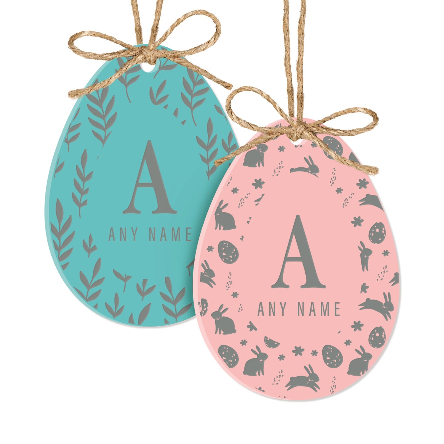 Personalised Patterned Easter Egg Tag: Leaf or Bunny Design, Acrylic Plastic Egg, Custom Initial & Name, Great Easter Gift Basket Tag