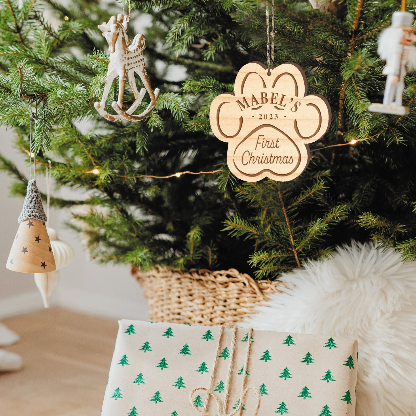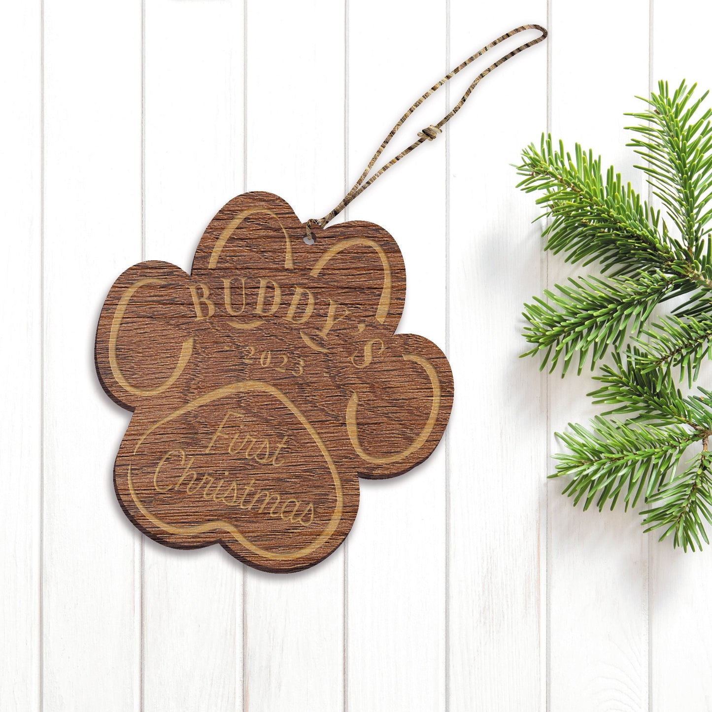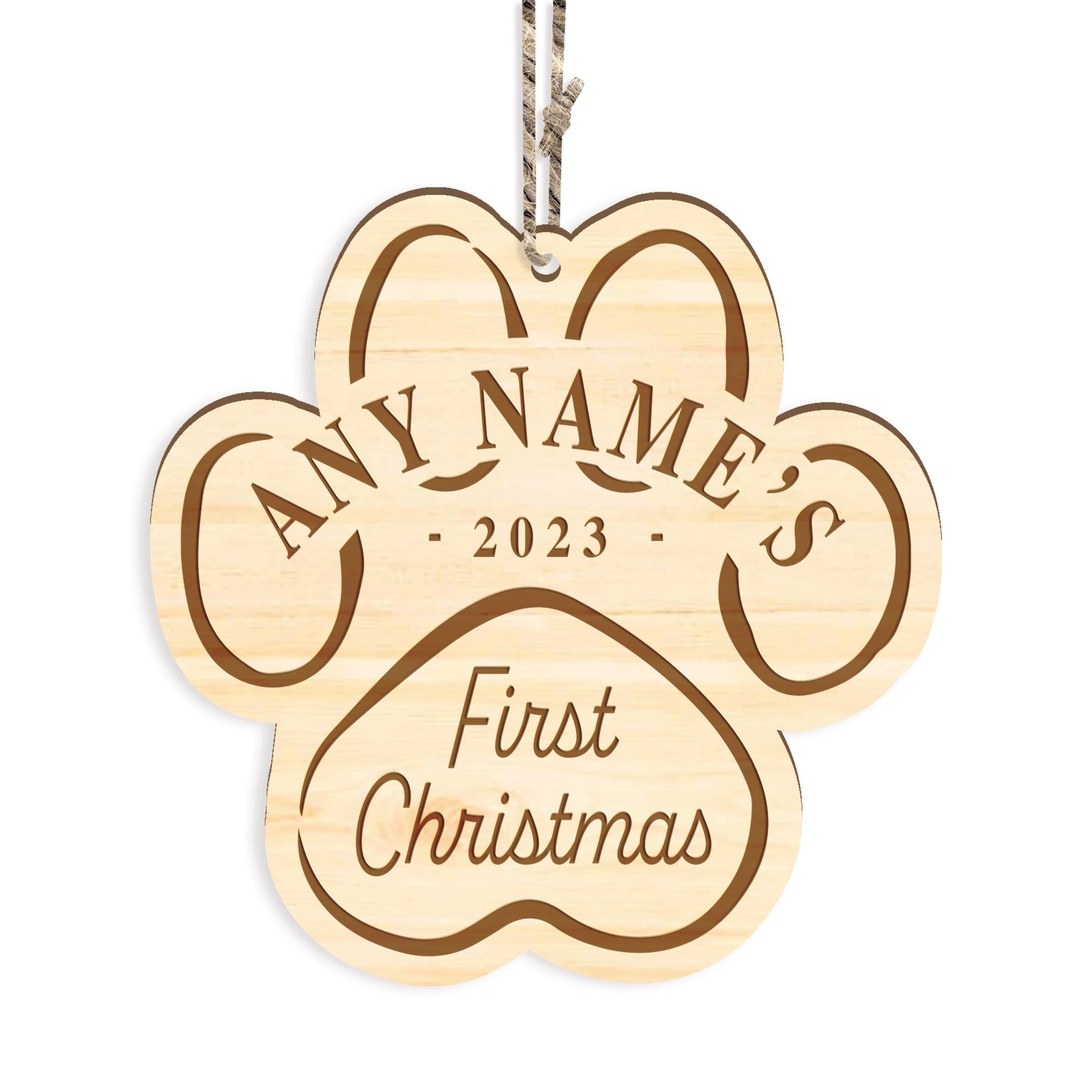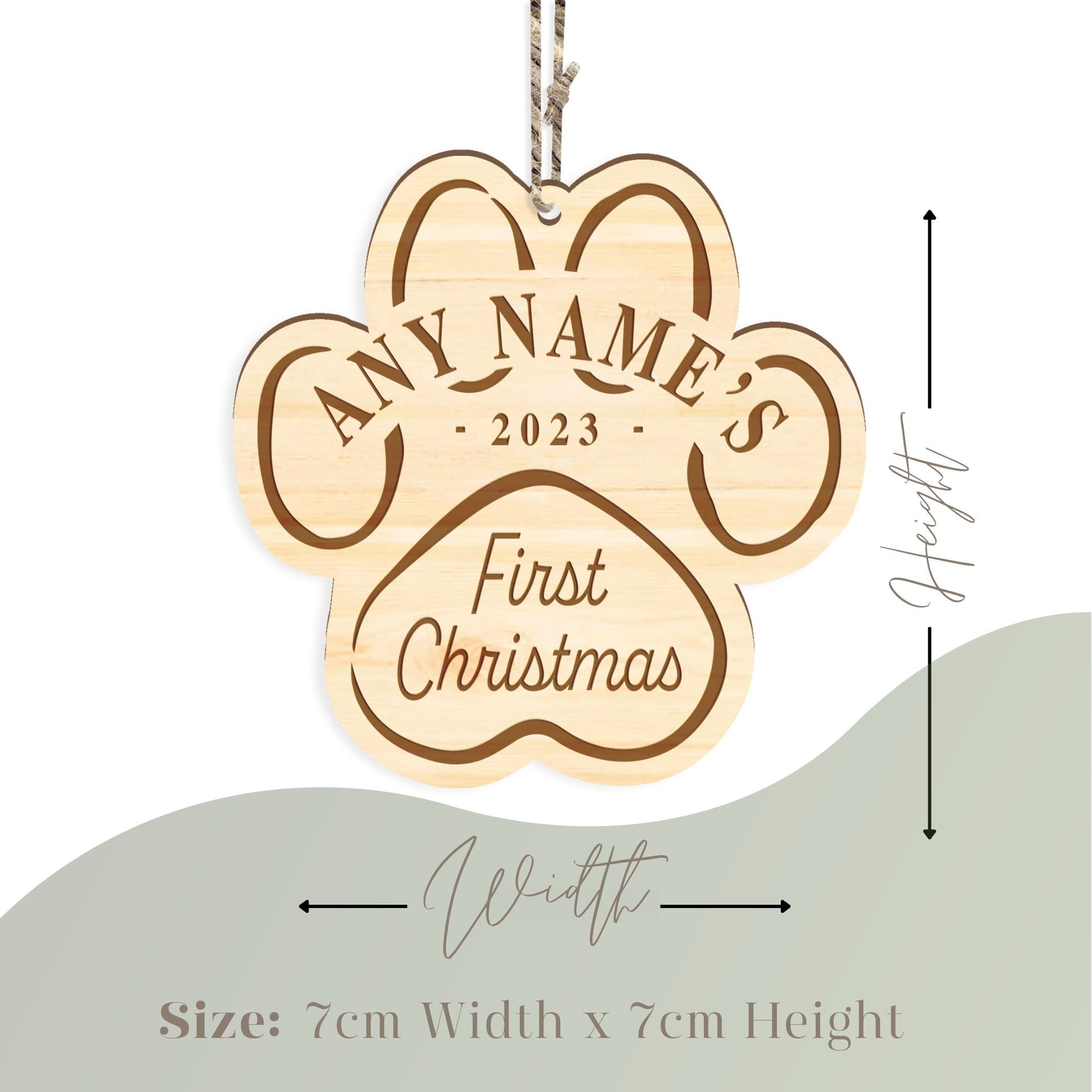Personalised Paw Print First Christmas Ornament - Custom Pet Name, Rustic Dog/Cats first Christmas Tree Decor, Wooden Xmas Bauble Decoration