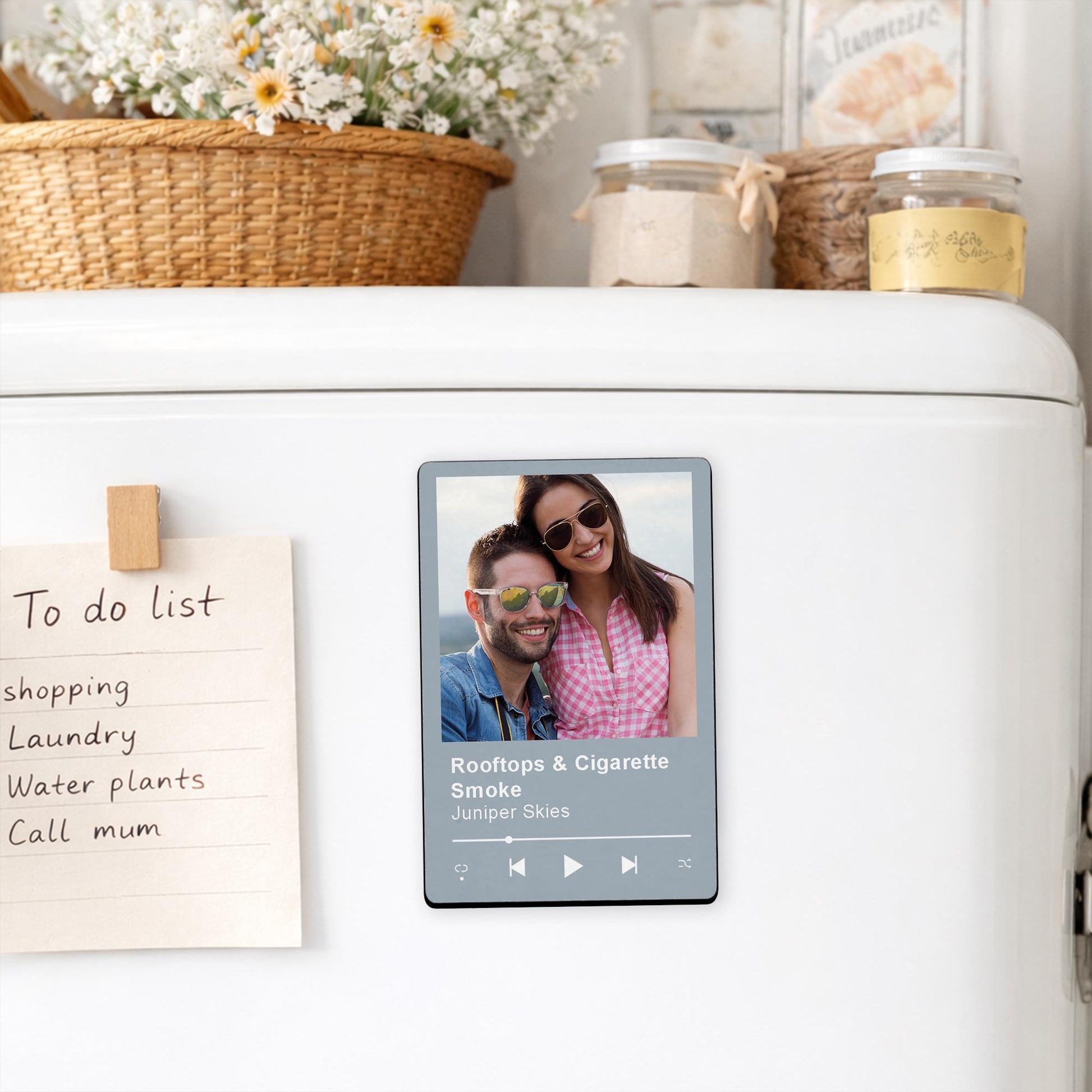 This personalised photo and song magnet is designed to look like a modern music player screen, featuring your chosen image, song title and artist — all printed onto a glossy hardboard magnet that’s perfect for fridges, lockers, filing cabinets or magnetic boards.