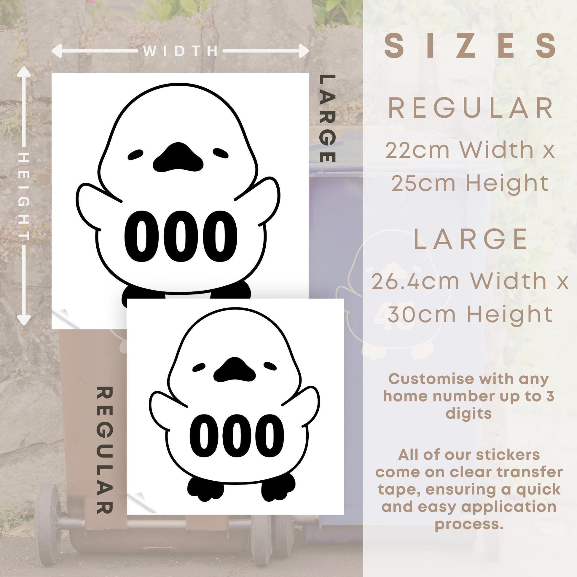 Make your bin stand out with this adorable Duck Bin Sticker! Featuring a charming, cartoon-style duck design, this sticker is perfect for adding a splash of personality to your wheelie bin. Customisable with your house number (up to 3 digits), this sticker helps you keep track of your bin while bringing a smile to the neighbourhood.