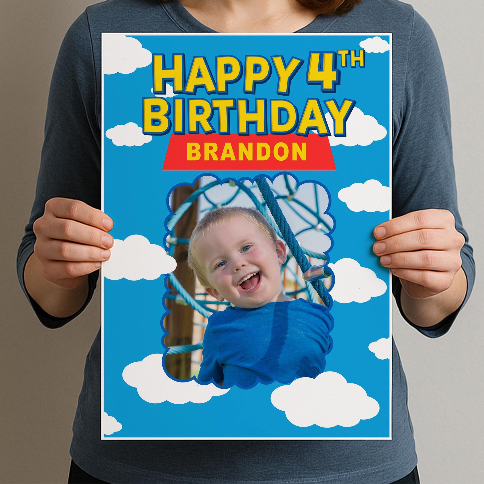 Celebrate your childs big day with this sky-high Toy Land-inspired birthday banner! Featuring a bright blue sky with cartoon-style clouds and a fun font design, this poster is personalised with their name and photo perfect for fans of imaginative play and adventure.