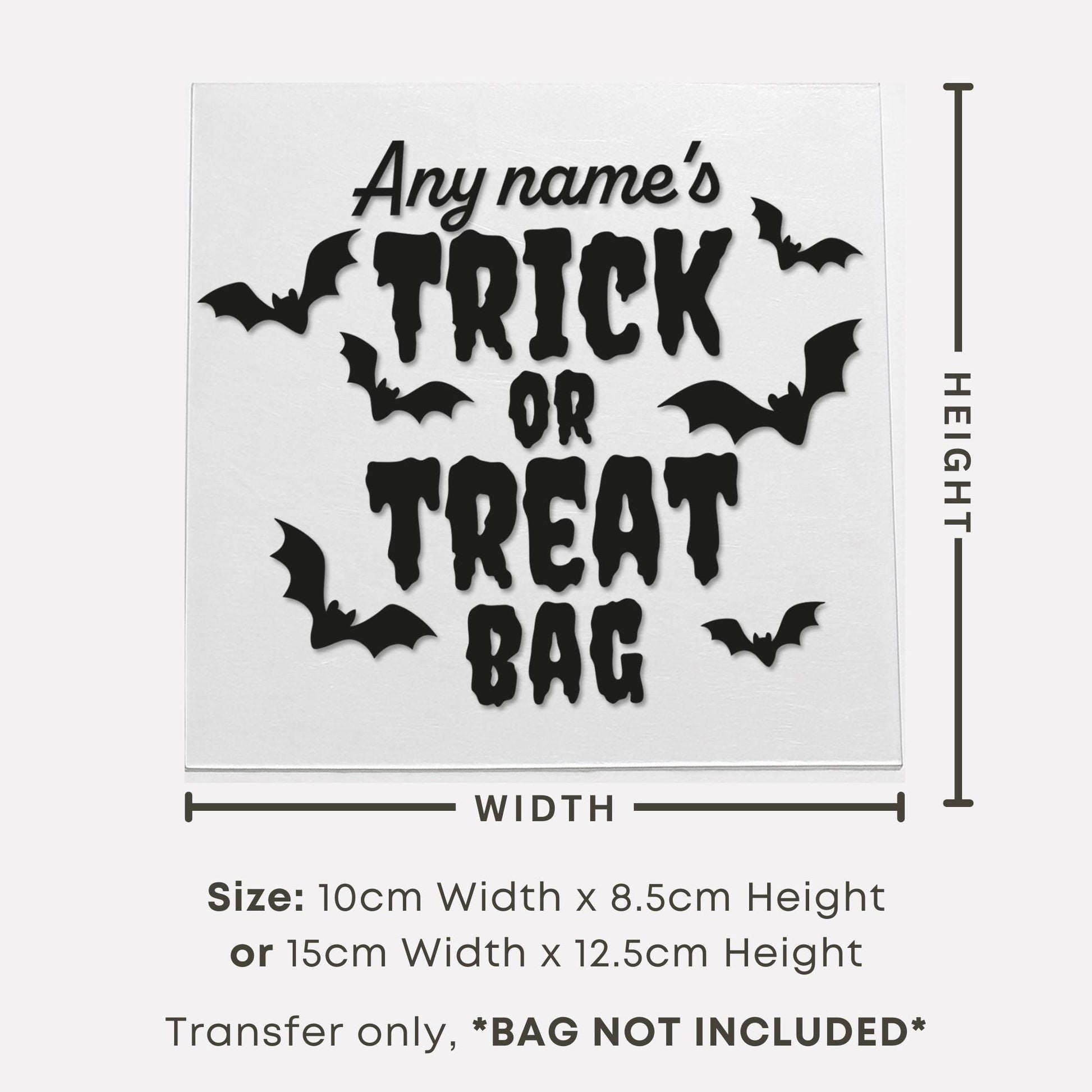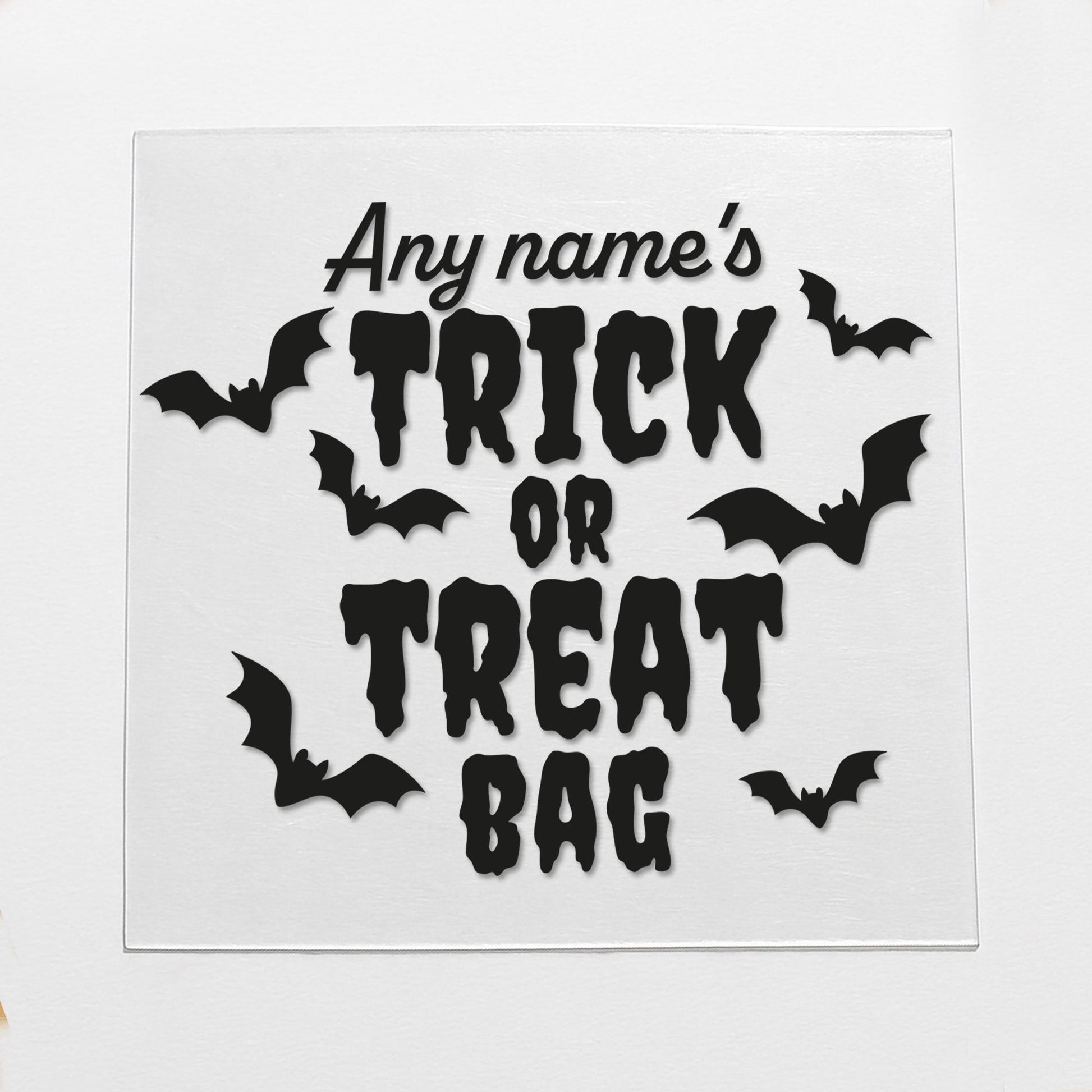 Get Halloween-ready with this personalised Trick or Treat Bag iron-on vinyl transfer, perfect for creating a unique and spooky candy bag for your little one. Featuring bold “Trick or Treat Bag” lettering surrounded by flying bats, this design can be customised with any name up to 8 characters, making it extra special for Halloween night.