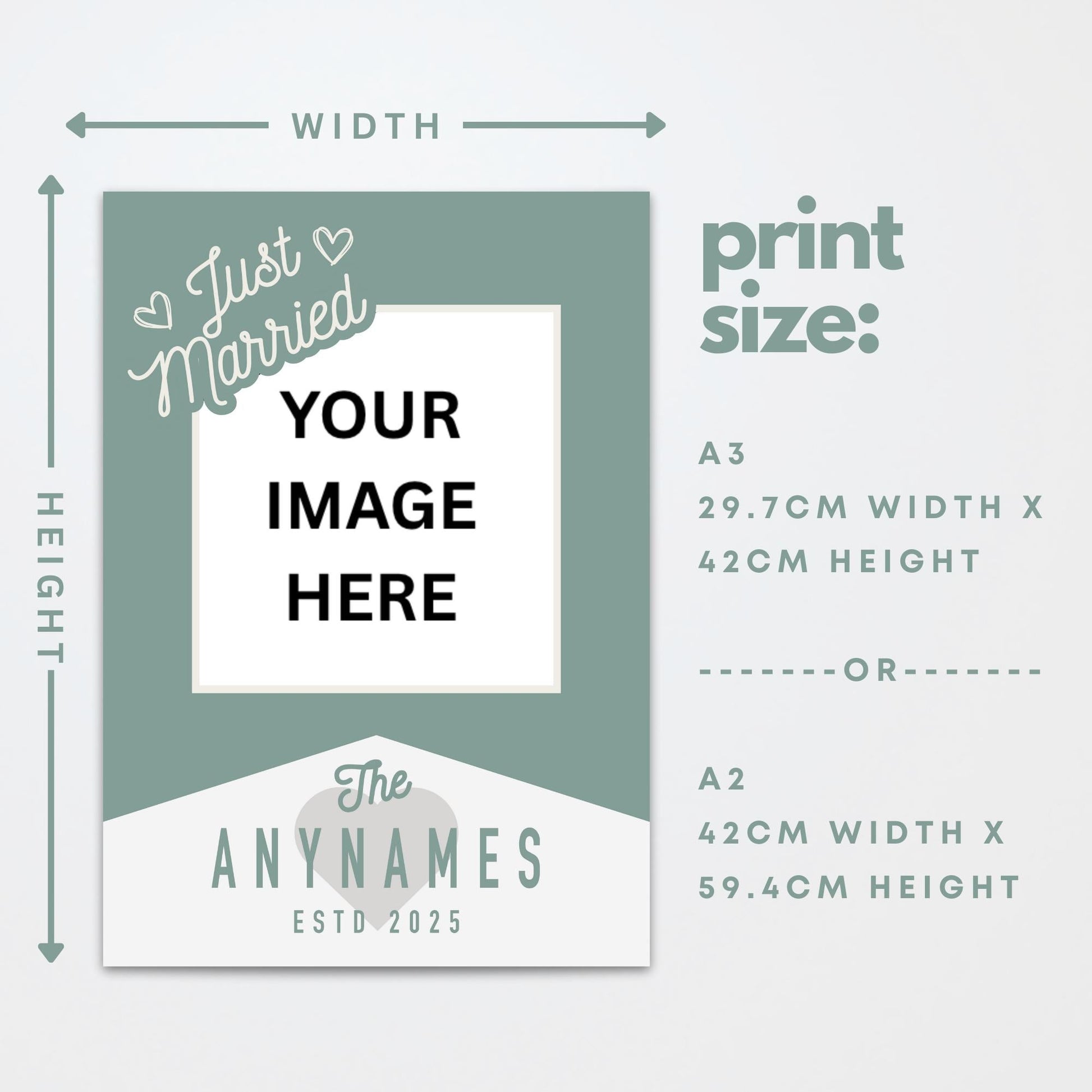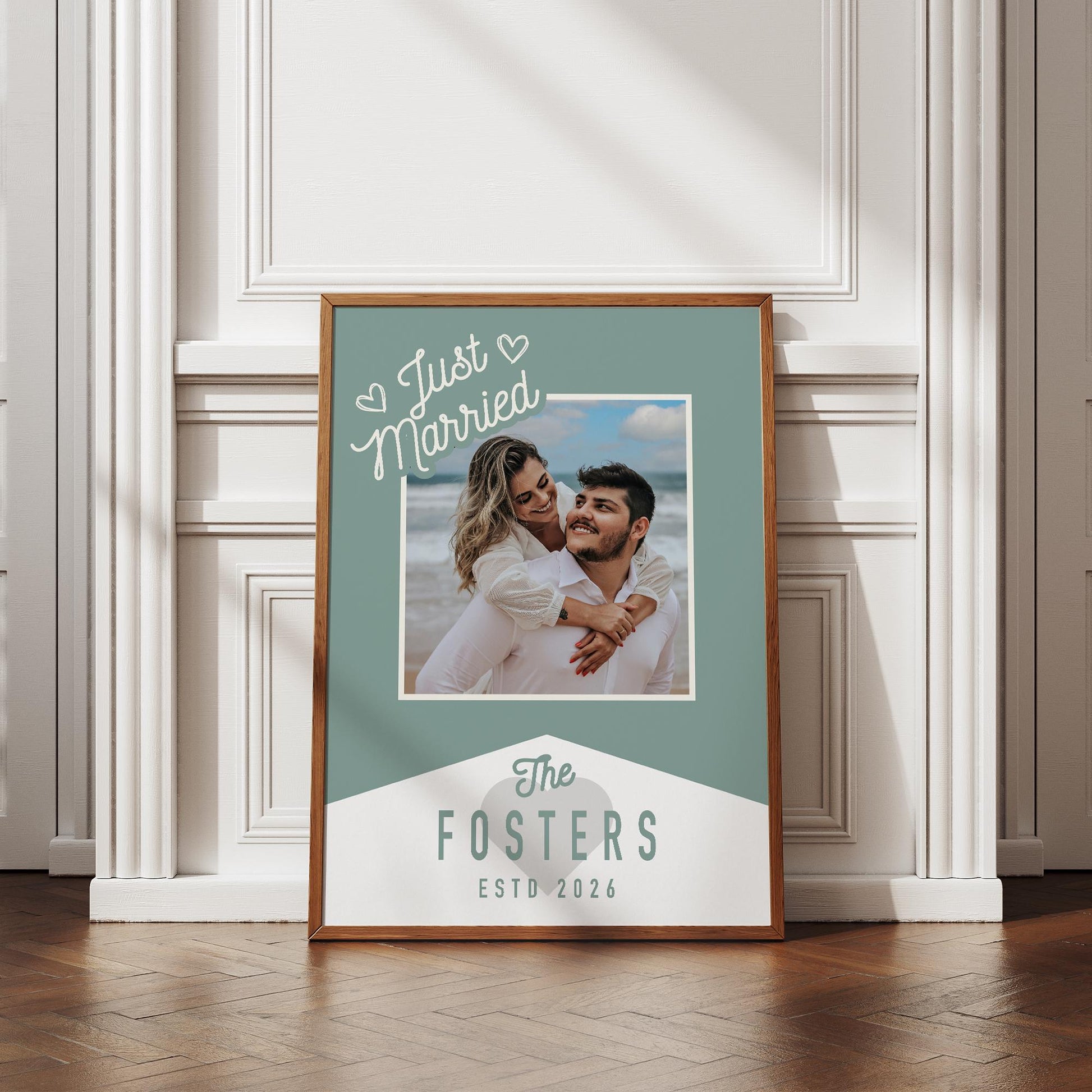 Personalised Wedding Photo Print Retro Green “Just Married Custom Poster with Photo, Surname & Year Wedding Reception Party Decor