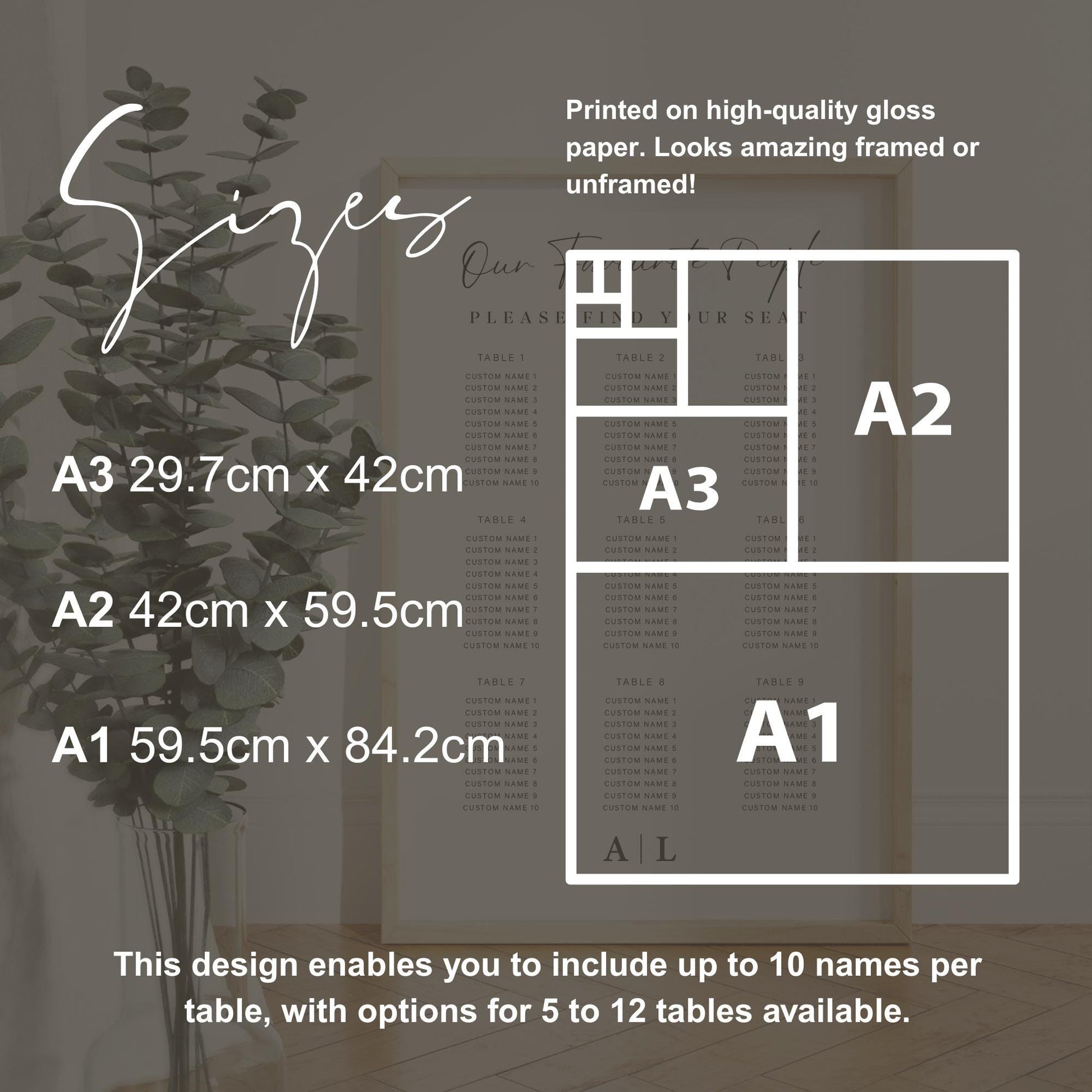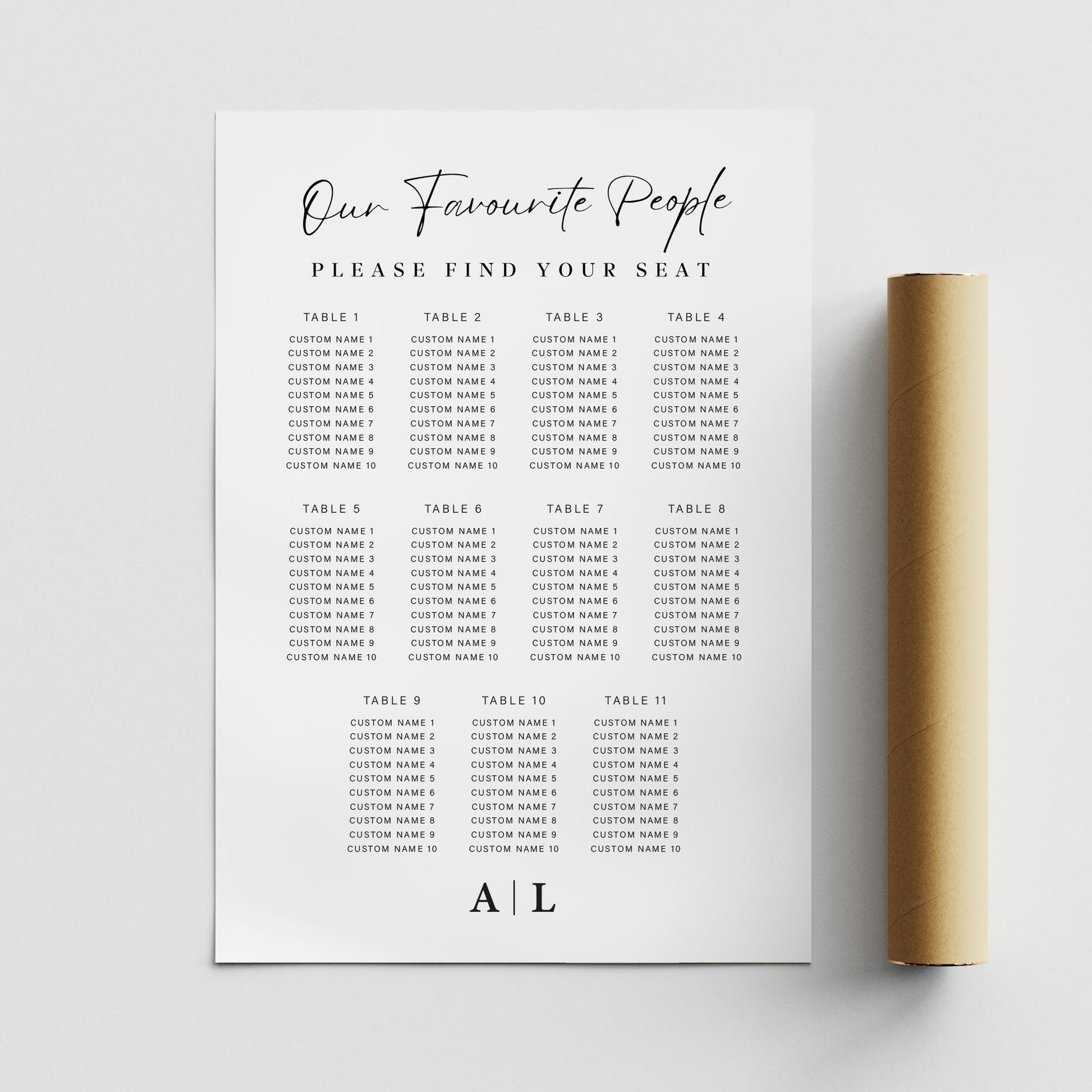 Personalised Wedding Seating Plan Sign | Our Favourite People Table Chart Print for 512 Tables | Modern Black & White Wedding Decor