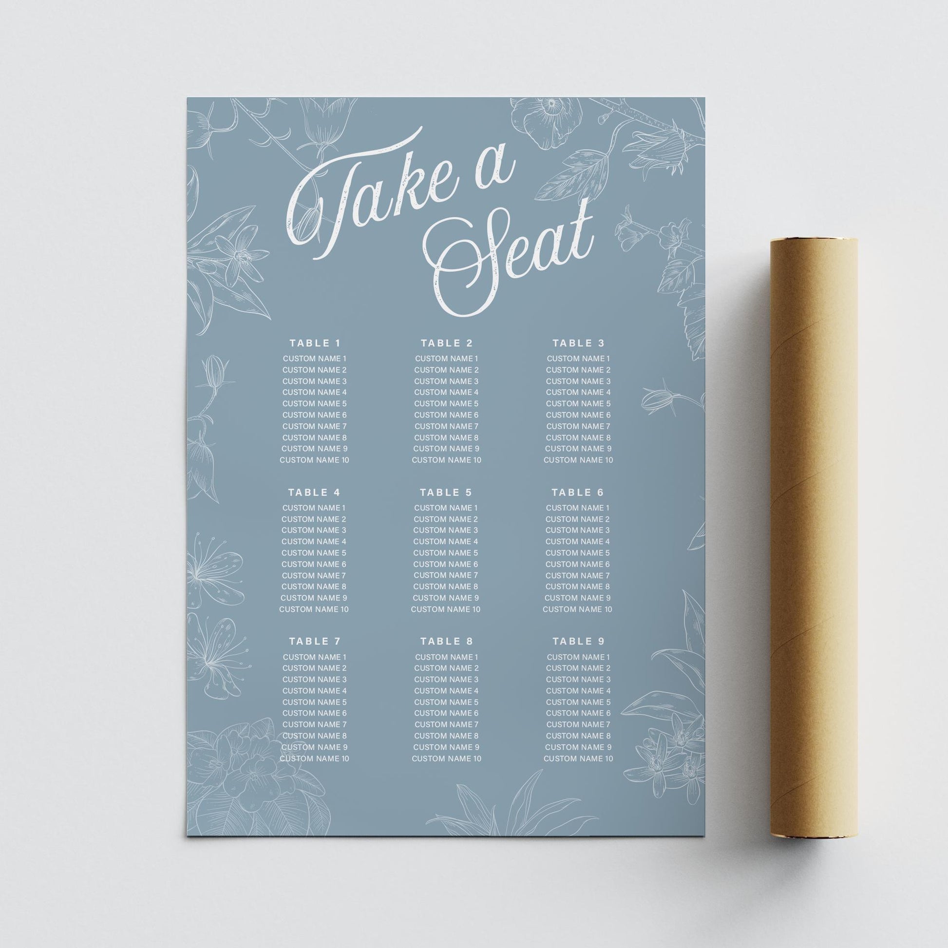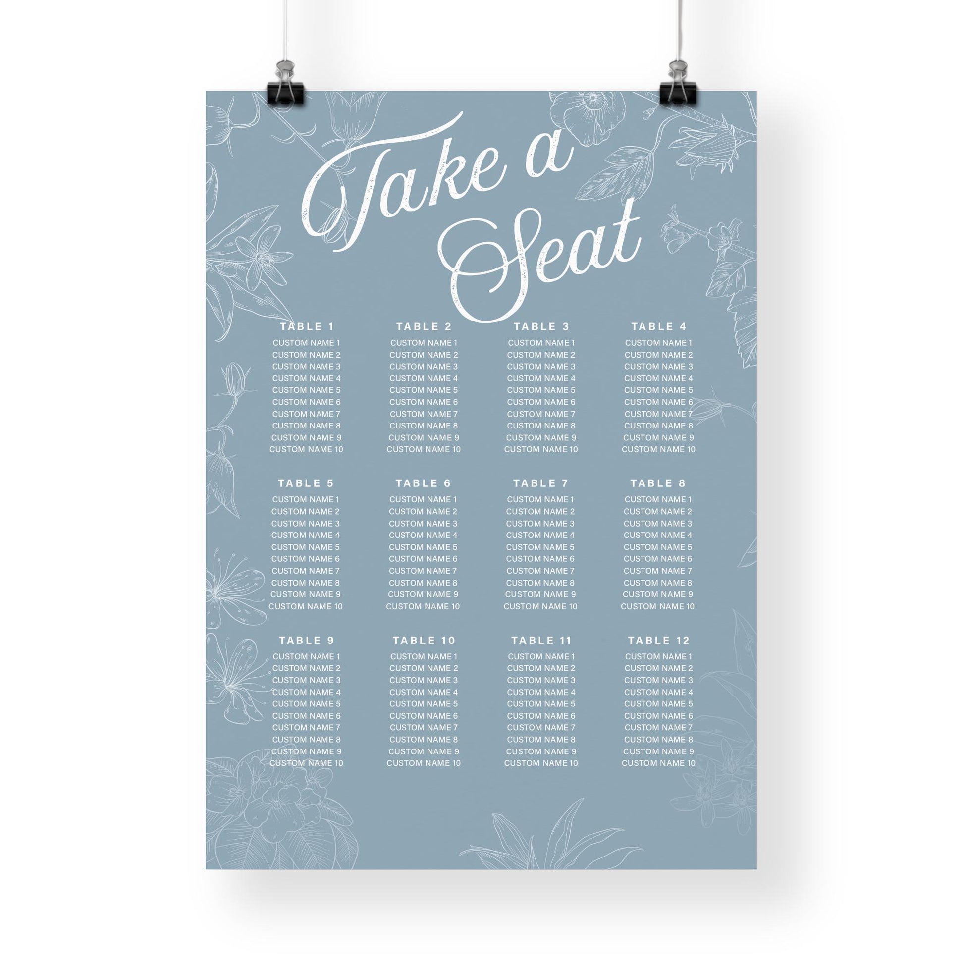 Personalised Wedding Seating Plan Sign | Take a Seat Blue Floral Print | Custom Table Chart for 512 Tables, Elegant Wedding Sign Poster