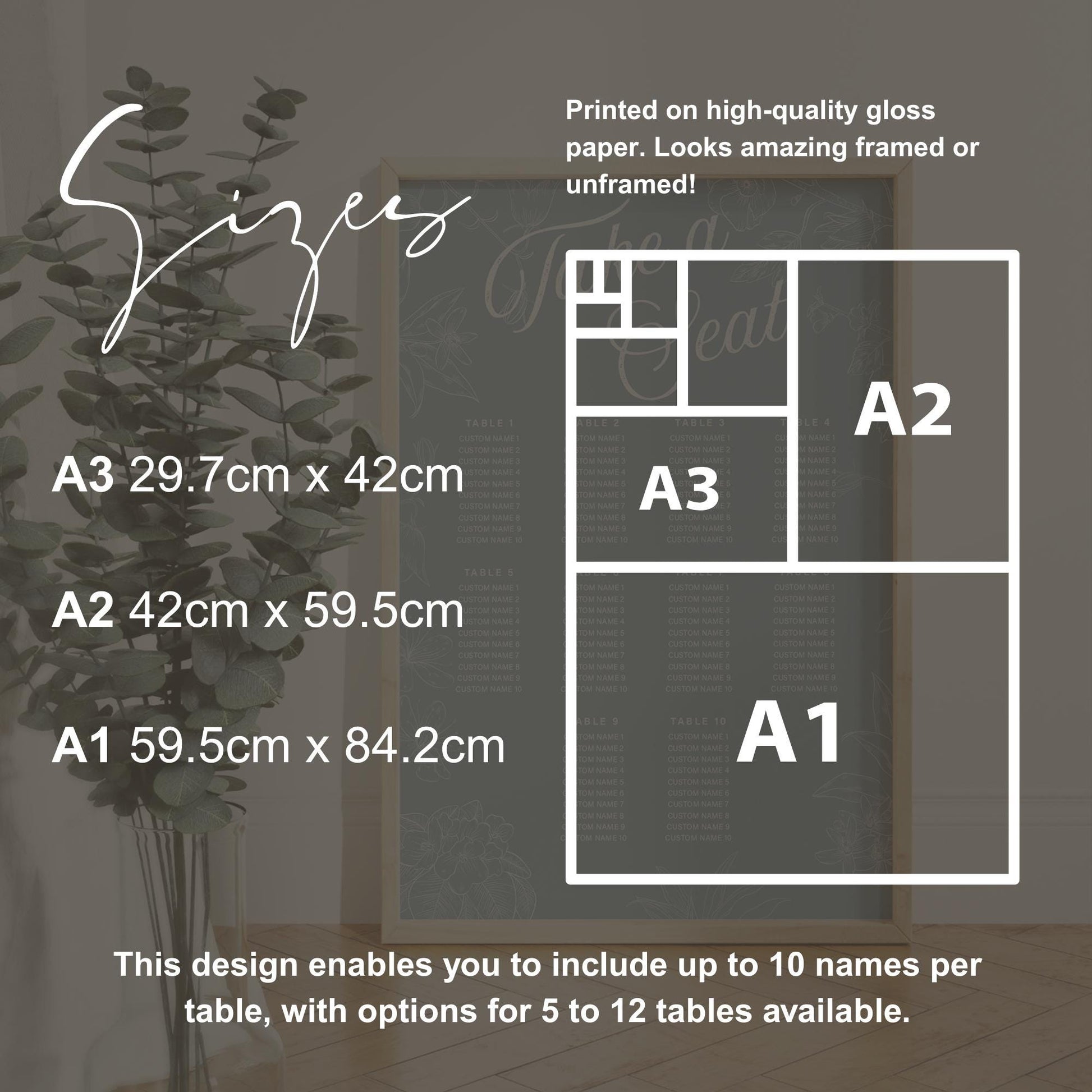 Perfect for weddings of any season, this seating plan is available in multiple sizes and tailored to your specific table layout simply choose from 5 to 12 tables and we‘ll personalise it with your guest list.