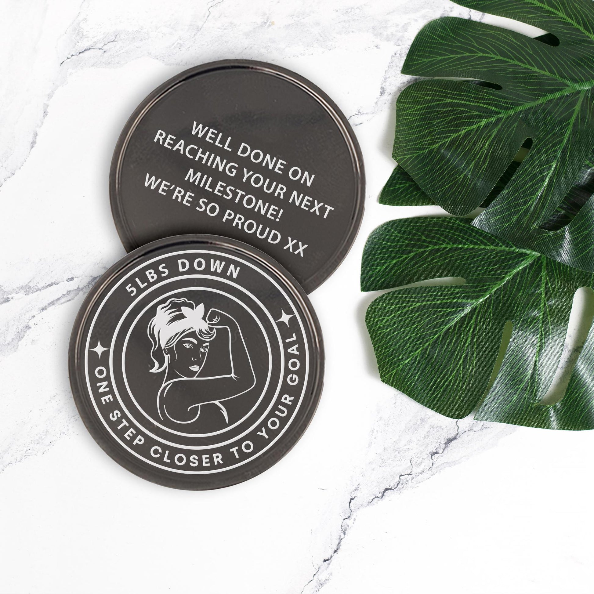 Custom engraved with your chosen milestone (e.g. “5 lbs down, “1 stone down, “5 kg down) and finished with the empowering phrase “One Step Closer to Your Goal, its a meaningful token of progress. Add your own short message to the reverse to make it even more special.