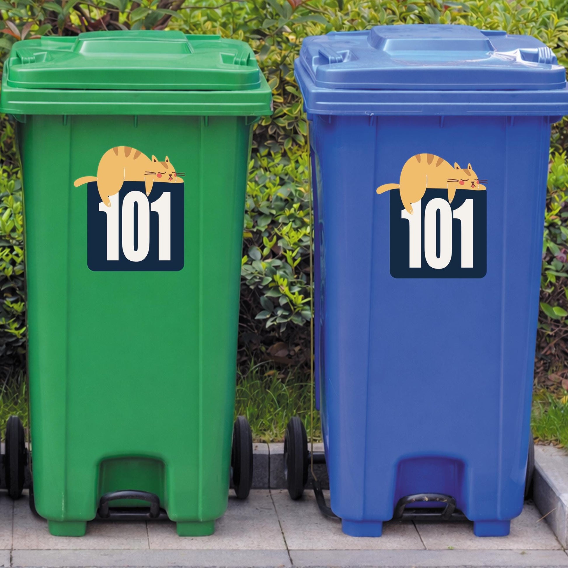 This personalised bin sticker combines a bold house number with a charming sleeping cat illustration that stretches across the top of the design. The large, easy-to-read numbers make it simple to spot your bin at a glance, while the cute cat adds a unique and light-hearted detail.