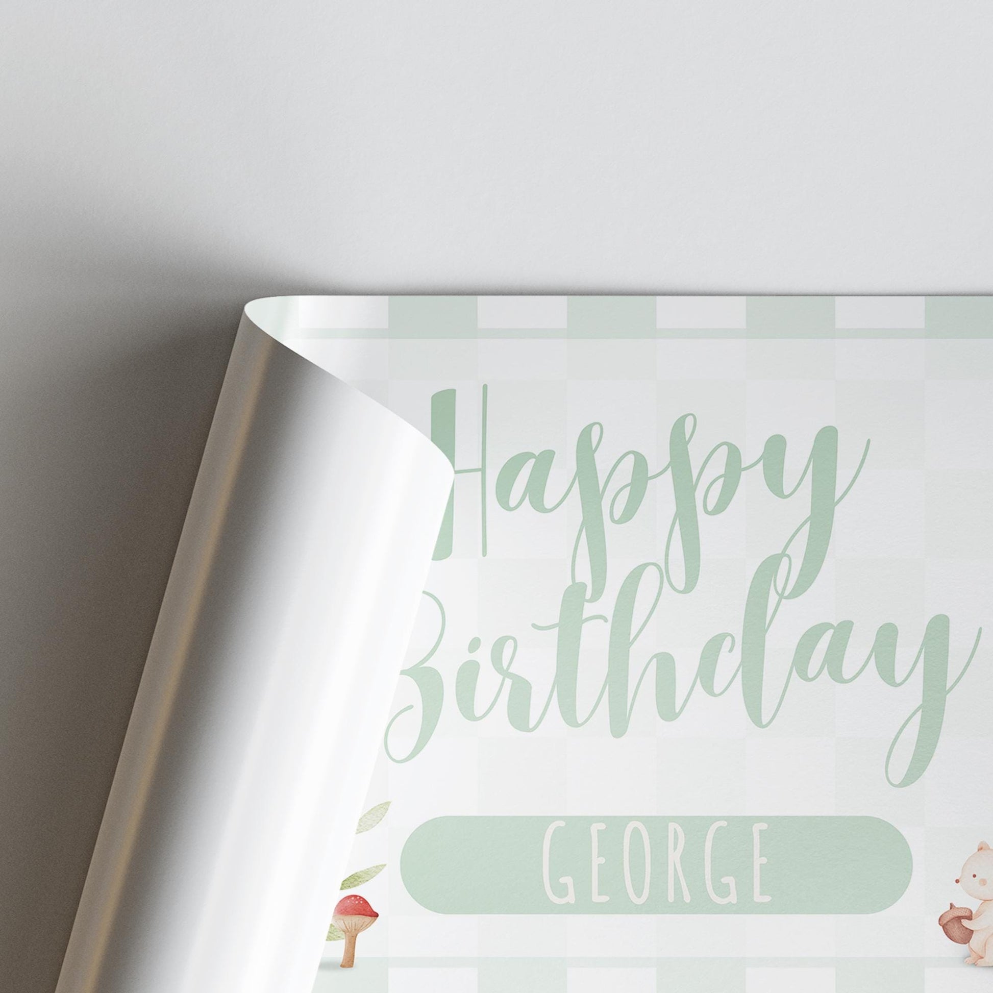 Bring a touch of woodland magic to your child’s birthday celebration with this personalised woodland birthday banner. Featuring adorable forest animals – including a bear, fox, and raccoon – along with soft green tones and floral accents, this banner creates a charming rustic party backdrop.