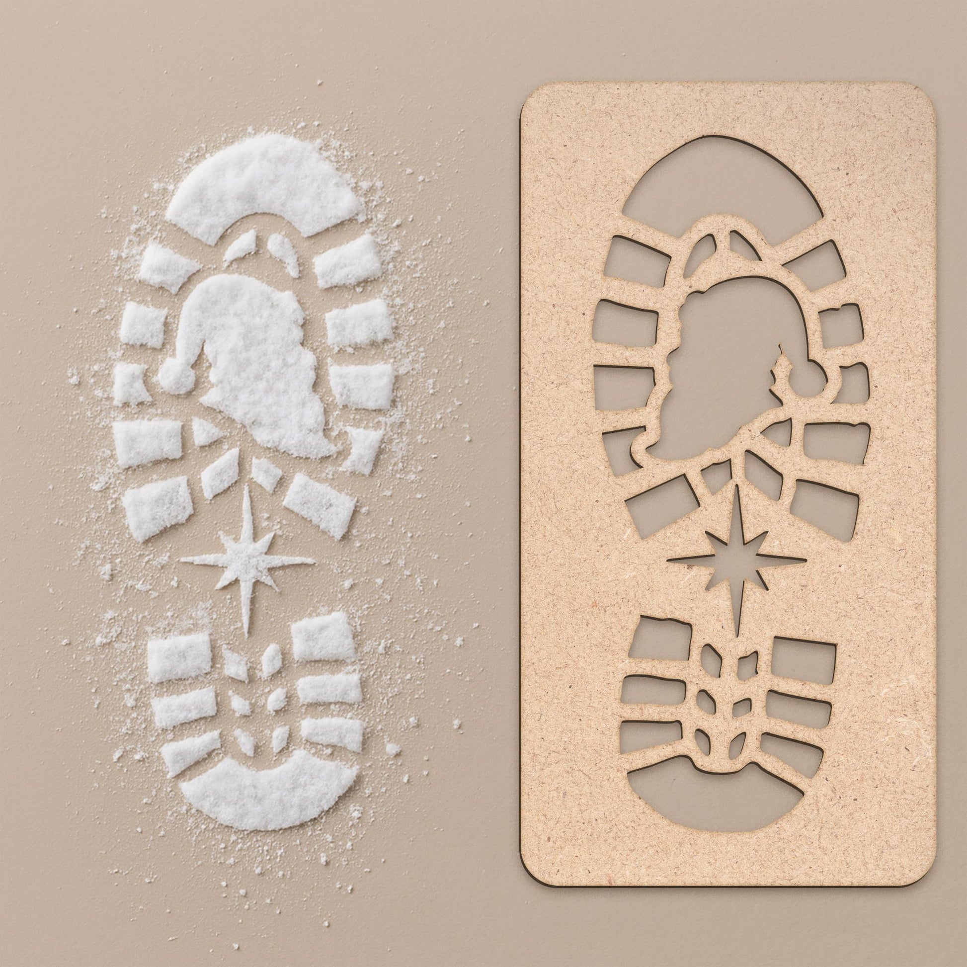 Bring Christmas morning magic to life with this Santa Boot Print Stencil — the perfect way to surprise little ones with “proof” that Father Christmas has visited! Simply place the stencil on the floor and dust over it with flour, icing sugar, or fake snow to leave behind realistic Santa footprints. Made from durable 3mm laser-cut MDF, this stencil can be reused year after year for a festive tradition your family will adore.