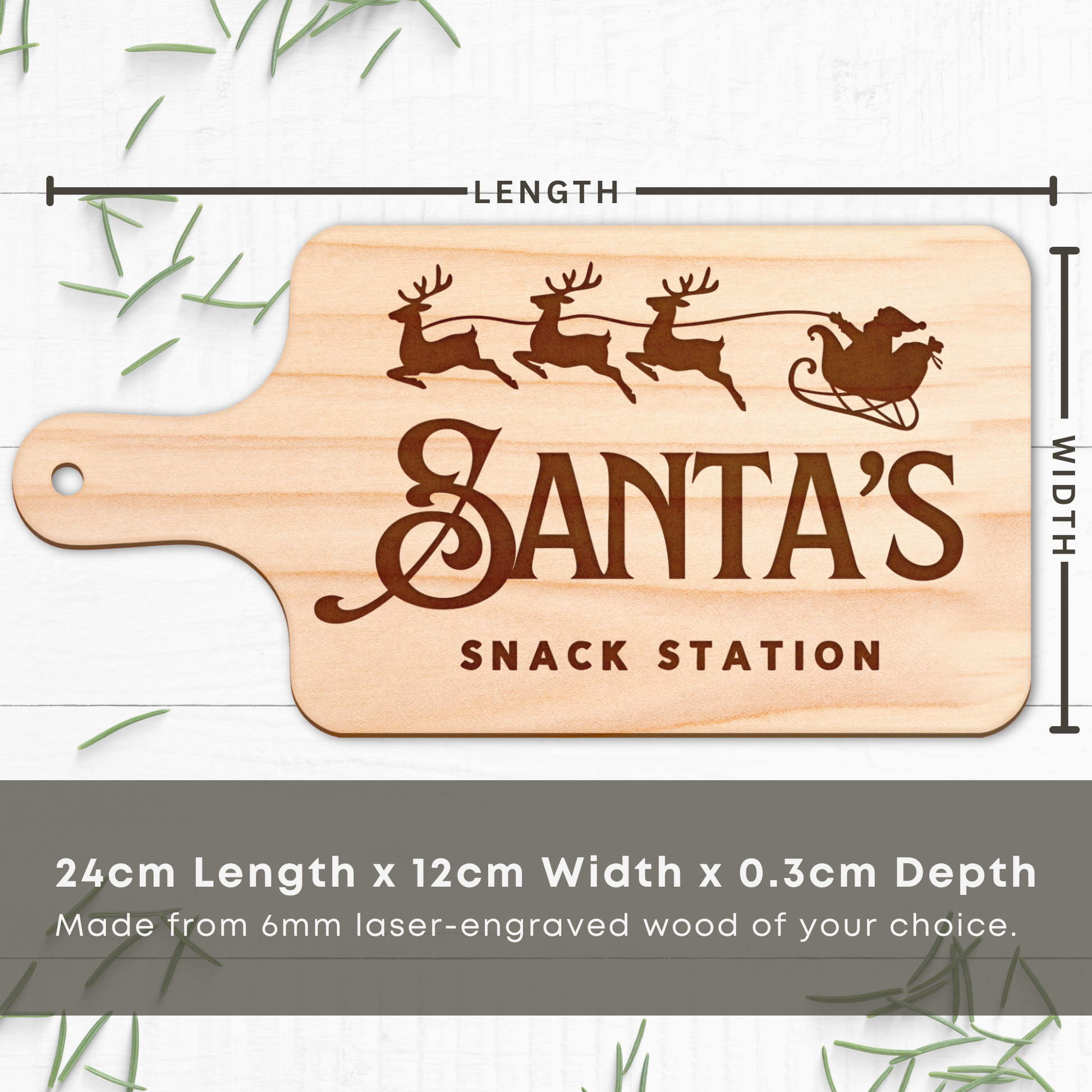 Make Christmas Eve even more magical with this Santa’s Snack Station board featuring Santa’s sleigh and reindeer. This festive tray is perfect for leaving Santa’s milk and cookies and a little carrot for Rudolph. Each one is laser-engraved on 6mm solid wood and available in maple, oak, walnut, cherry, sapele, or white ash. Please note: wipe clean only, not dishwasher or water safe.