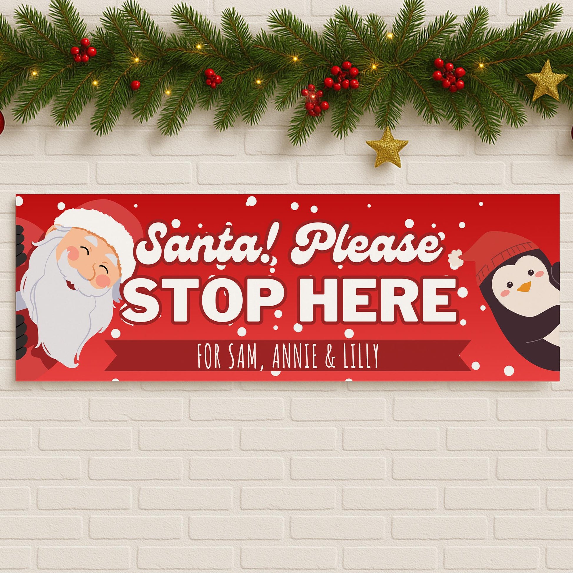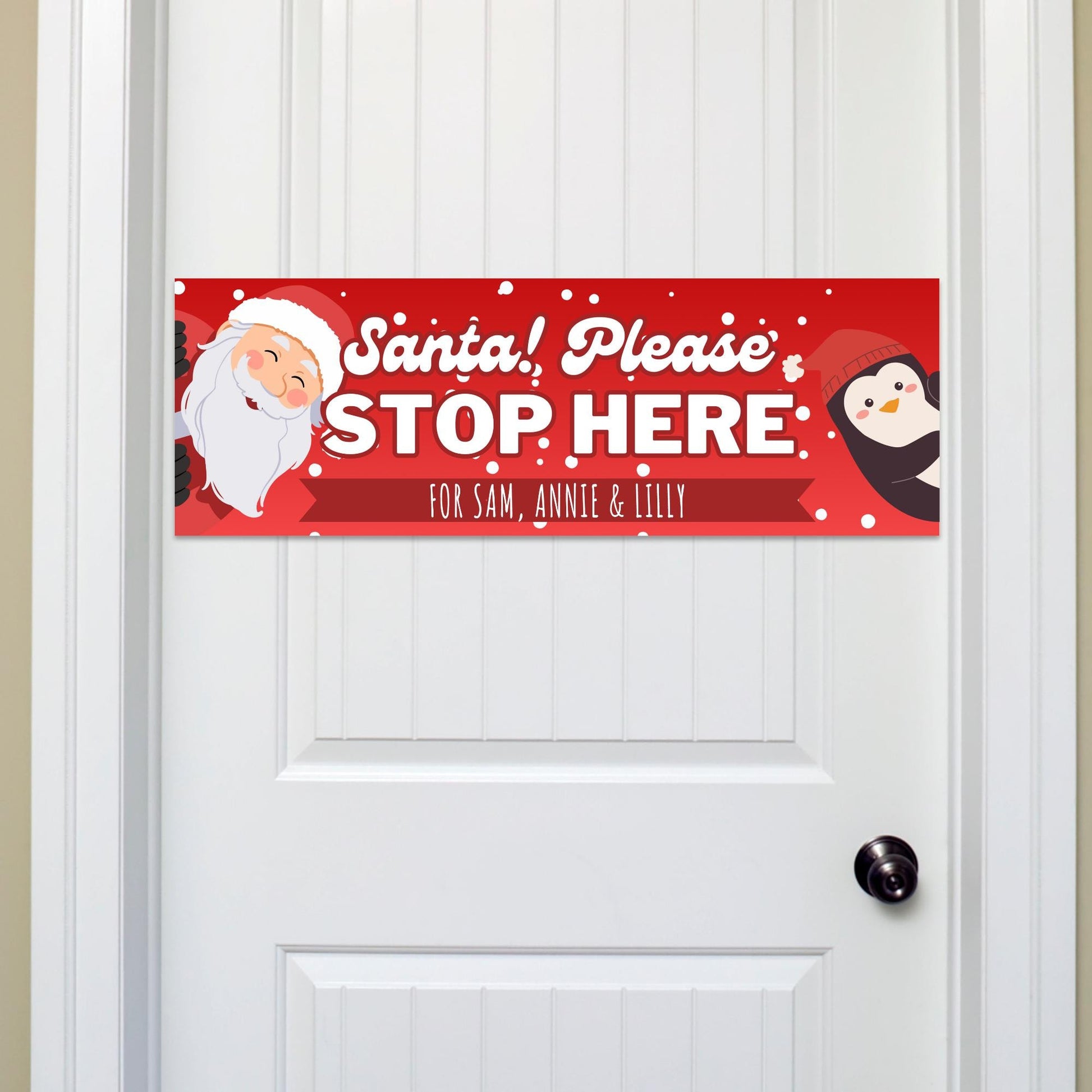 Santa Stop Here Personalised Banner Santa & Penguin Design Custom Christmas Decoration for Young Kids Up to 3 Names Cute Xmas Gift