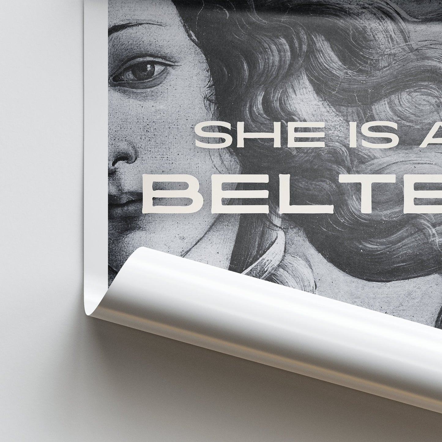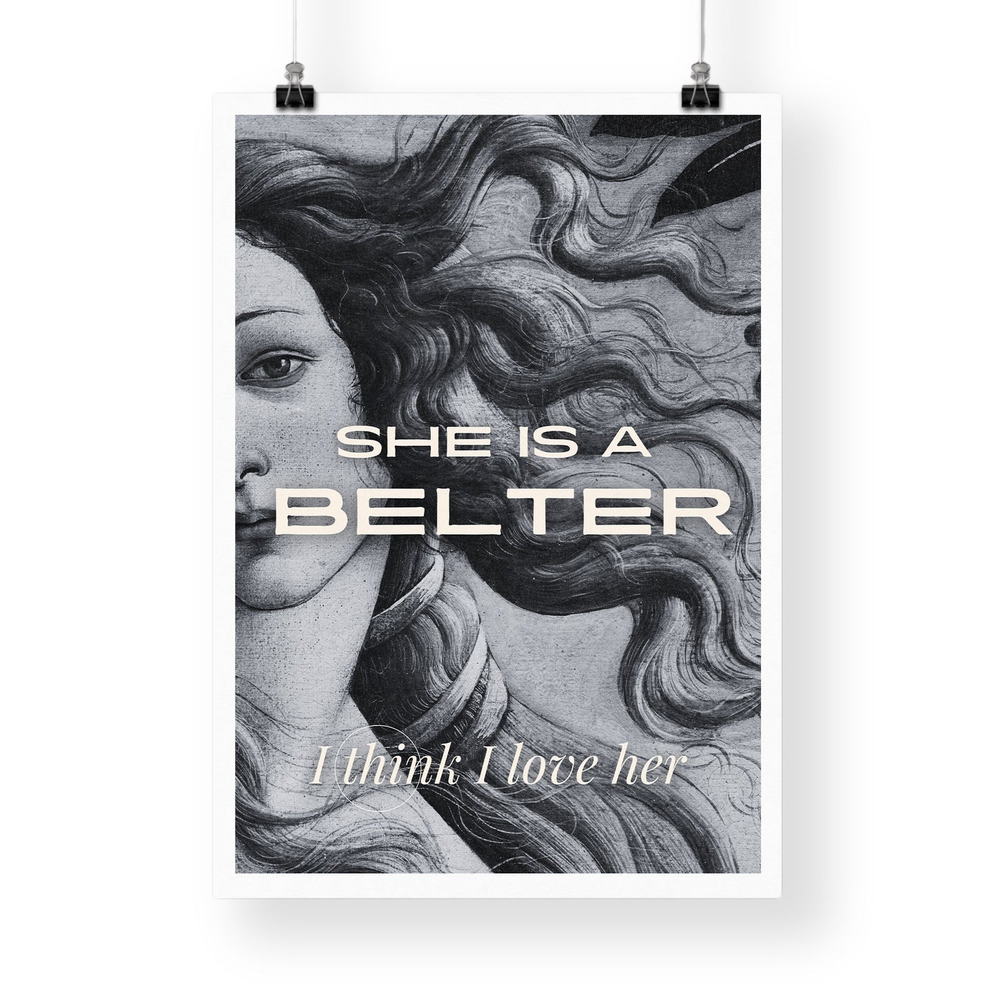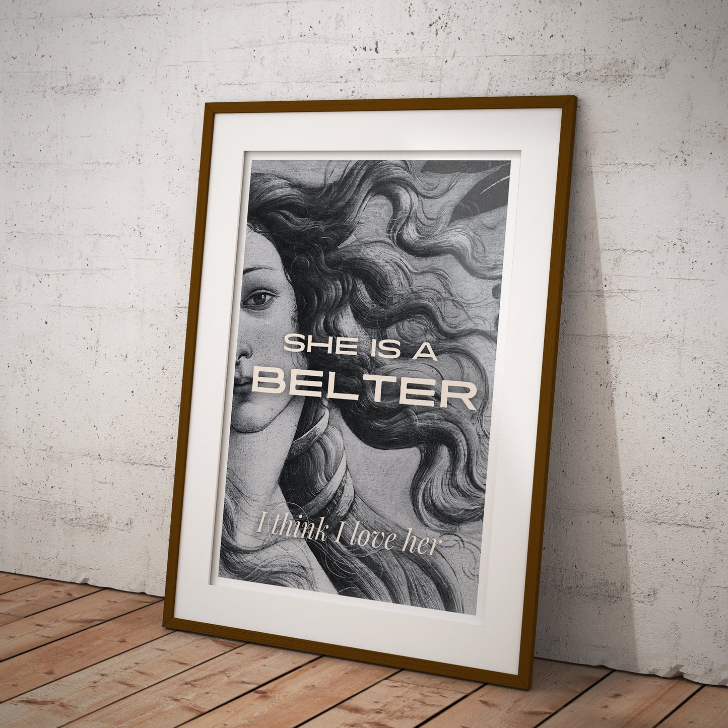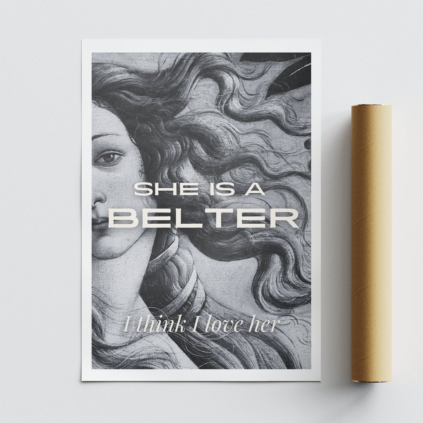Celebrate your love for iconic music with our "She Is A Belter" poster! Inspired by the beloved song, this bold typography wall art is a must-have for any fan. Featuring a striking design and the unforgettable phrase, it brings a touch of Scottish musical magic to your home decor.
