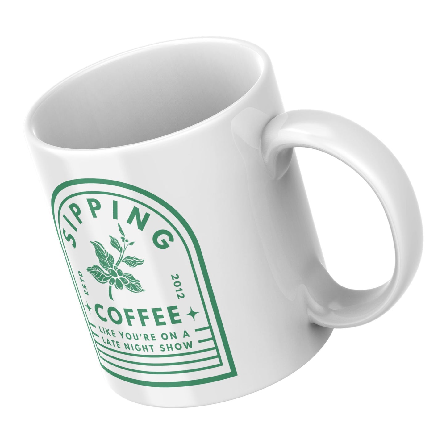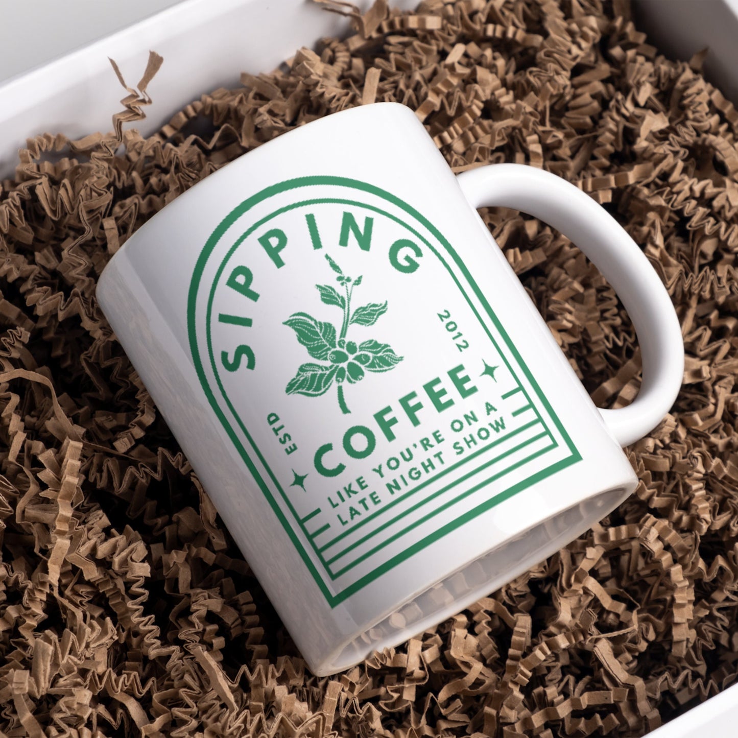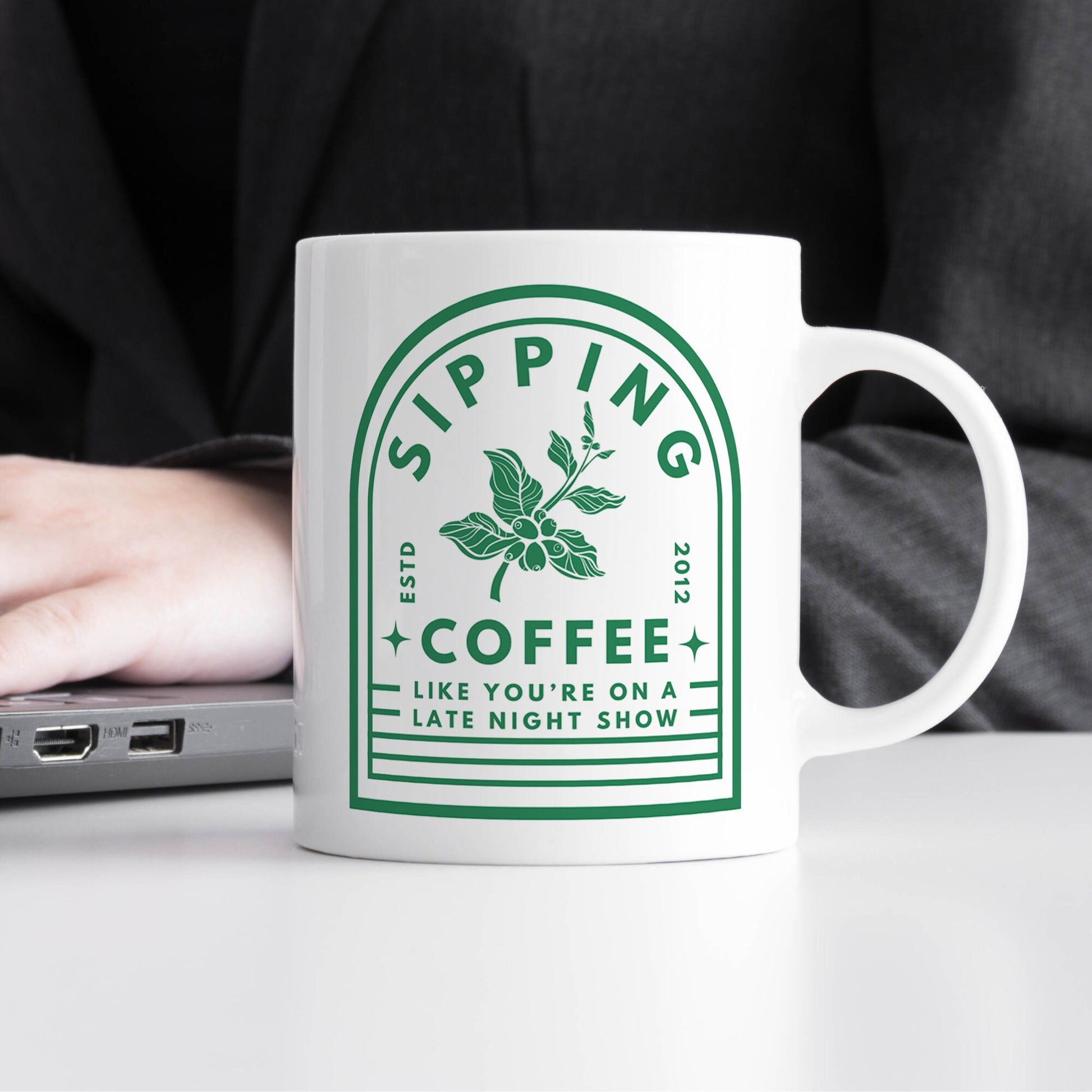 Elevate your coffee routine with our charming ceramic mug! It showcases the message "Sipping Coffee Like You‘re on a Late Night Show". The perfect lyric inspired gift.