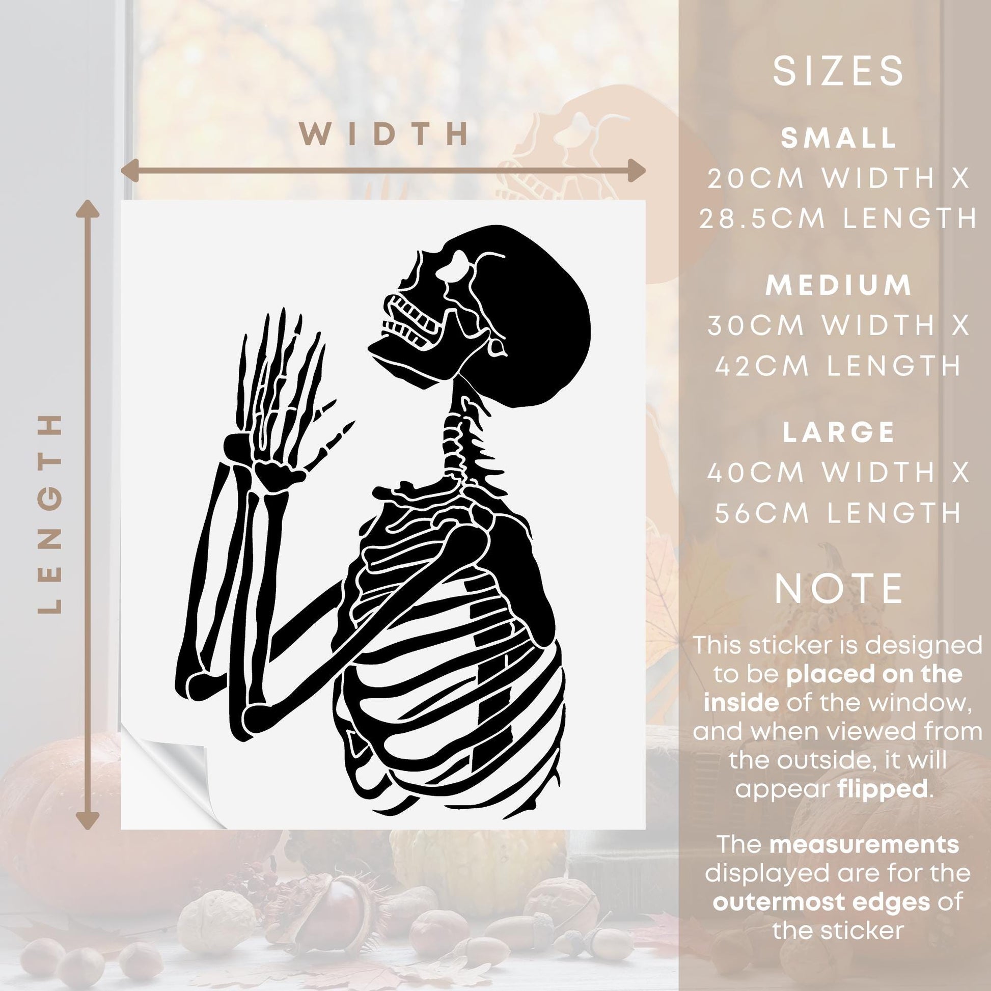 Elevate your Halloween decor with this eerie Skeleton Window Sticker, perfect for adding a touch of spooky charm to your home. Please note, the image will appear flipped when viewed from outside, making it an eye-catching addition to your Halloween decorations. Ideal for windows, mirrors, and glass doors, this skeleton decal is the perfect Halloween-themed decoration for any room. Bring the spirit of the season into your home with this unique sticker!