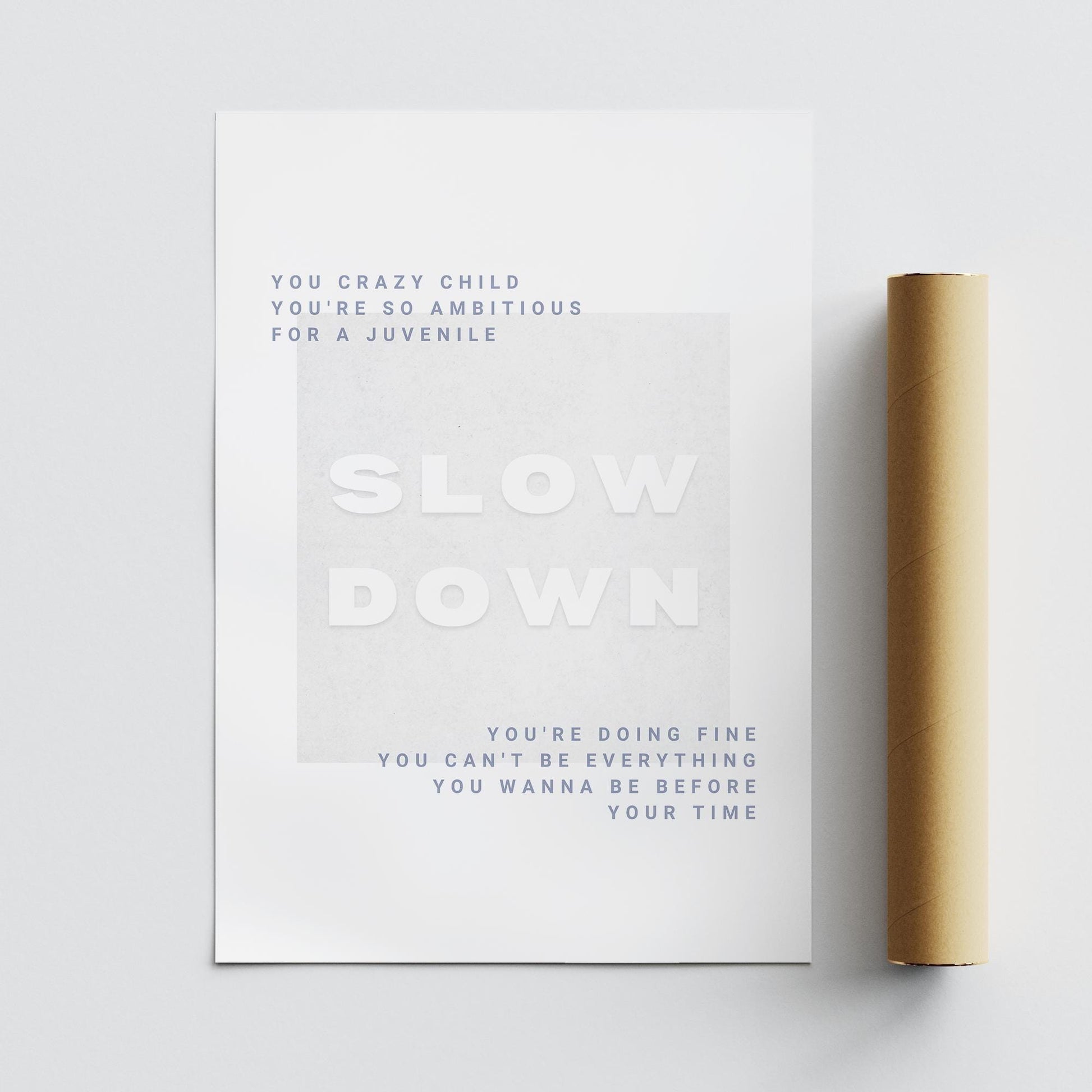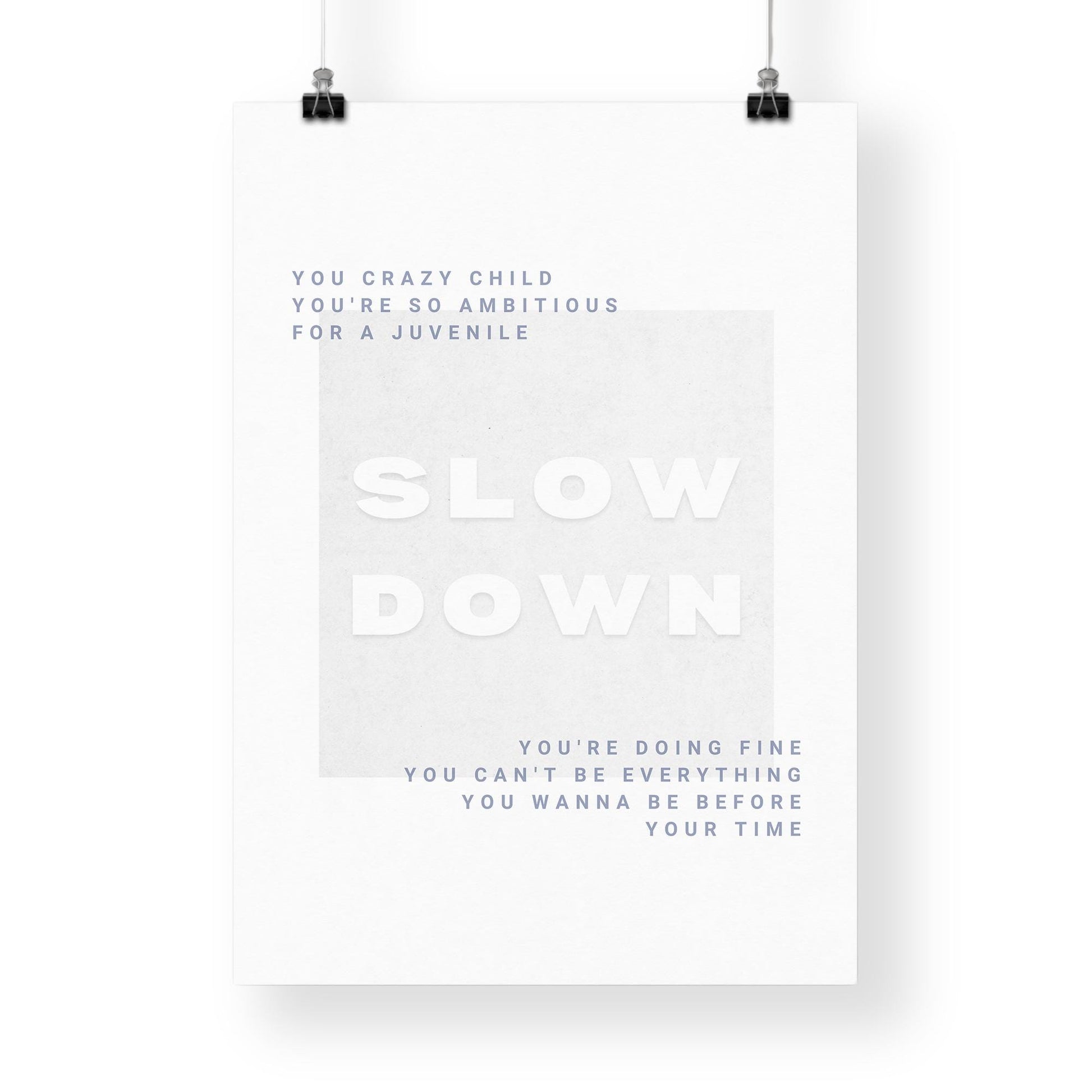 With clean grey typography and subtle design, this lyric-inspired motivational print reminds you: “Slow Down, You’re Doing Fine.” A minimalist yet powerful piece of wall art that suits bedrooms, workspaces, or modern interiors.