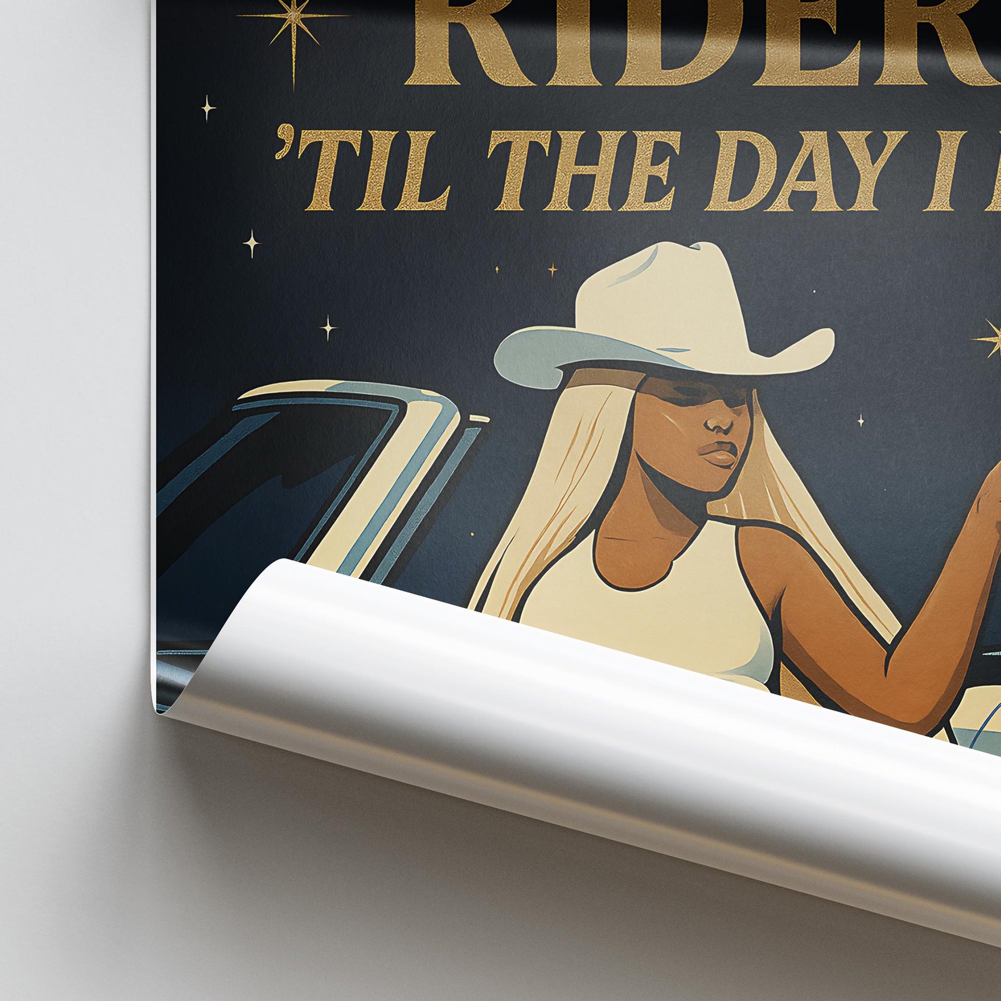 This bold and empowering art print is for the girls who know how to ride shotgun with style, sass, and loyalty. Featuring a fierce cowgirl in a classic western scene, the design is packed with retro Americana vibes and a timeless promise: “Ill be your shotgun rider ‘til the day I die.