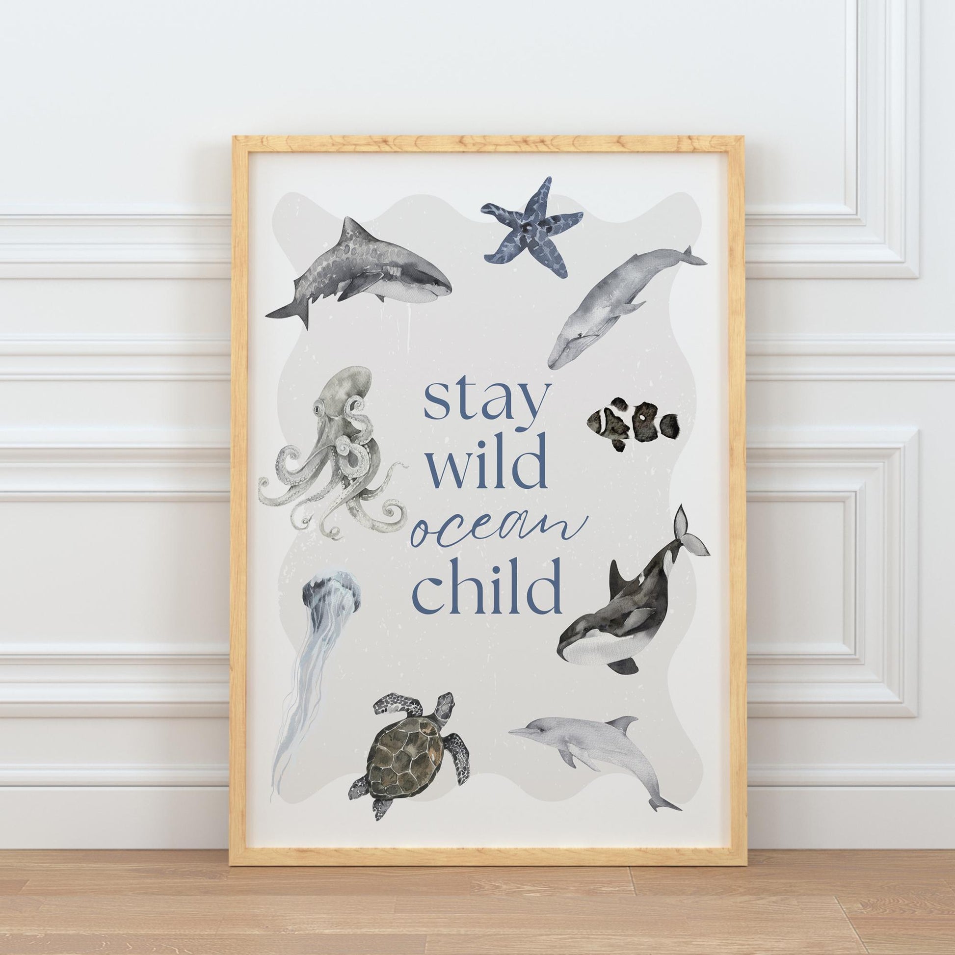 Celebrate the free-spirited ocean child in your life with this serene Stay Wild Ocean Child Poster. Featuring elegant watercolor illustrations of sea creatures like sharks, turtles, octopuses, and dolphins, this artwork is the perfect blend of inspiration and style.