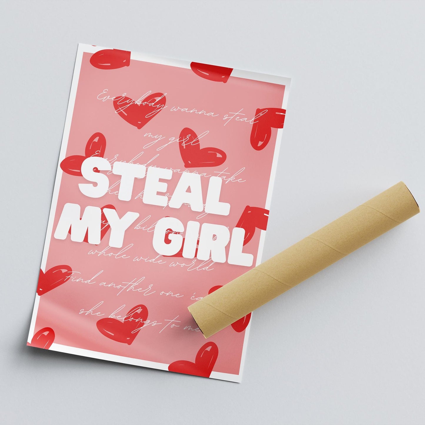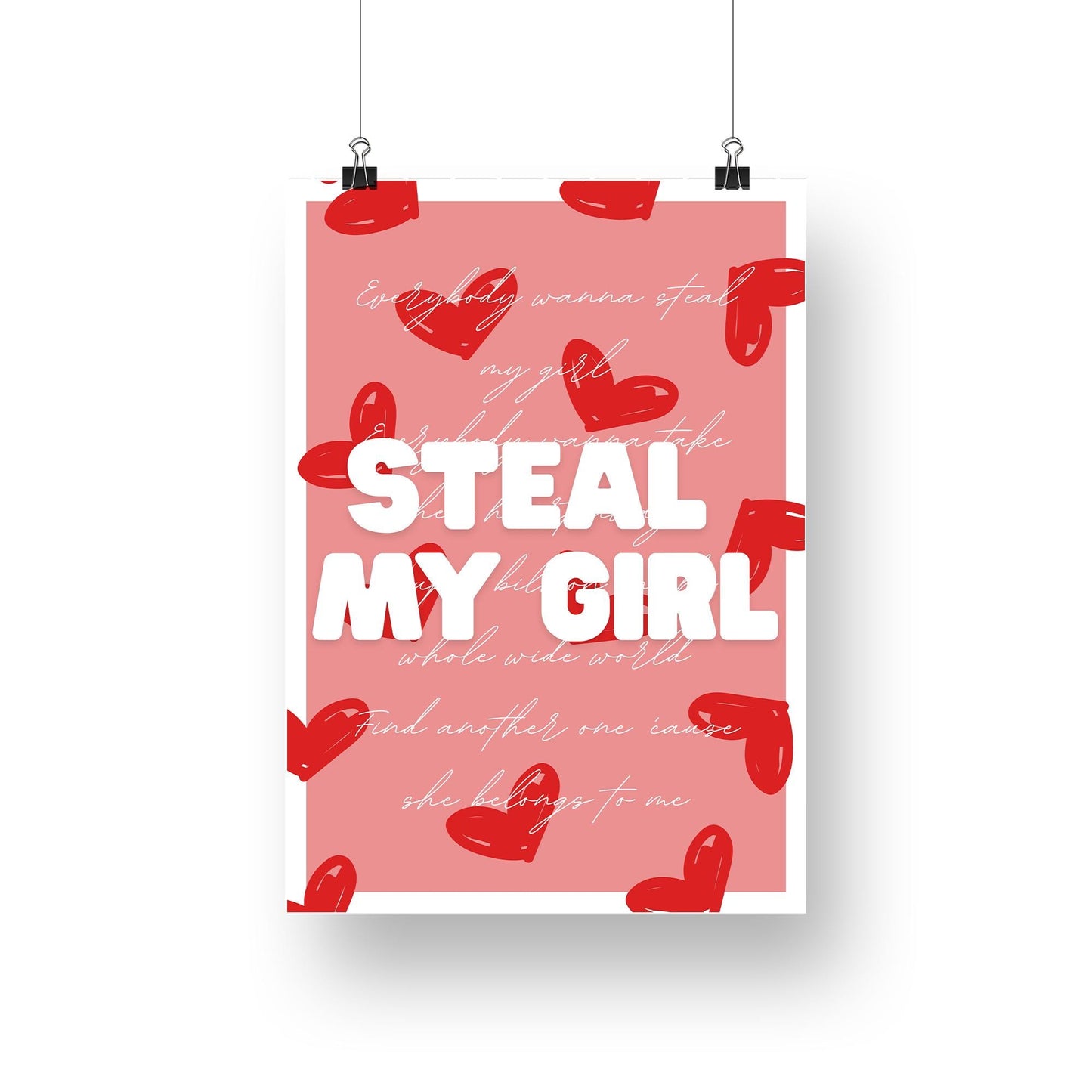 Celebrate the fun and upbeat vibes of One Direction with this "Steal My Girl" lyric poster! Featuring the memorable lyrics from one of their fan-favorite hits, this art print brings a lively and cheerful touch to any space. The design combines playful elements with a sleek and modern aesthetic, making it a standout piece for any Directioner. Whether you want to brighten up your bedroom, dorm room, or music-inspired gallery wall, this poster captures the infectious energy of the song that makes it so unforgettable.