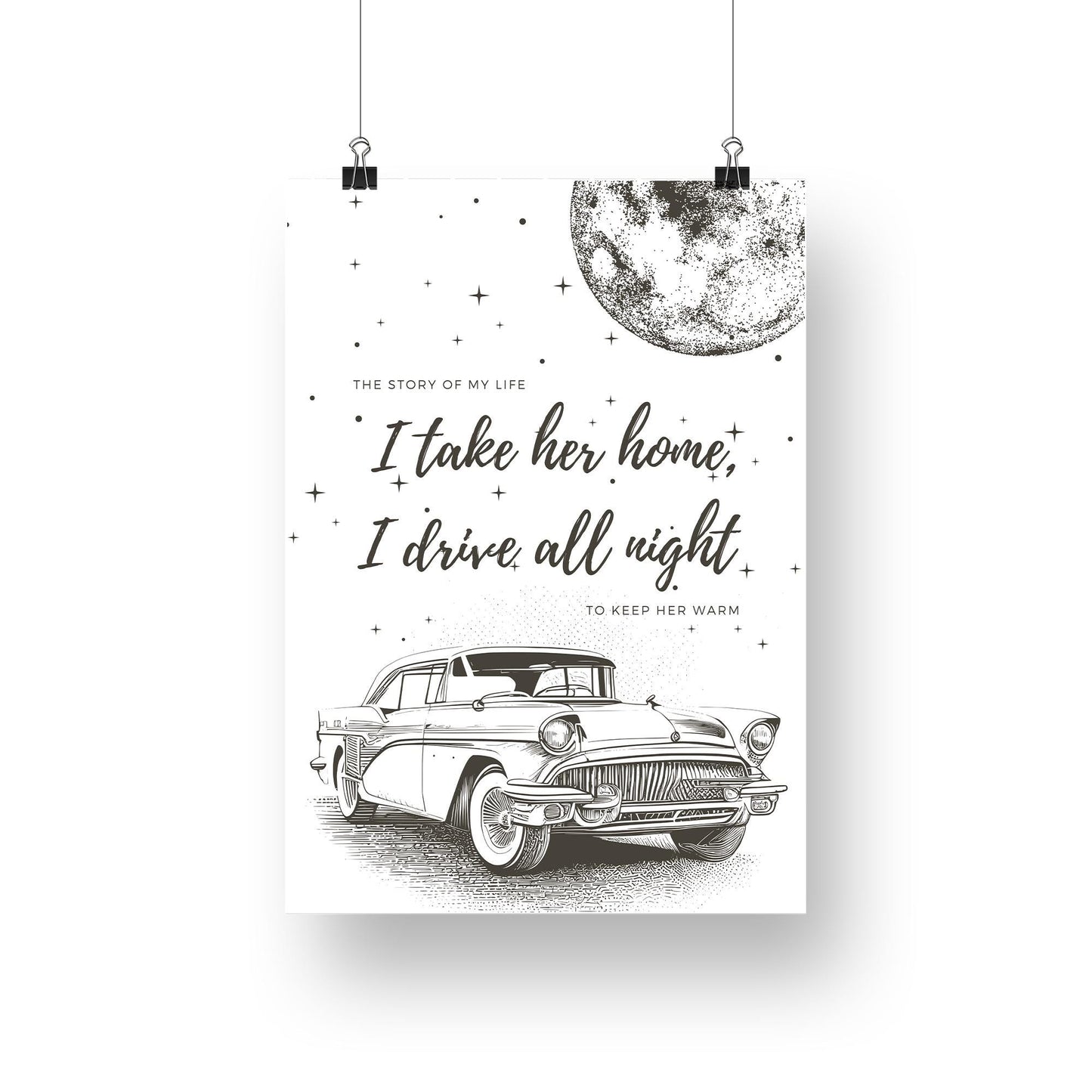 Capture the essence of one of One Direction‘s most iconic songs with this stunning "Story of My Life" poster. Perfect for any Directioner, this art print features the heartfelt lyrics that resonate with love, memories, and nostalgia. Designed with a modern and clean aesthetic, this poster is not just a piece of art but a reflection of a journey that touches every heart. Whether its for your bedroom, living room, or music-inspired gallery wall, this print is sure to add a special touch to your decor.