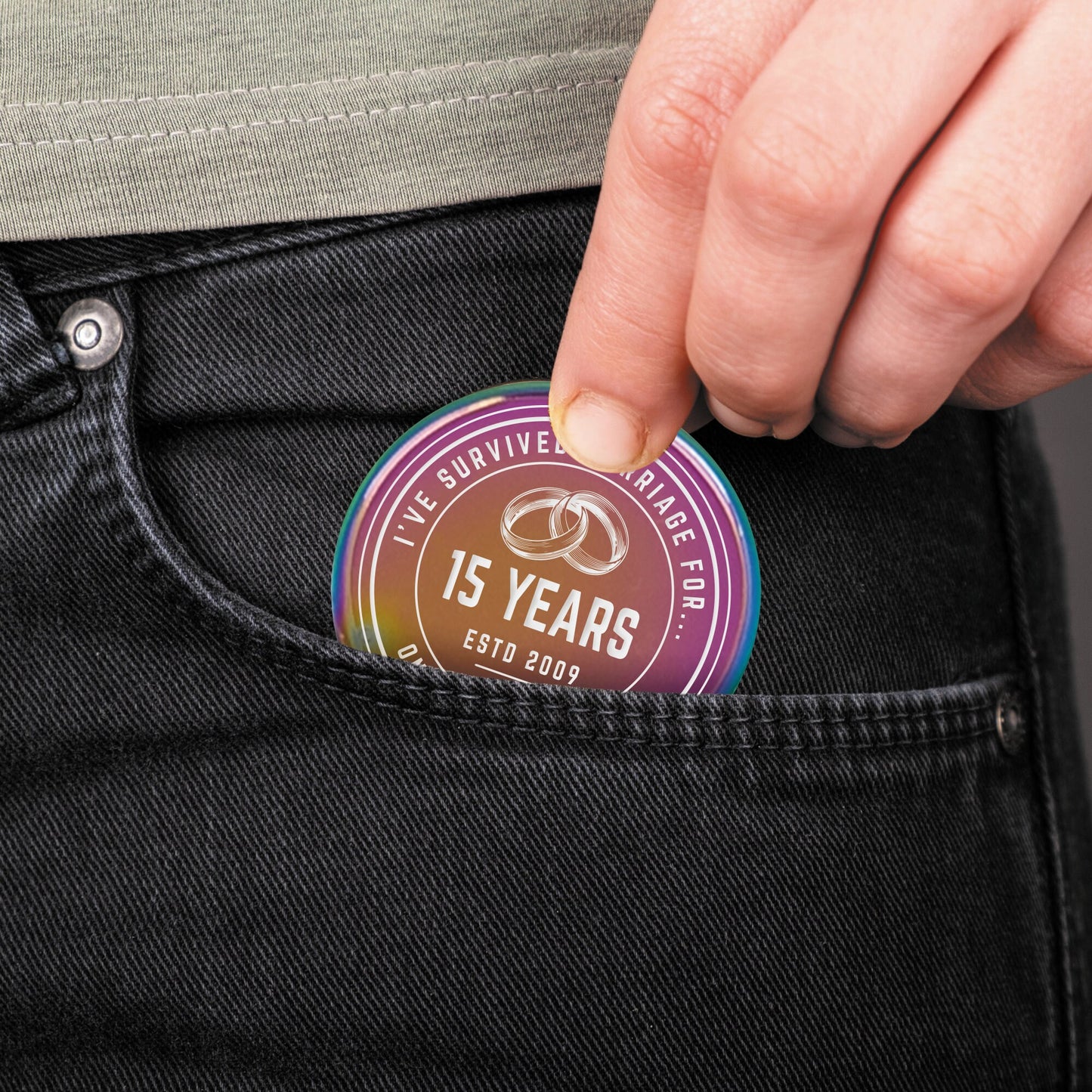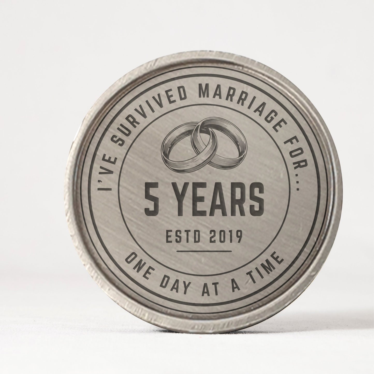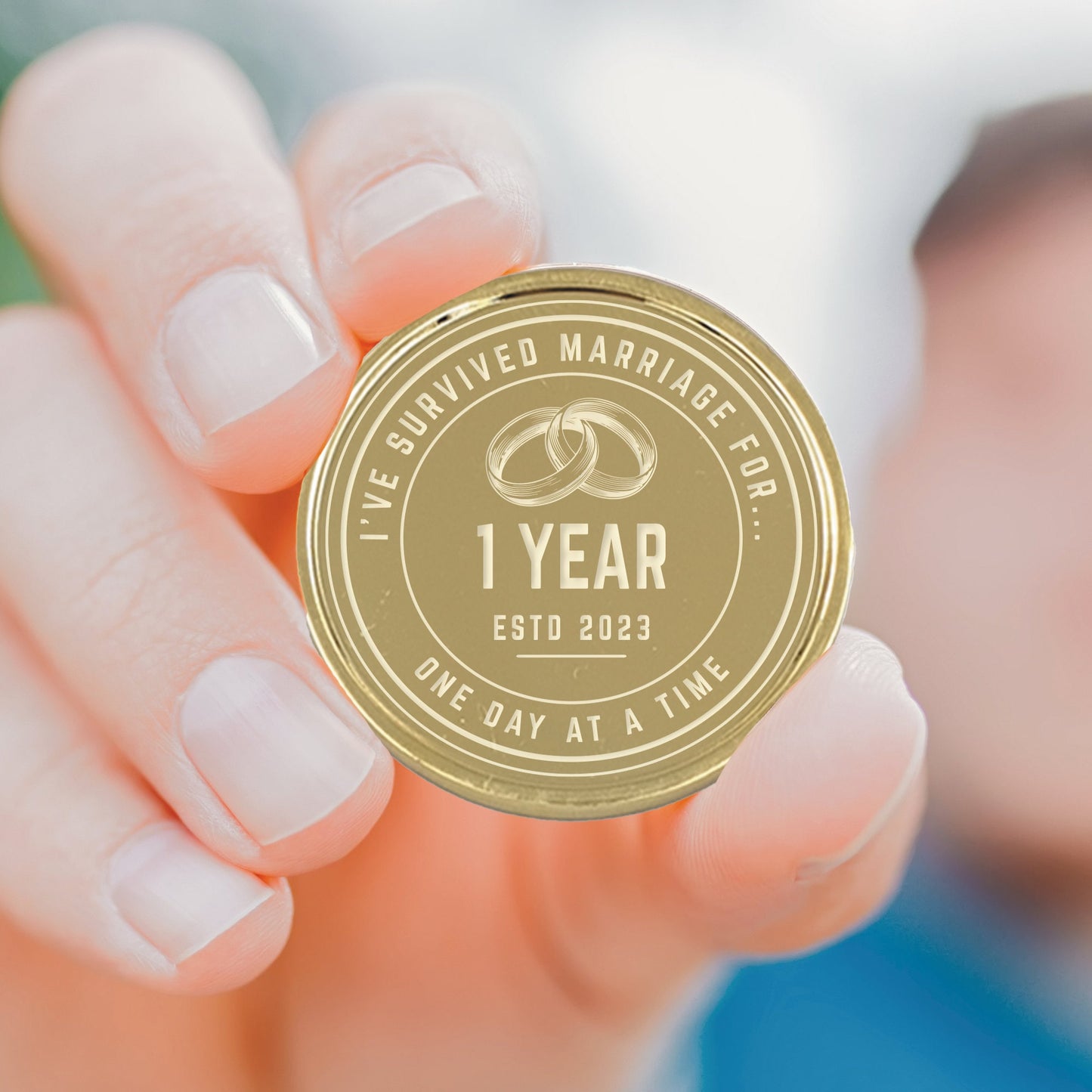 Personalise it with the number of years you‘ve conquered together and the establishment year. The coin reads, "I‘ve survived marriage for [number] years. Estd [year]. One day at a time."
