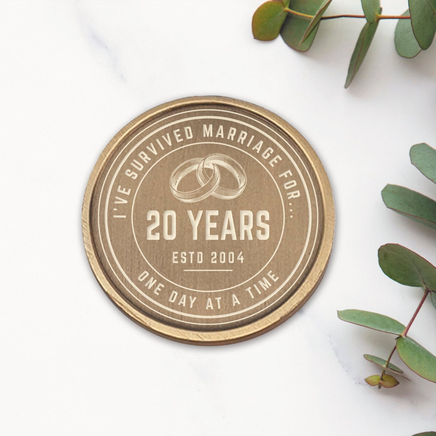 Celebrate the journey of love and humour with our engraved anniversary coin! This unique and funny gift is perfect for him, commemorating the years of surviving marriage.