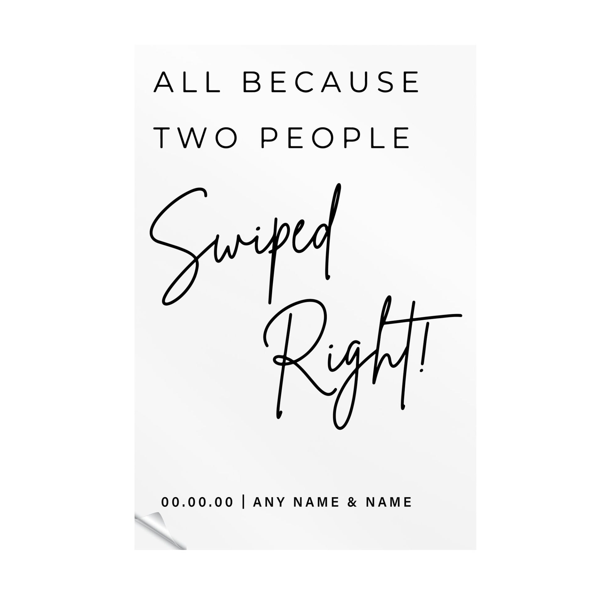Was your happy ever after found online? Celebrate your love story with our custom "All Because Two People Swiped Right" mirror/sign sticker, perfect for engagement parties, weddings, or anniversary celebrations. Personalise this elegant design with two names (up to 9 characters each) and a special date to create a unique and memorable decoration. Available in a variety of colours and sizes, this sticker will add a personal touch to any event.